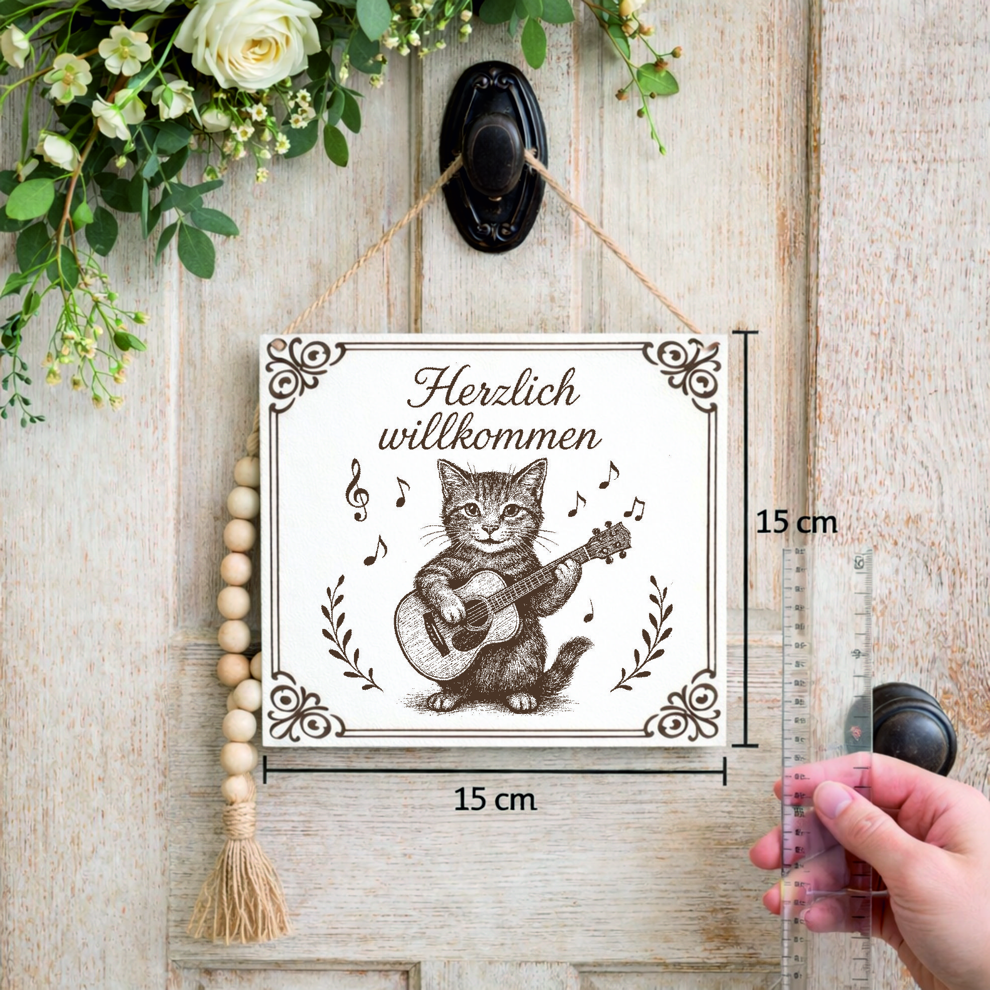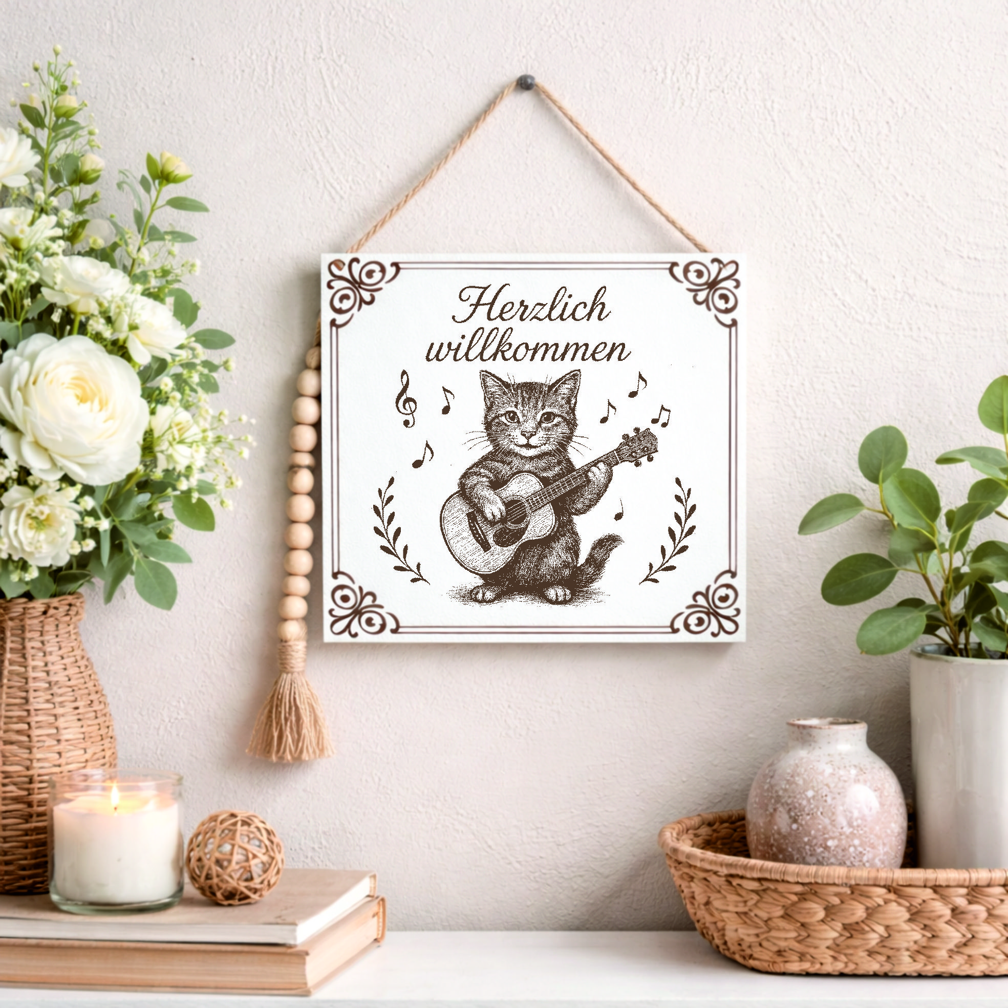 Dieses dekorative Willkommen Schild mit Katze ist perfekt für alle, die Tiere und Musik lieben.