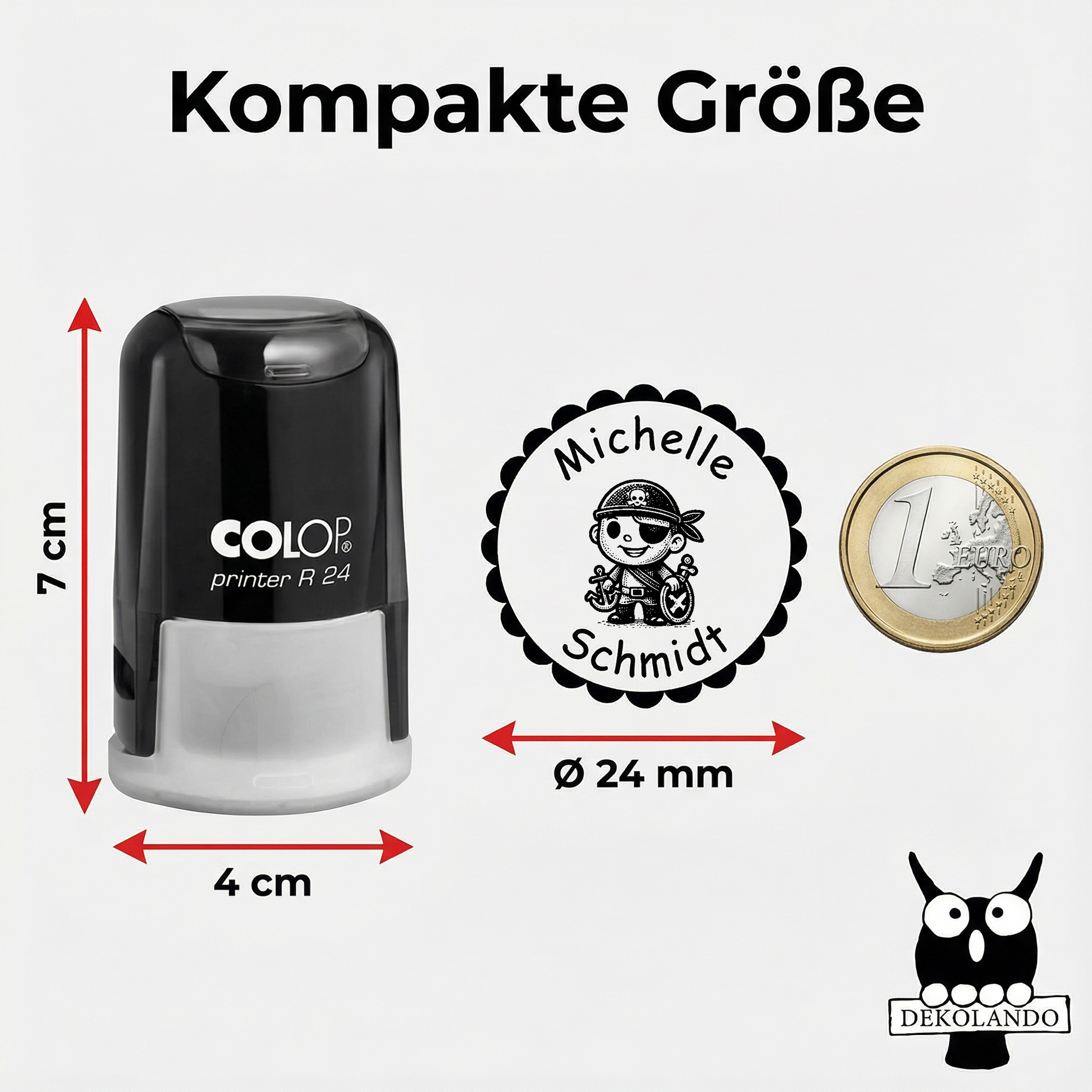 Als Basis dient der bewährte Colop Printer R24 mit integriertem schwarzem Stempelkissen. Der Kinderstempel überzeugt durch seine kompakte Größe, einfache Handhabung und langlebige Qualität. Mit einer Höhe von ca. 7 cm und einer Breite von ca. 4 cm passt er problemlos ins Federmäppchen oder in den Schulranzen.