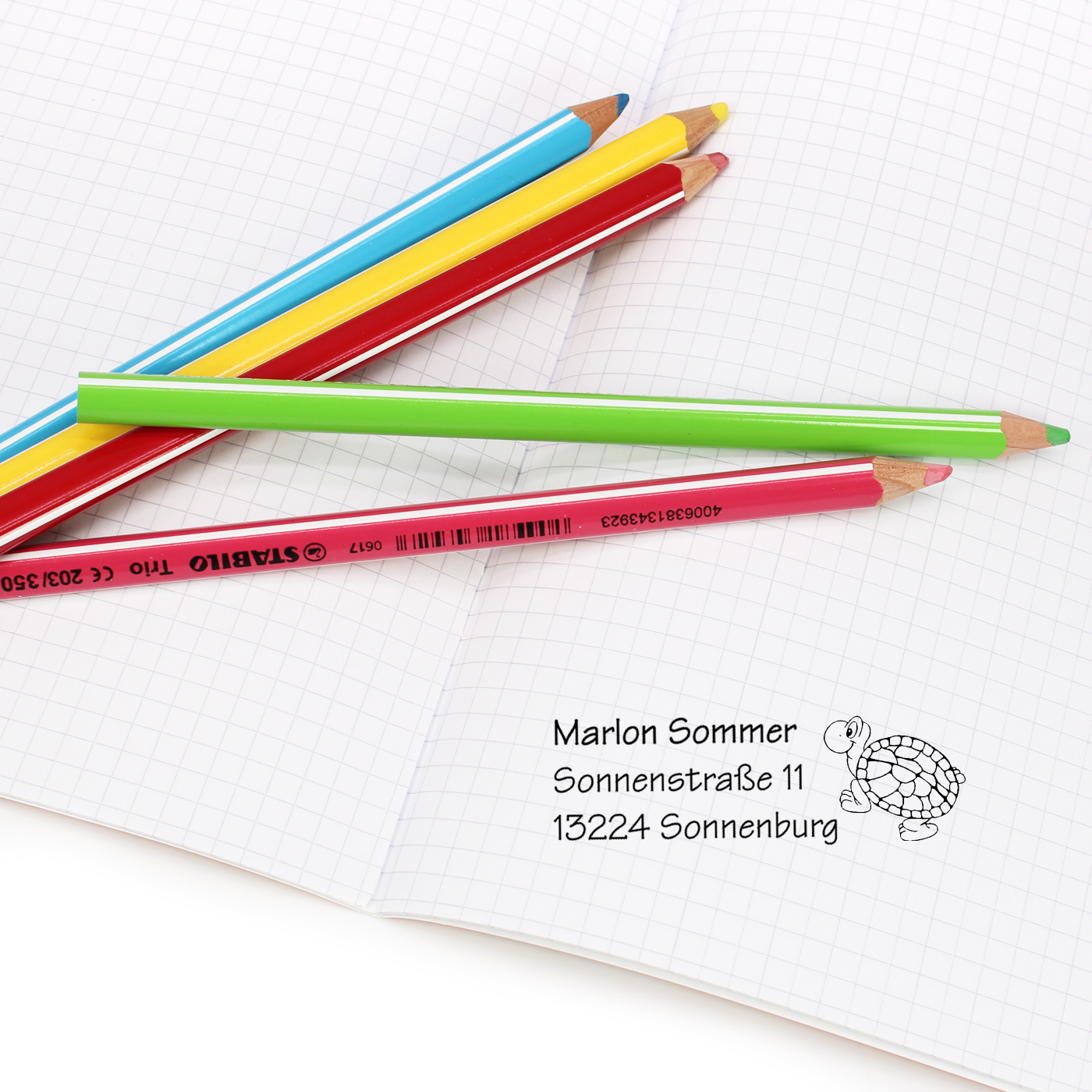 PERSONALISIERTER STEMPEL: Dieser liebevoll gestaltete Automatikstempel mit Motiv ermöglicht es, Name und Adresse Ihres Kindes individuell anzupassen. Ideal für den Einsatz auf Schulmaterialien, Büchern, Hausaufgabenheft, Notizblock, Hefter und anderen persönlichen Gegenständen.