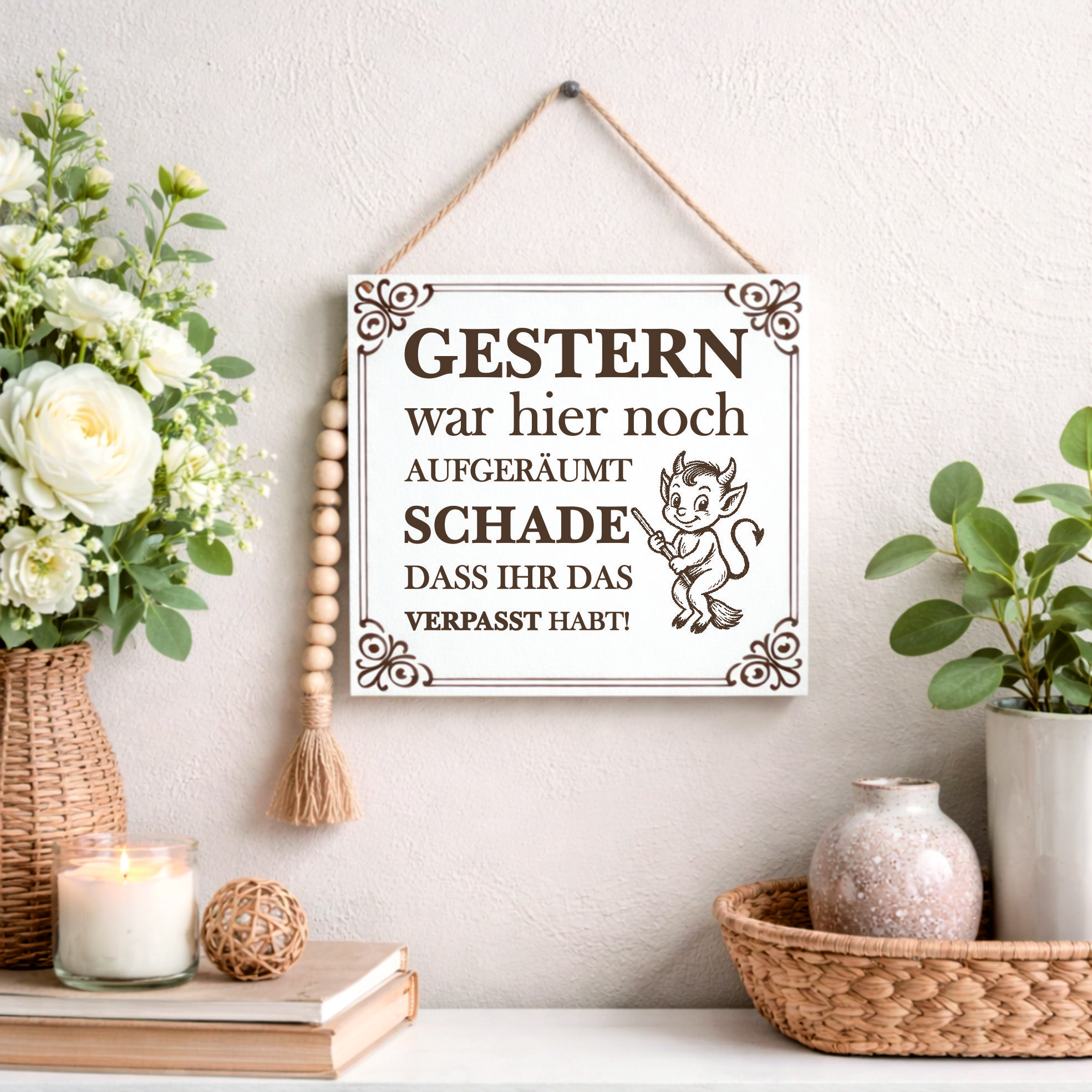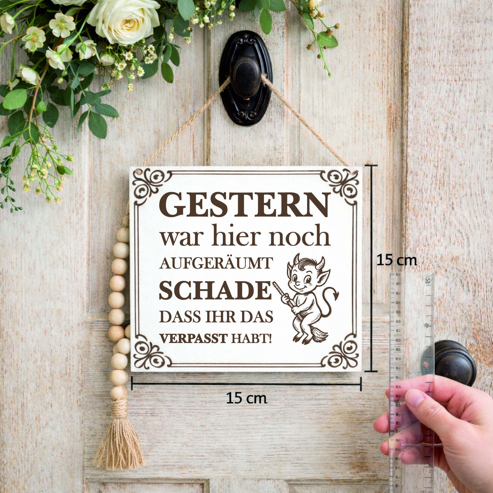Gefertigt aus stabilem HDF und veredelt mit einer präzisen braunen Lasergravur, überzeugt das Schild durch seine hochwertige Verarbeitung und langlebige Qualität. Das Vintage-Design sorgt für eine stilvolle Optik mit humorvoller Aussage.