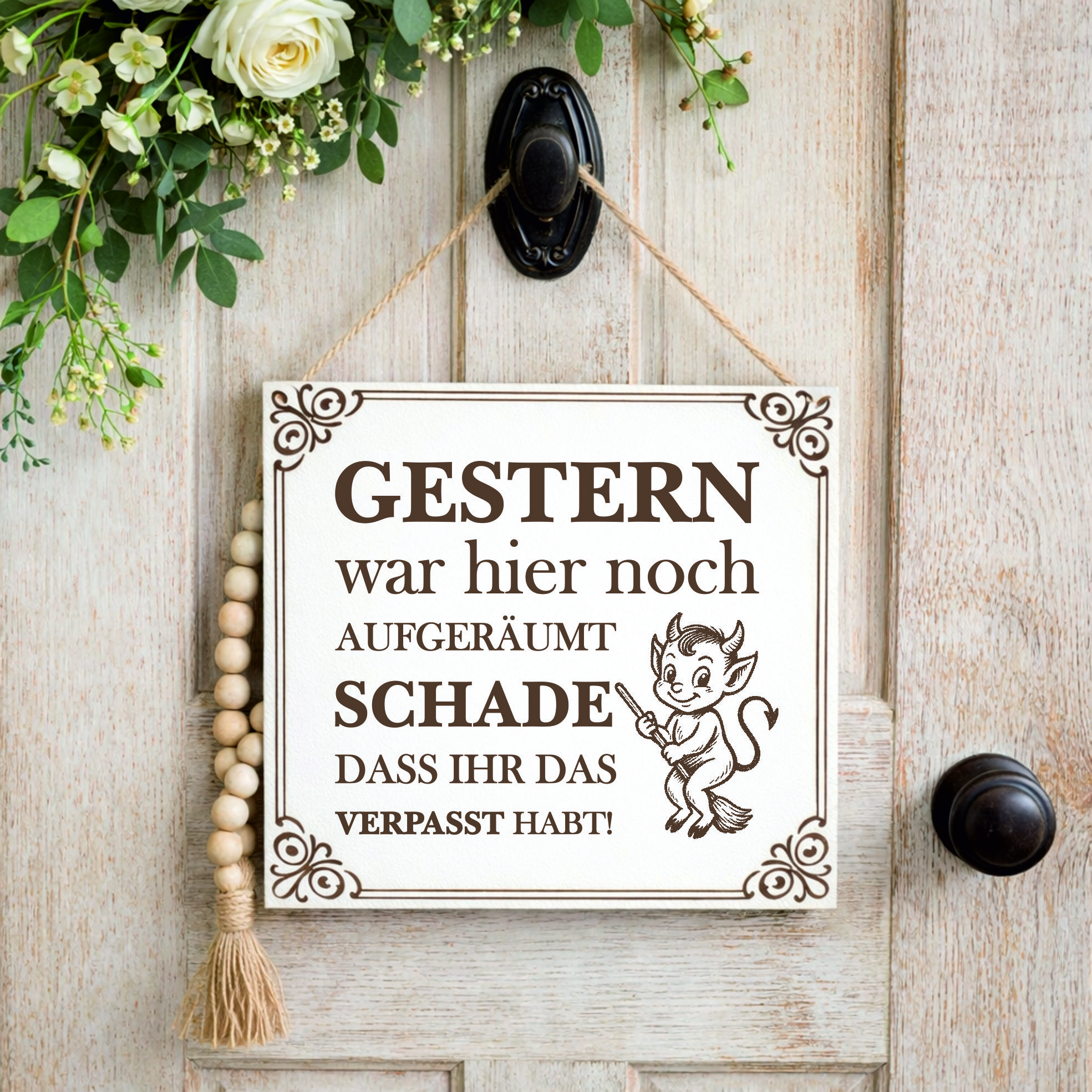 Der witzige Spruch macht dieses Schild zu einer perfekten Geschenkidee für Freunde, Familie oder zum Einzug.