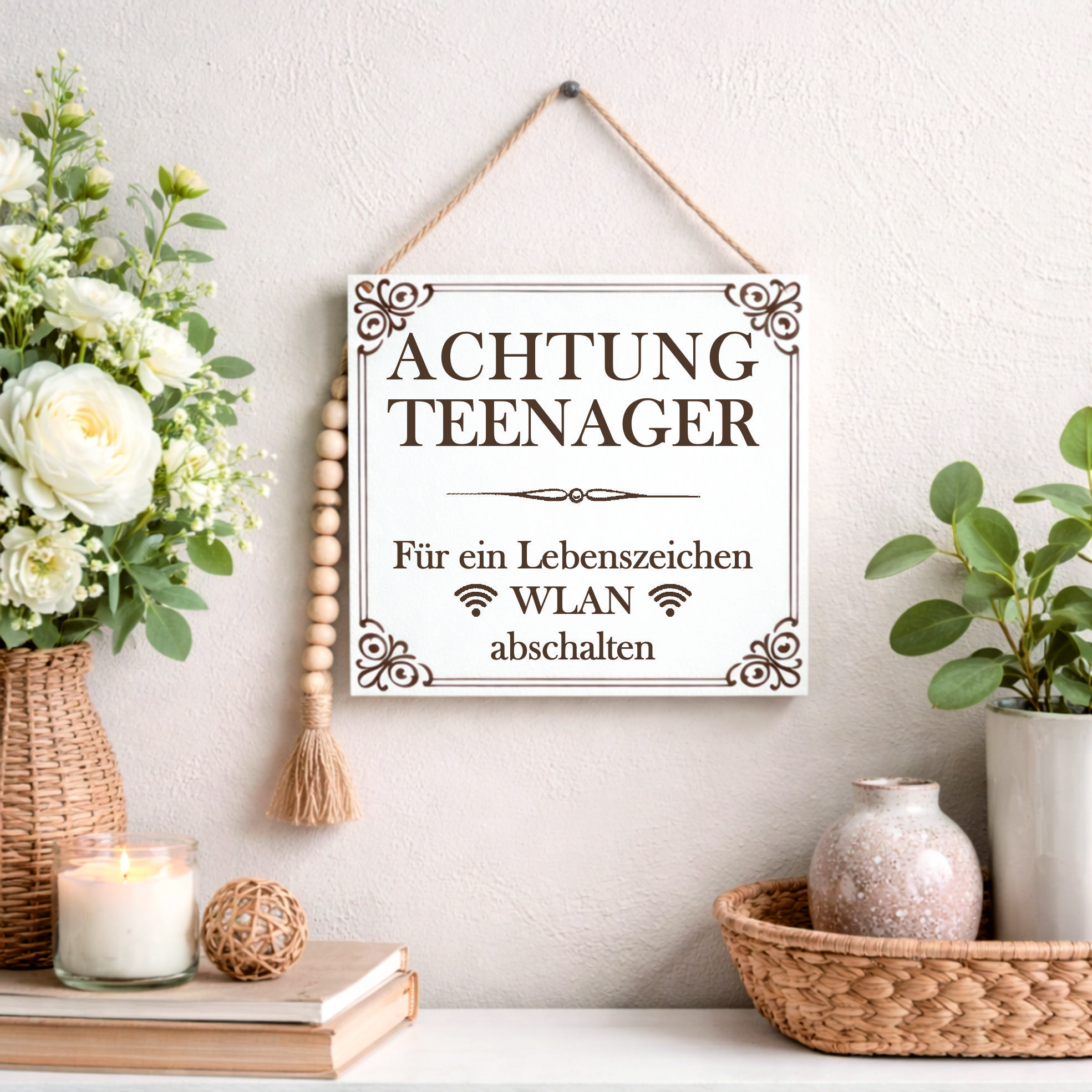 Der witzige Spruch rund um Teenager und WLAN macht dieses Schild zu einer perfekten Geschenkidee für Eltern und Familien.