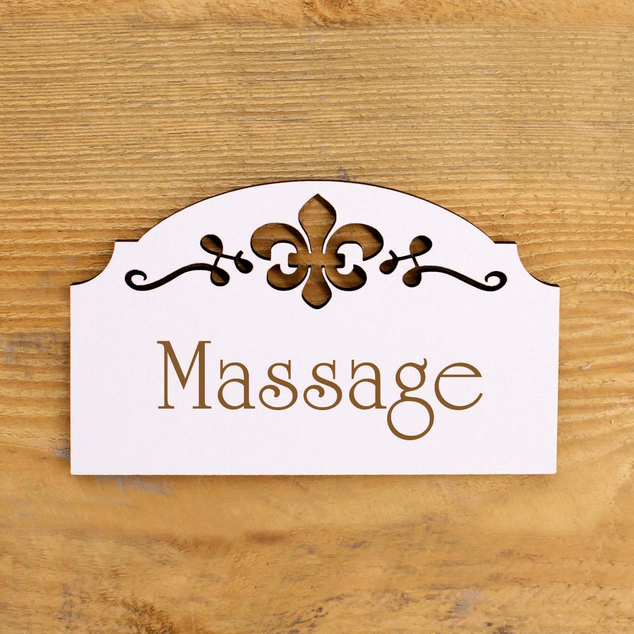 Sie sind auf der Suche nach einer Deko Idee für Ihre Türen im Haus oder einer Orientierungshilfe bzw. Hinweisschildern im Hotel oder der Firma? Unser selbstklebendes „Massage“ Türschild mit Ornamenten ist dafür eine ideale Lösung. Unsere gravierten Vintage Türschilder aus Holz mit Schriftzug eignen sich ebenso als Wand Deko oder Zimmer Deko.