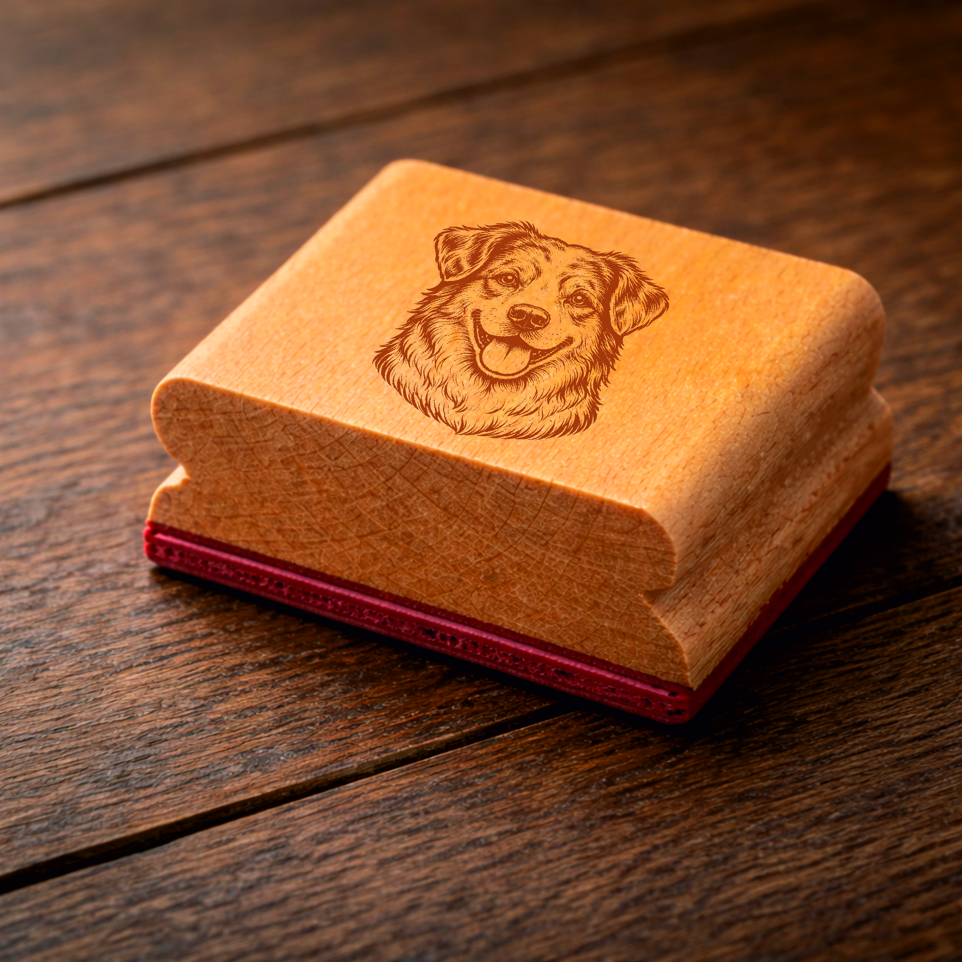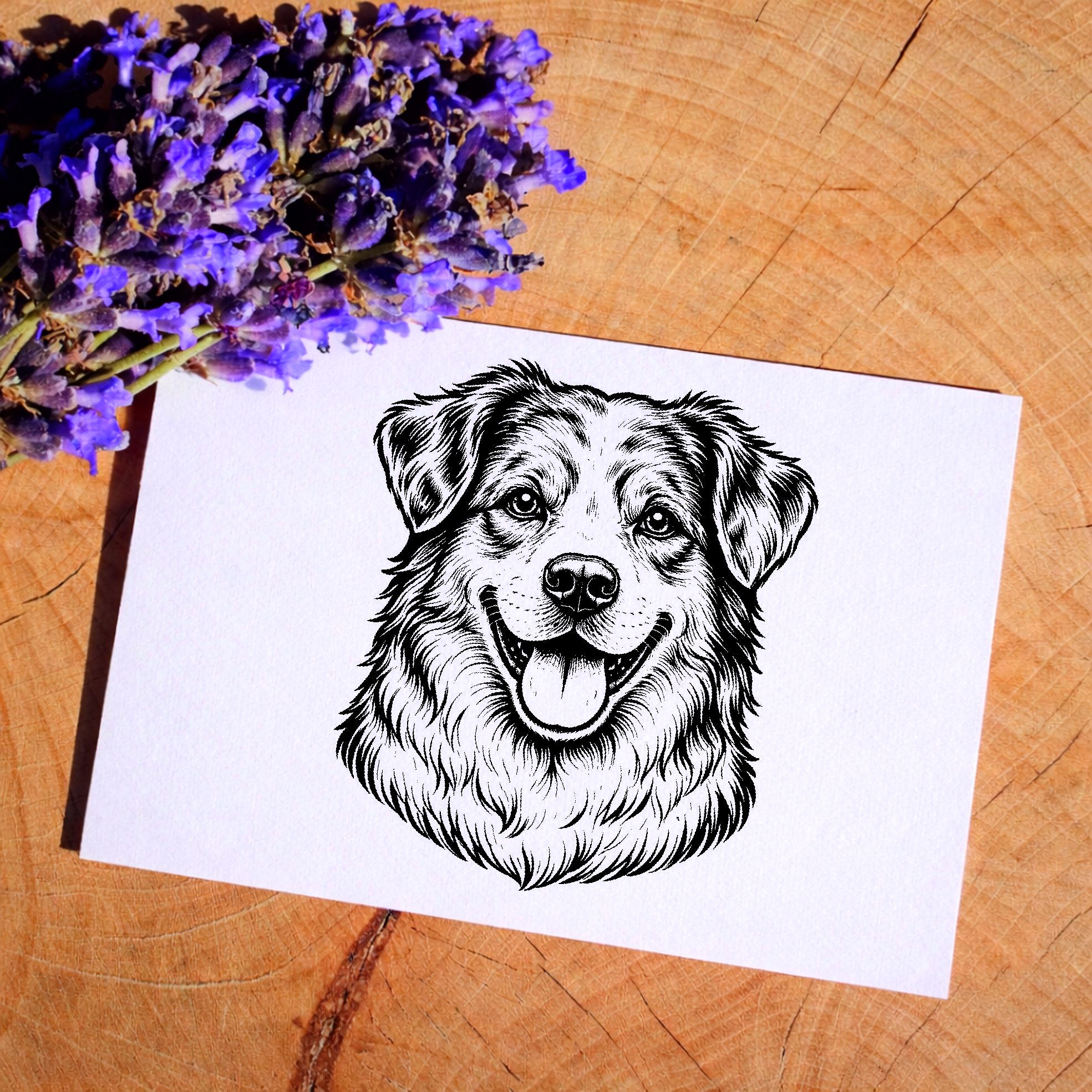 Das detailreiche Hundemotiv wird präzise per Lasergravur auf eine langlebige Gummistempelplatte übertragen und sorgt für saubere, klare Abdrucke auf Papier, Karten oder Verpackungen.