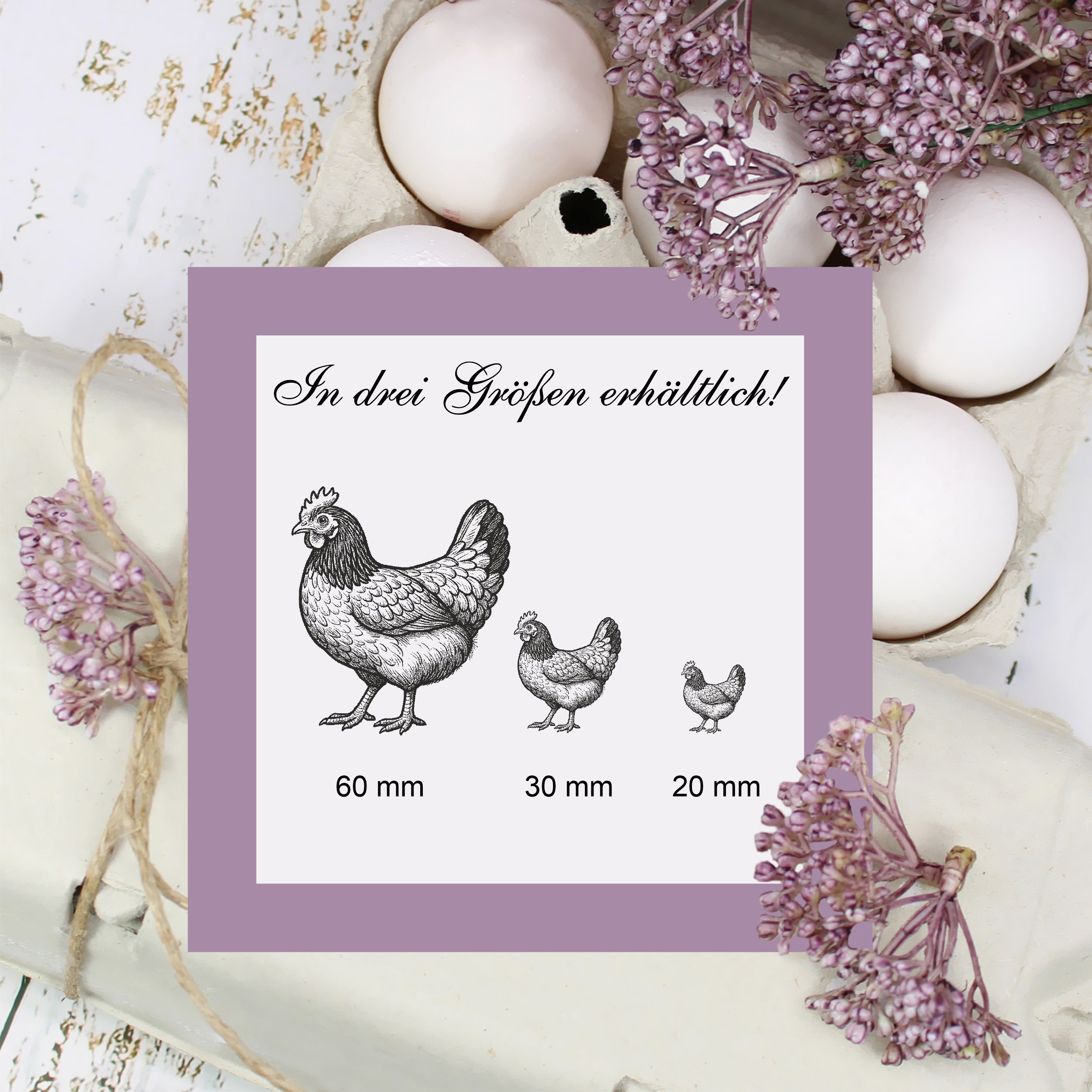 Unser Holzstempel mit Hühnermotiv verbindet detailreiche Motive mit langlebiger Qualität. Wählen Sie aus verschiedenen Hühnermotiven – darunter traditionelle Landhuhn-Arten wie Sperber oder Augsburger – in 3 praktischen Größen (Ø 20 mm, 30 mm, 60 mm), perfekt abgestimmt für kleine, mittlere und große Kreativarbeiten.