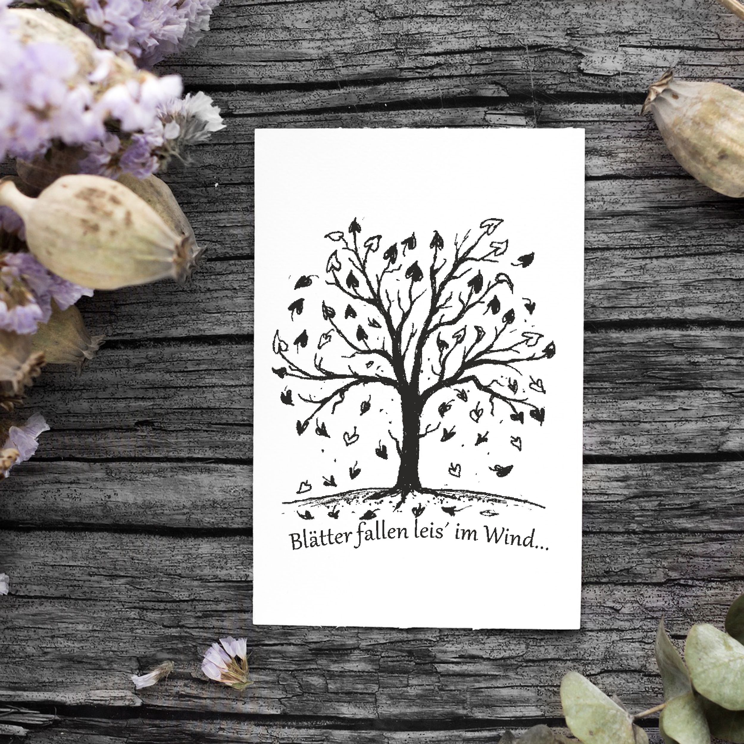 Motivstempel Baum Blätter fallen leis im Wind - Herbst Stempel Holzstempel 58 x 68 mm