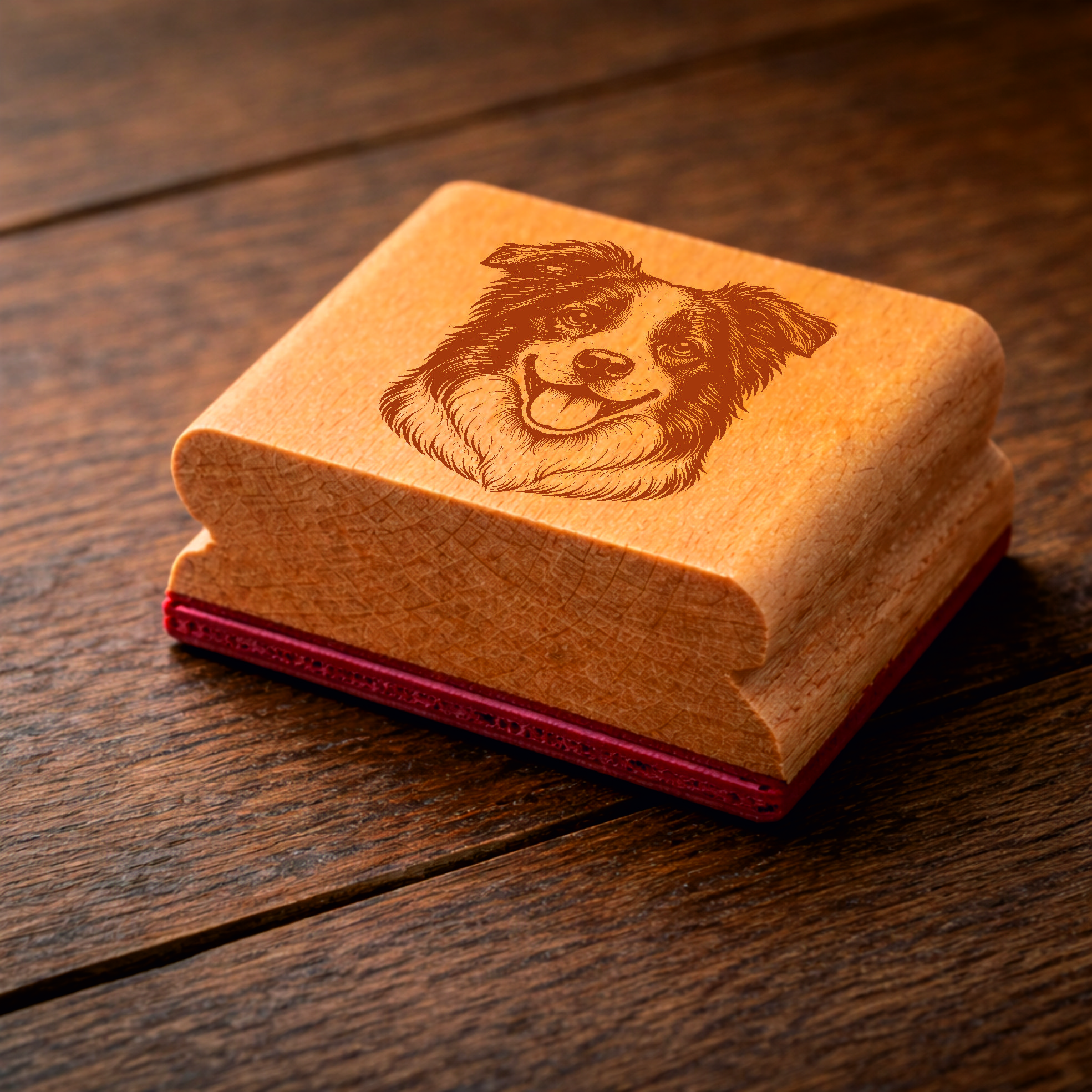 Das detailreiche Hundemotiv wird präzise per Lasergravur auf eine langlebige Gummistempelplatte übertragen und sorgt für saubere, klare Abdrucke auf Papier, Karten oder Verpackungen.
