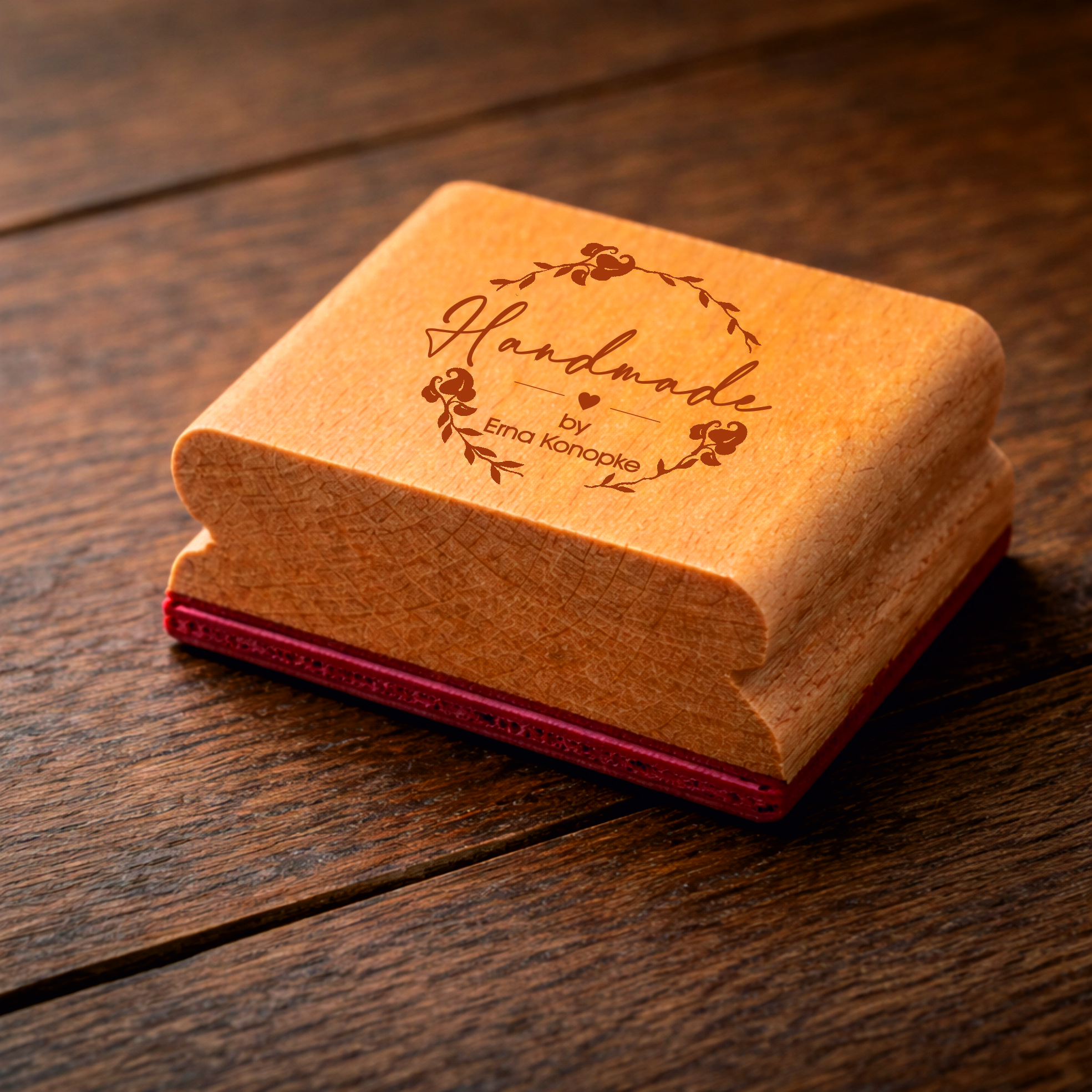 Sie erwerben einen schönen Holzstempel mit abgebildetem Vintage Kranz Motiv und Wunschnamen.