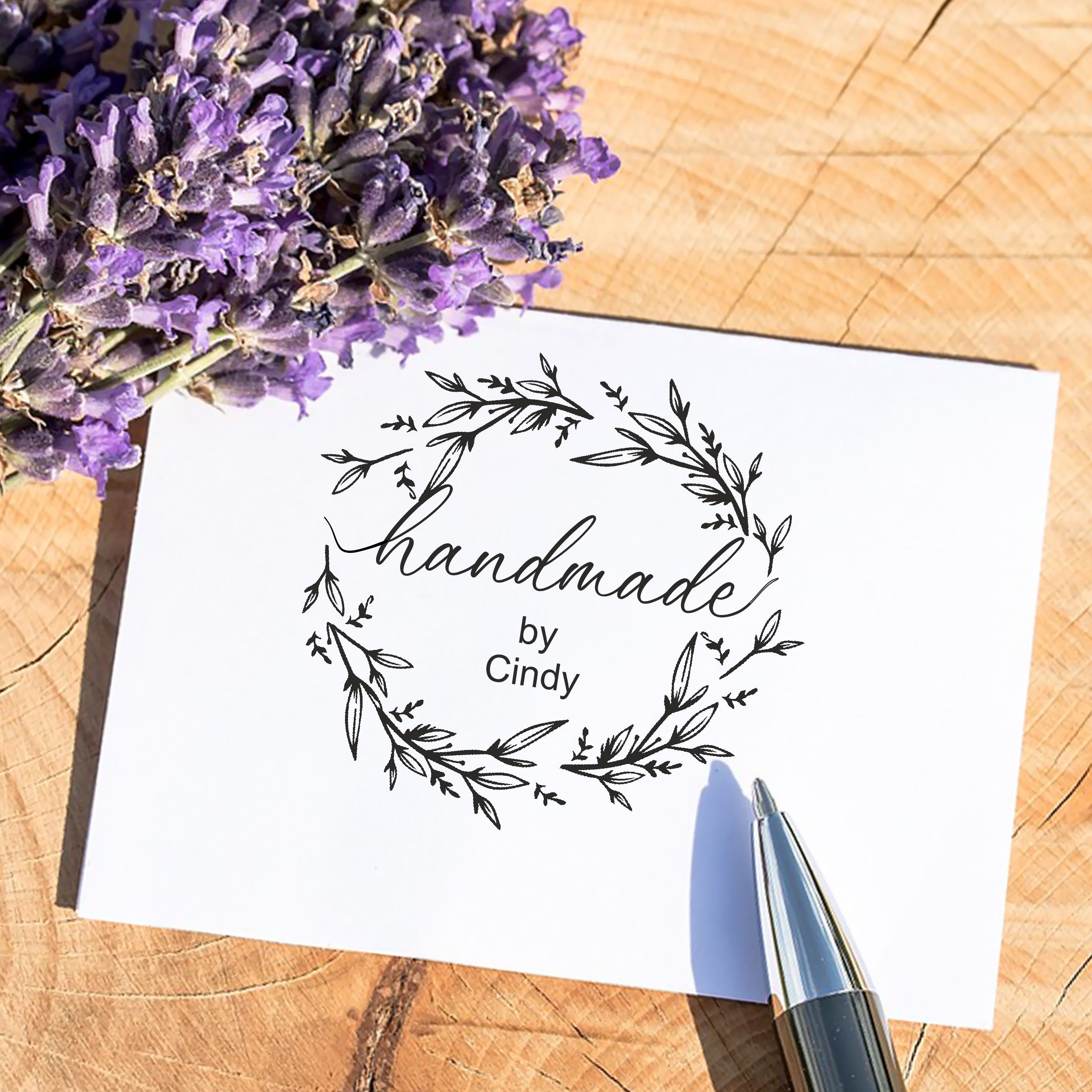 HOCHWERTIGER MOTIVSTEMPEL: Sie erwerben einen Stempel aus lackiertem Buchenholz mit einer präzise gravierten Gummistempelplatte für klare detailreiche Abdrücke. Auf der Gravur des Stempels ist ein Kranz abgebildet mit dem Text ‚Handmade by‘.