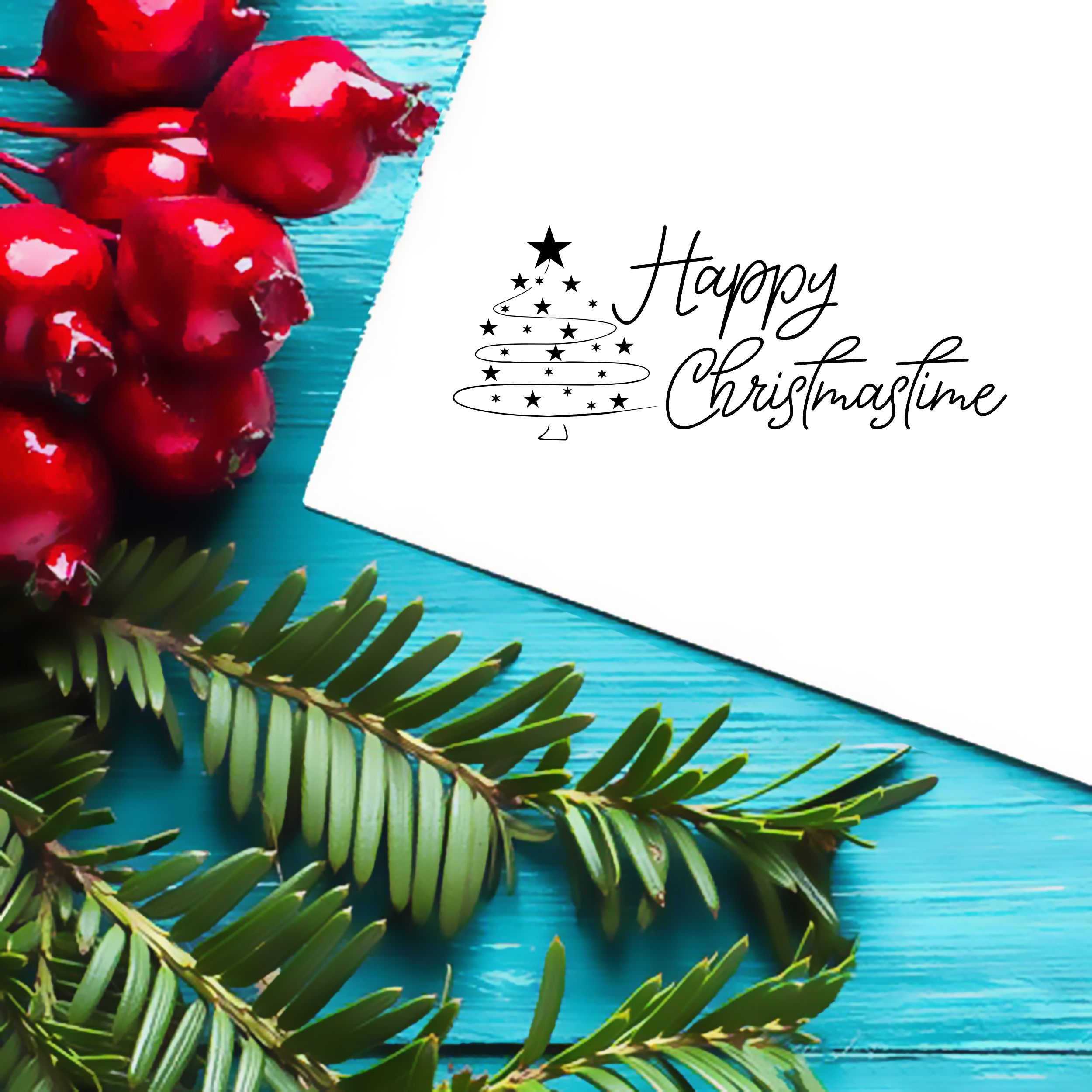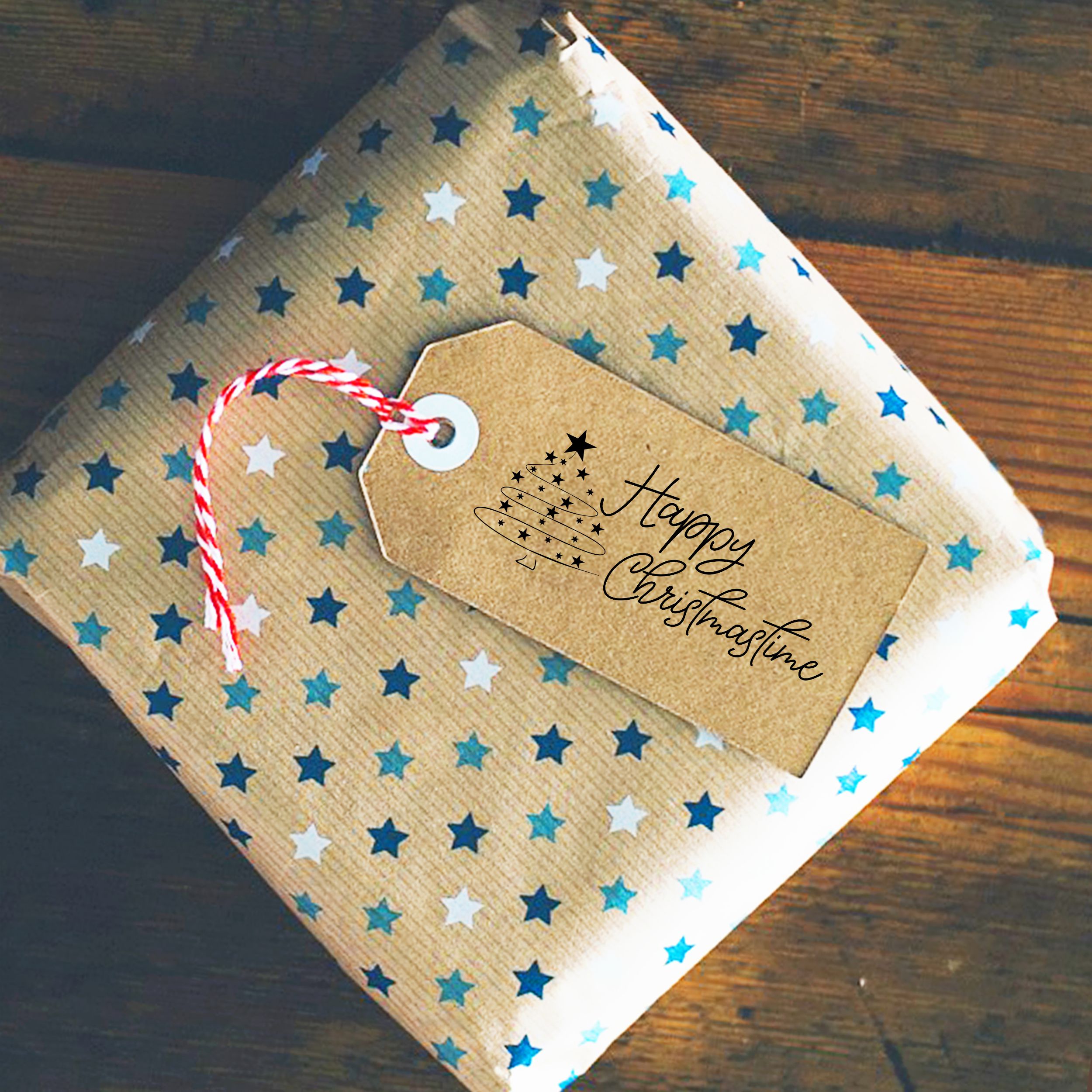 Motivstempel Happy Christmastime - Weihnachtsstempel Stempel Tannenbaum Holzstempel 98 mm x 38 mm