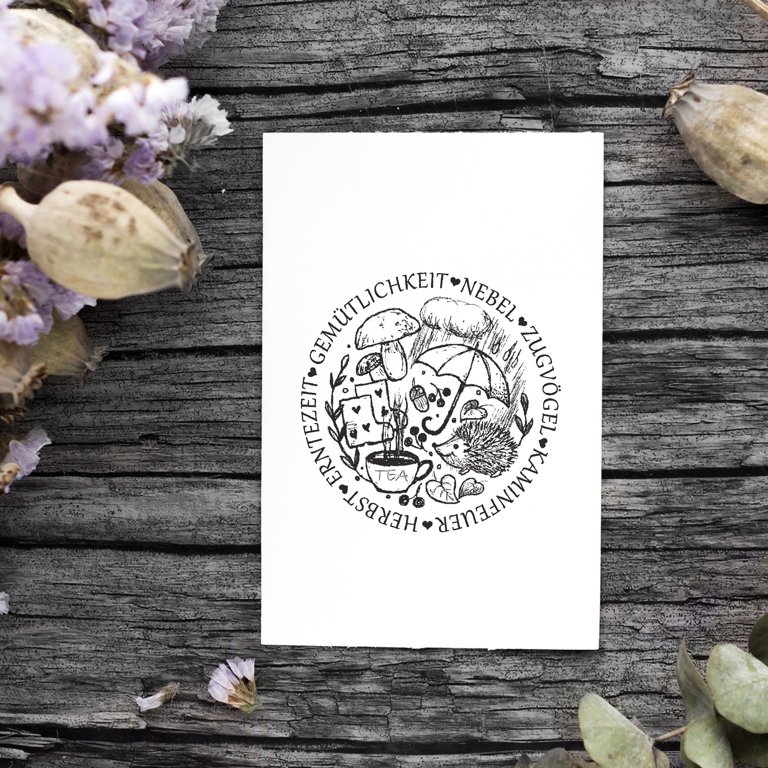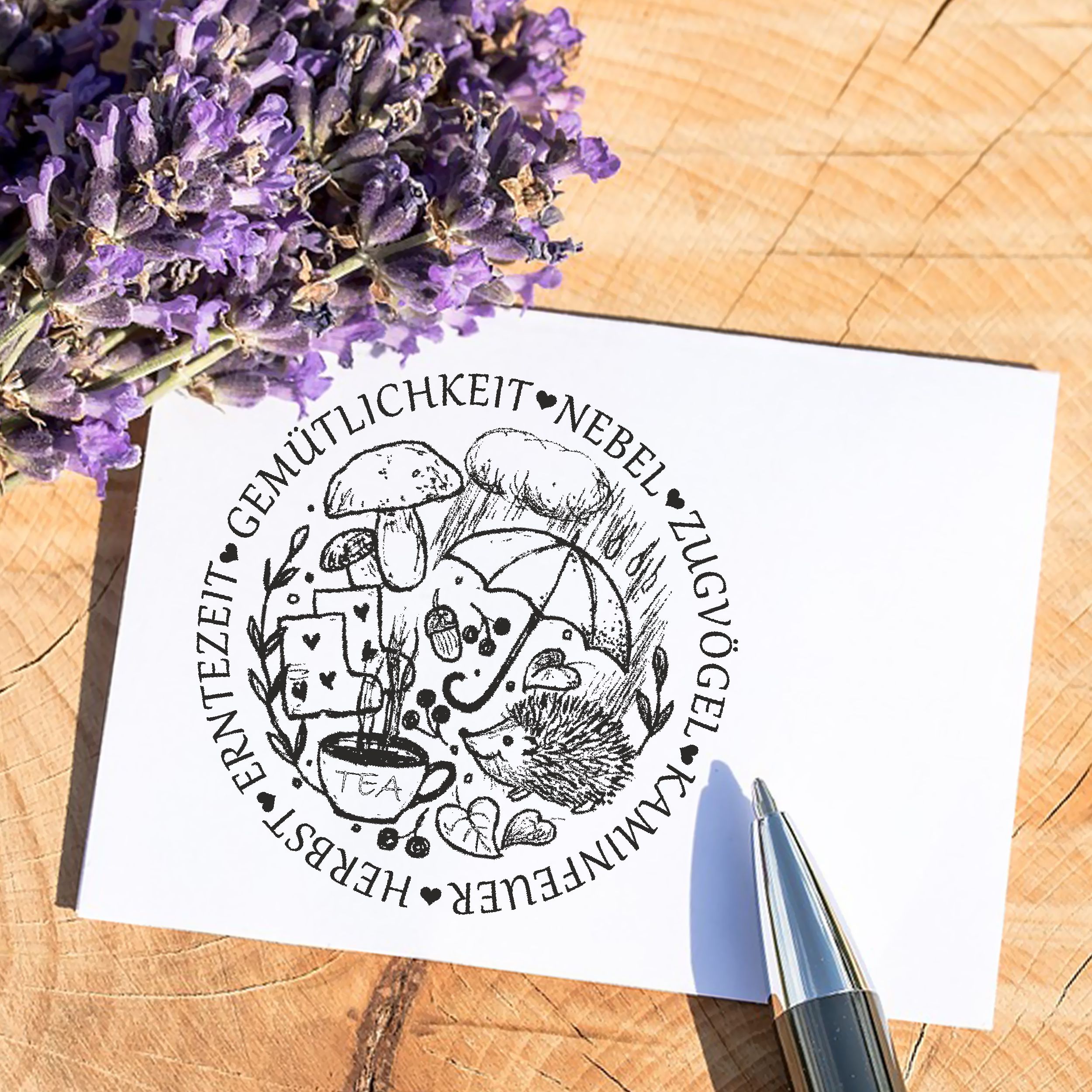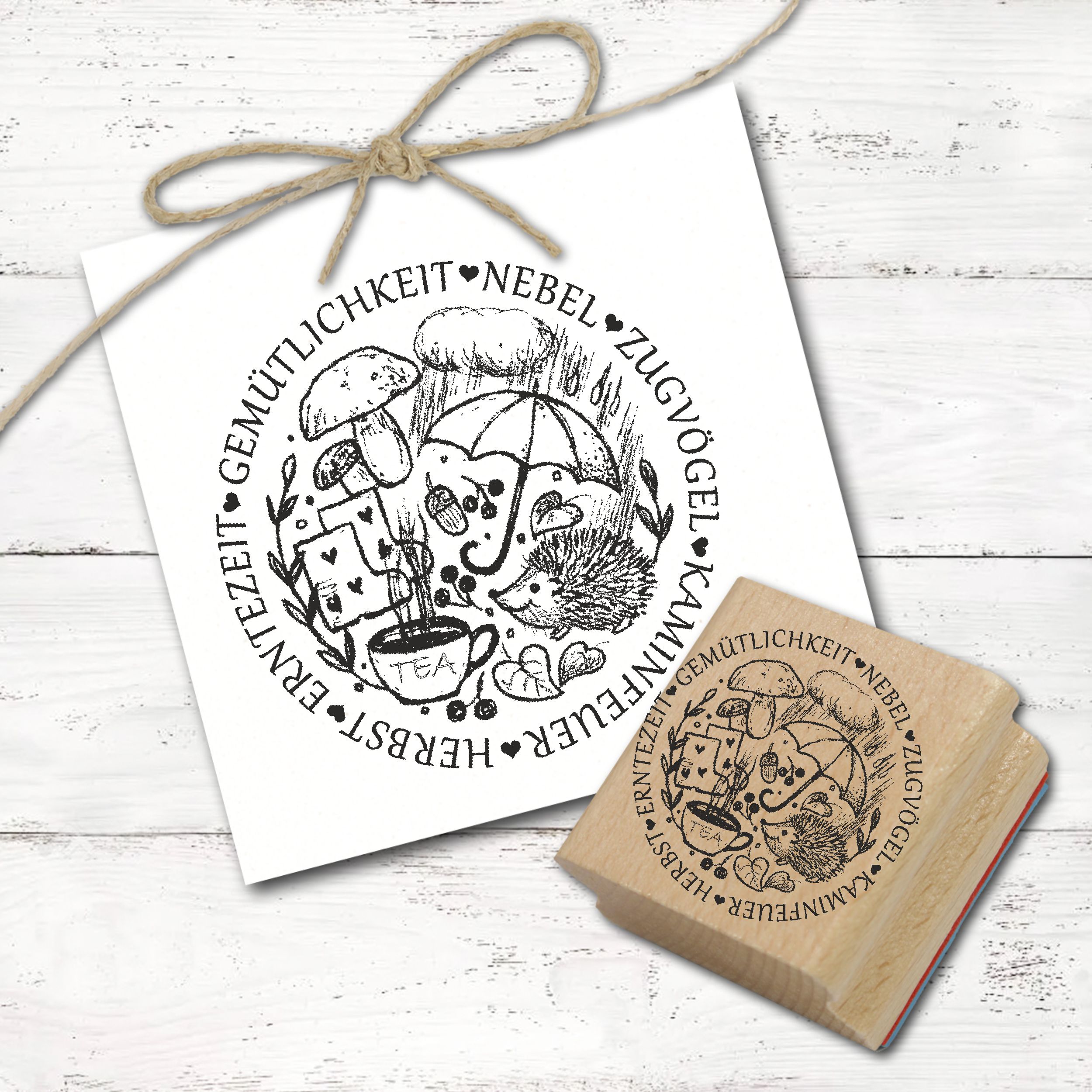 Motivstempel Herbst Herbstmotive - Igel Gemütlichkeit Nebel Ernte Eichel Tee - Stempel Holzstempel Ø 68 mm