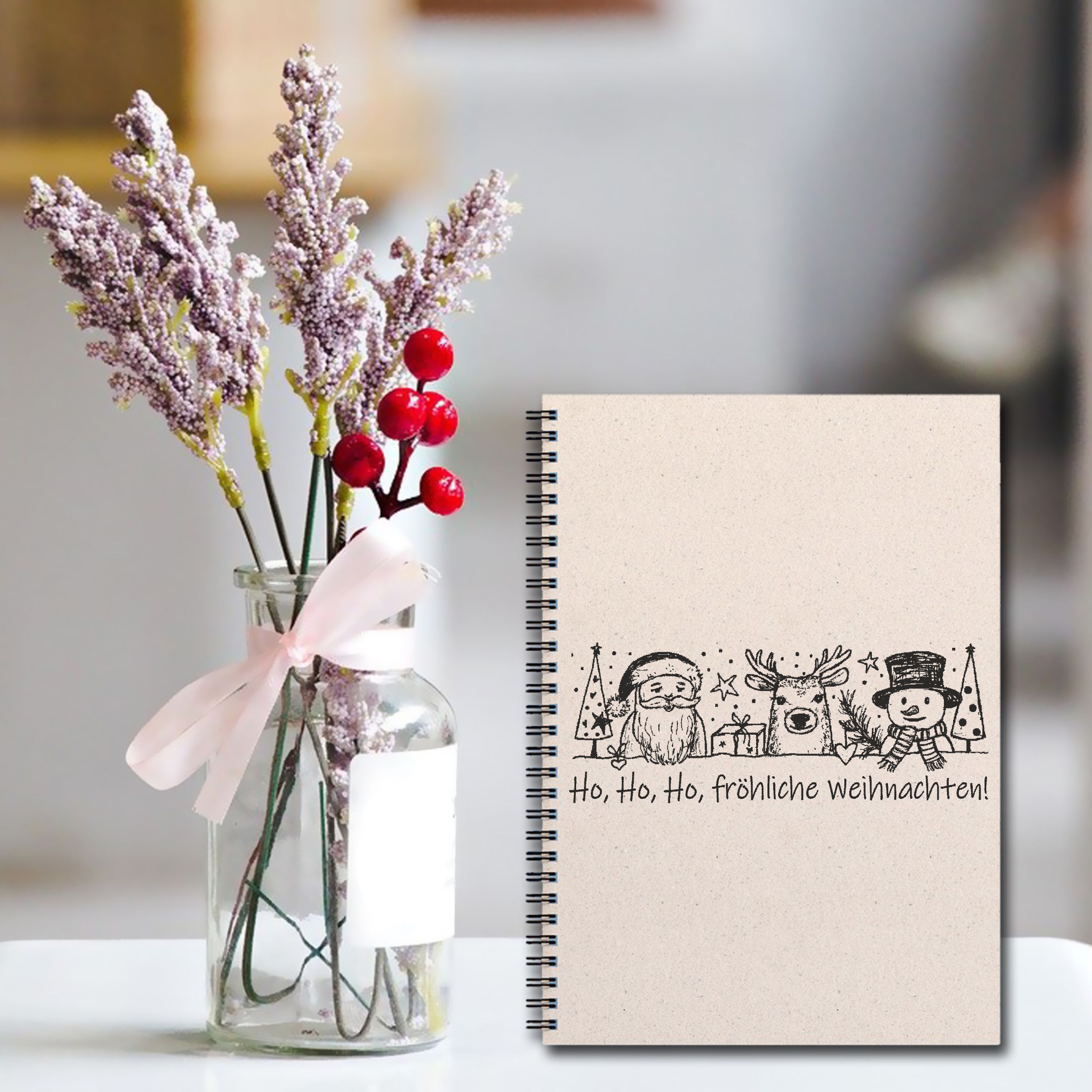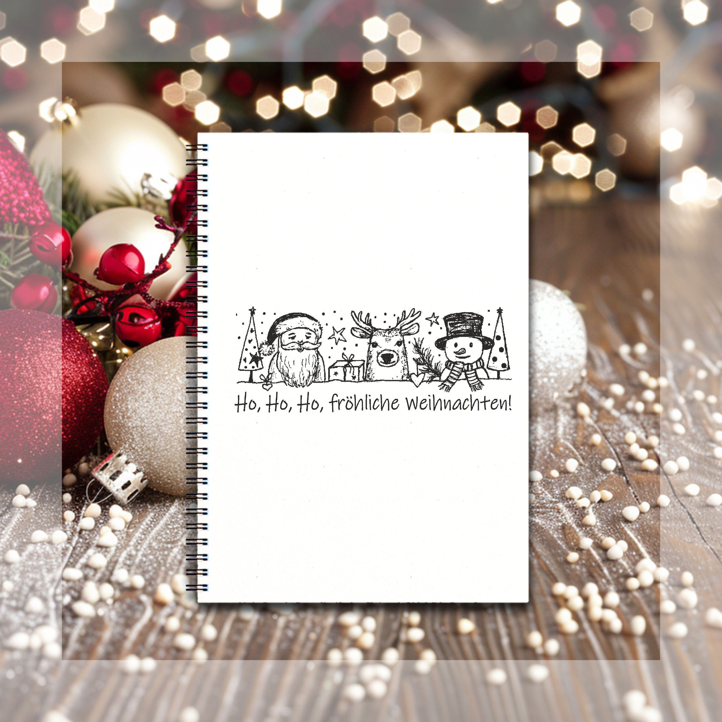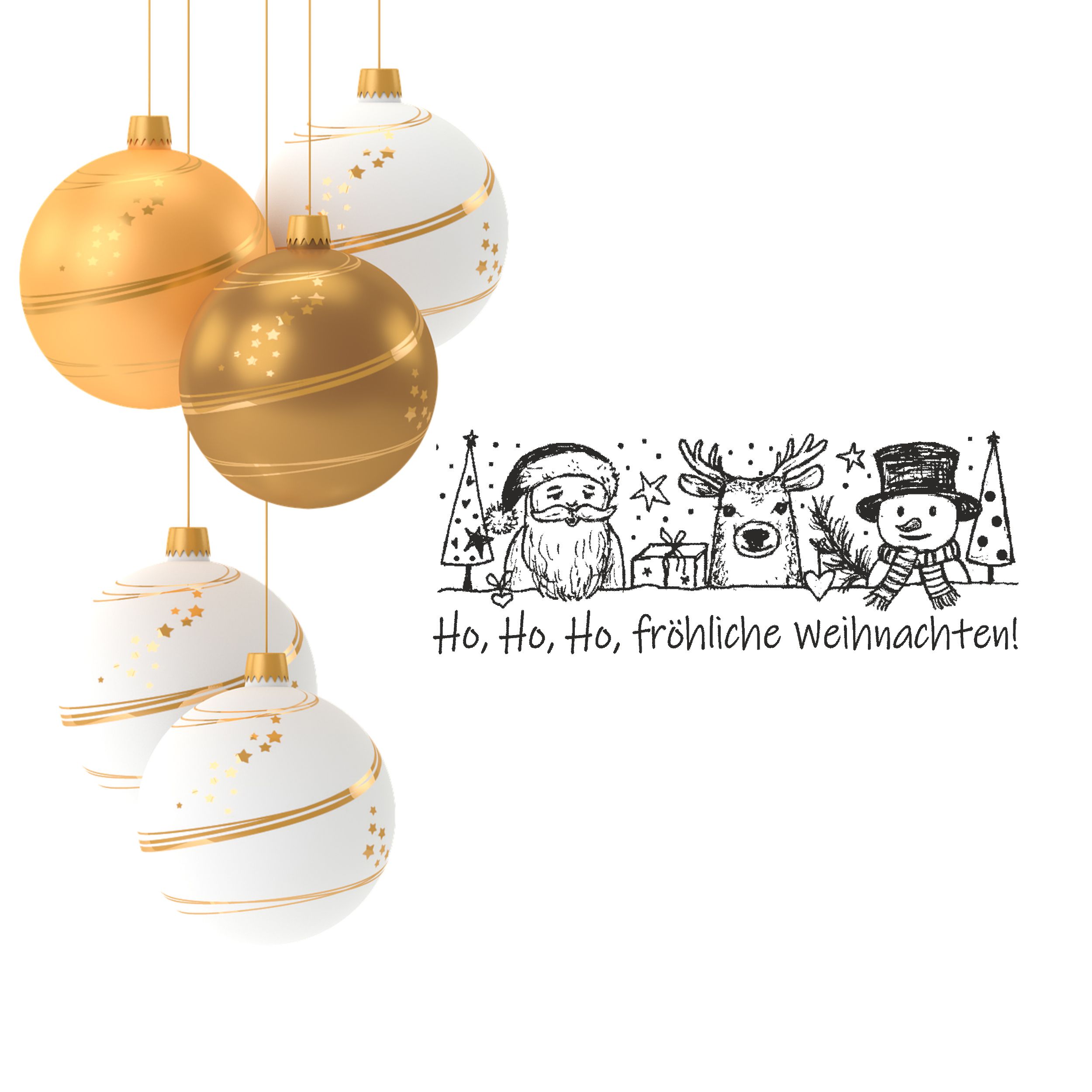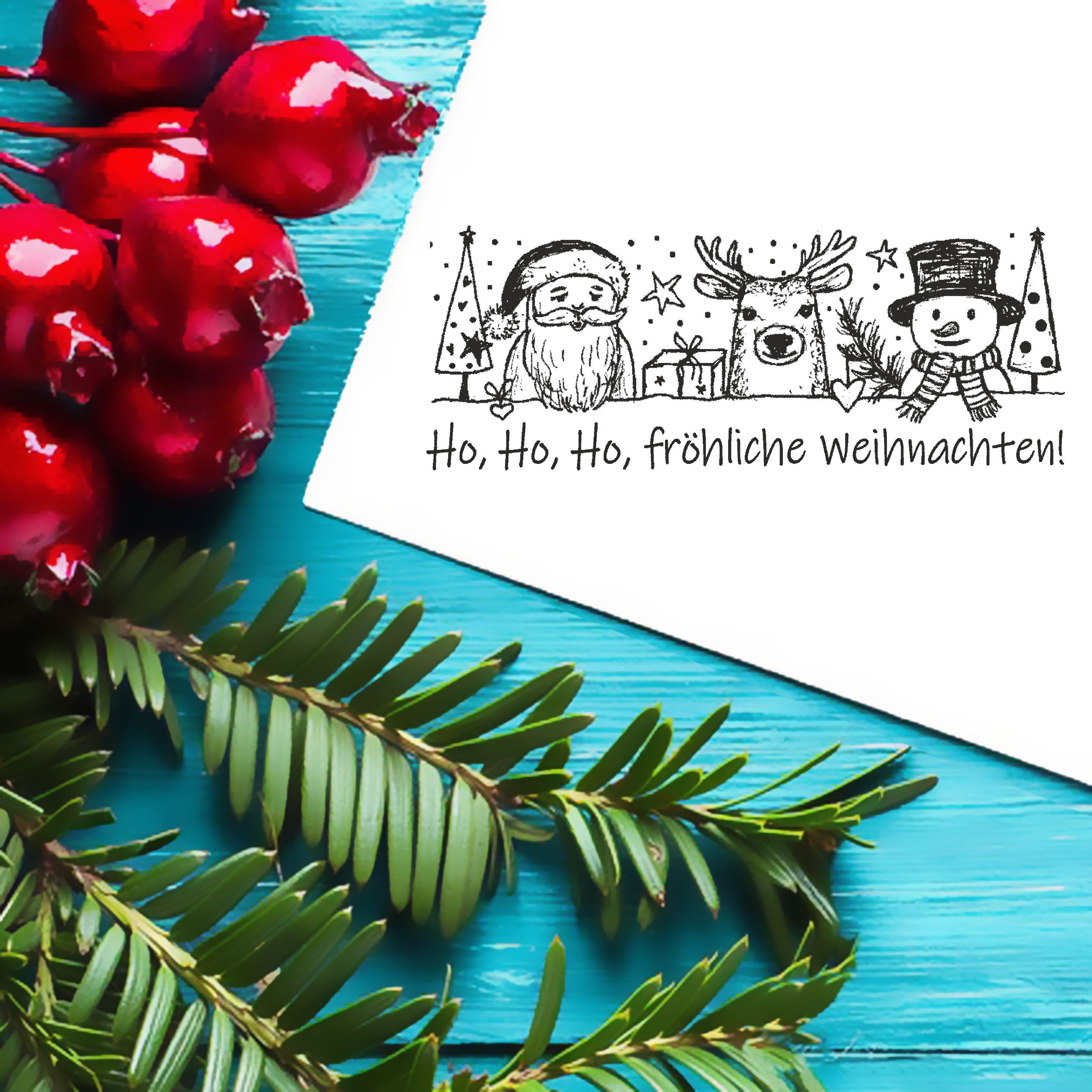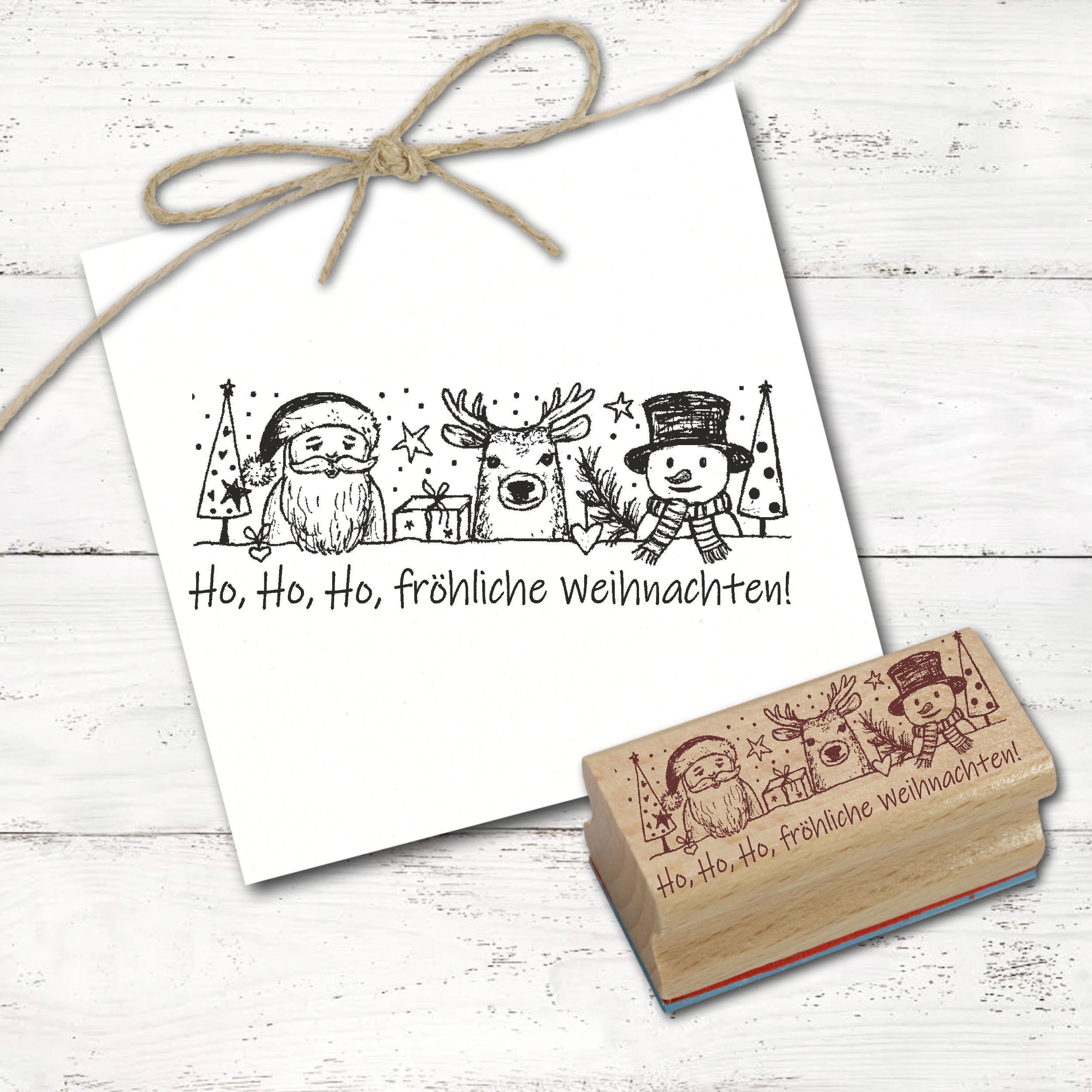 Motivstempel Ho, ho, ho, fröhliche Weihnachten - Stempel Weihnachtsmann Rentier Schneemann Holzstempel 98 mm x 38 mm