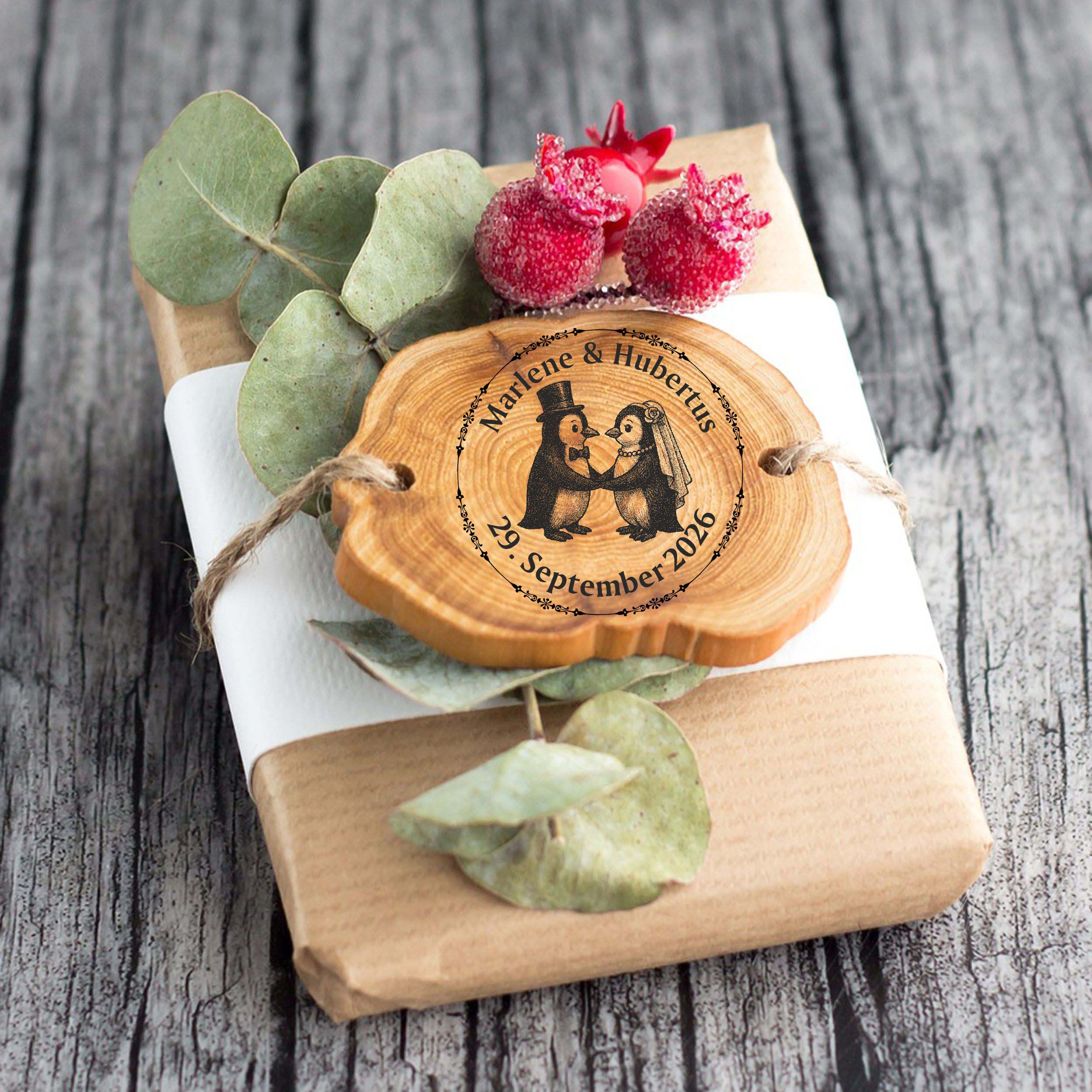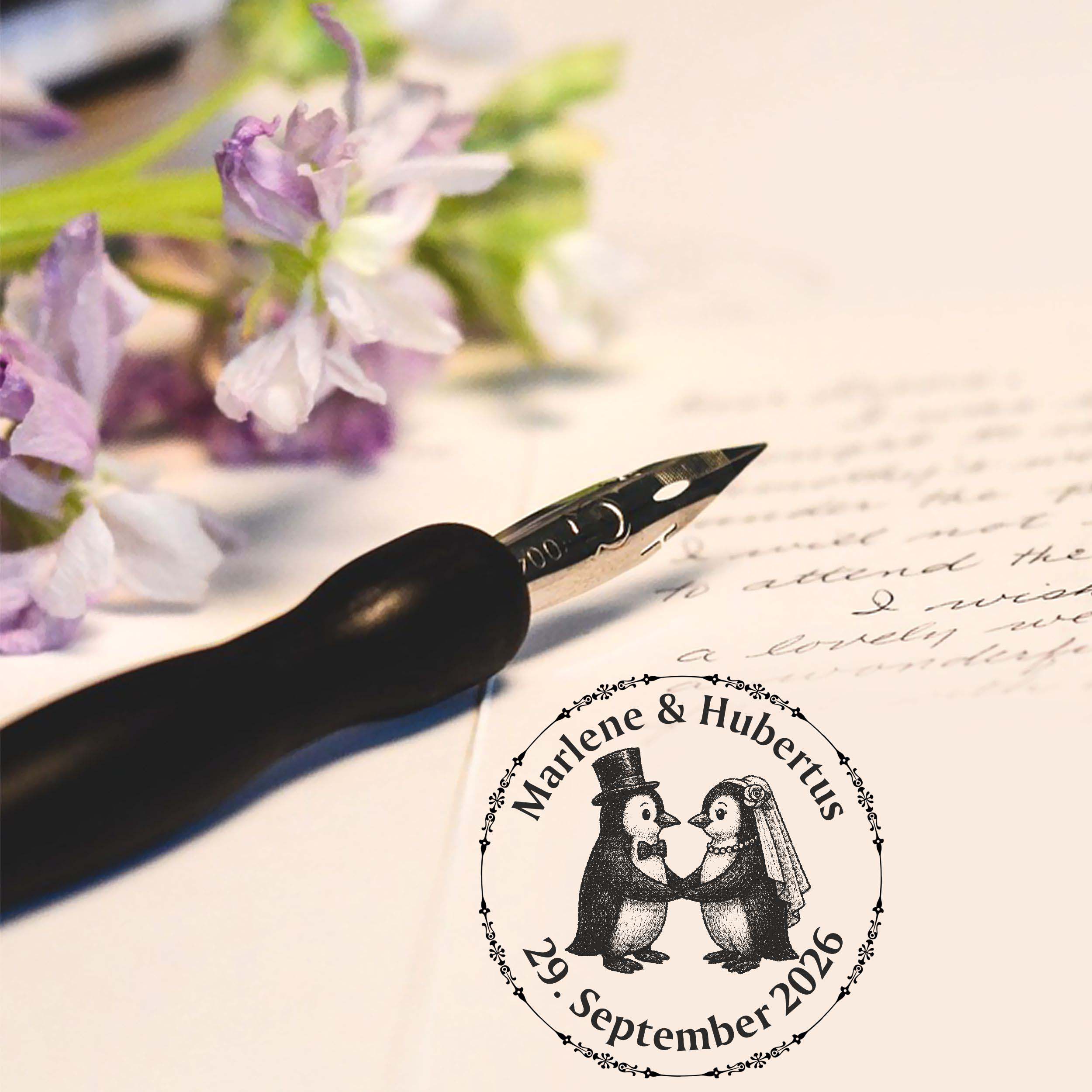 Ein liebevolles Geschenk für Brautpaare, Verlobte oder frisch Vermählte. Der personalisierte Hochzeitsstempel mit Pinguin-Motiv ist nicht nur praktisch, sondern auch eine Erinnerung an den schönsten Tag im Leben. Ideal als Beigabe zur Hochzeitskarte, zum Gästebuch oder als besonderes Detail in der Hochzeitsvorbereitung.