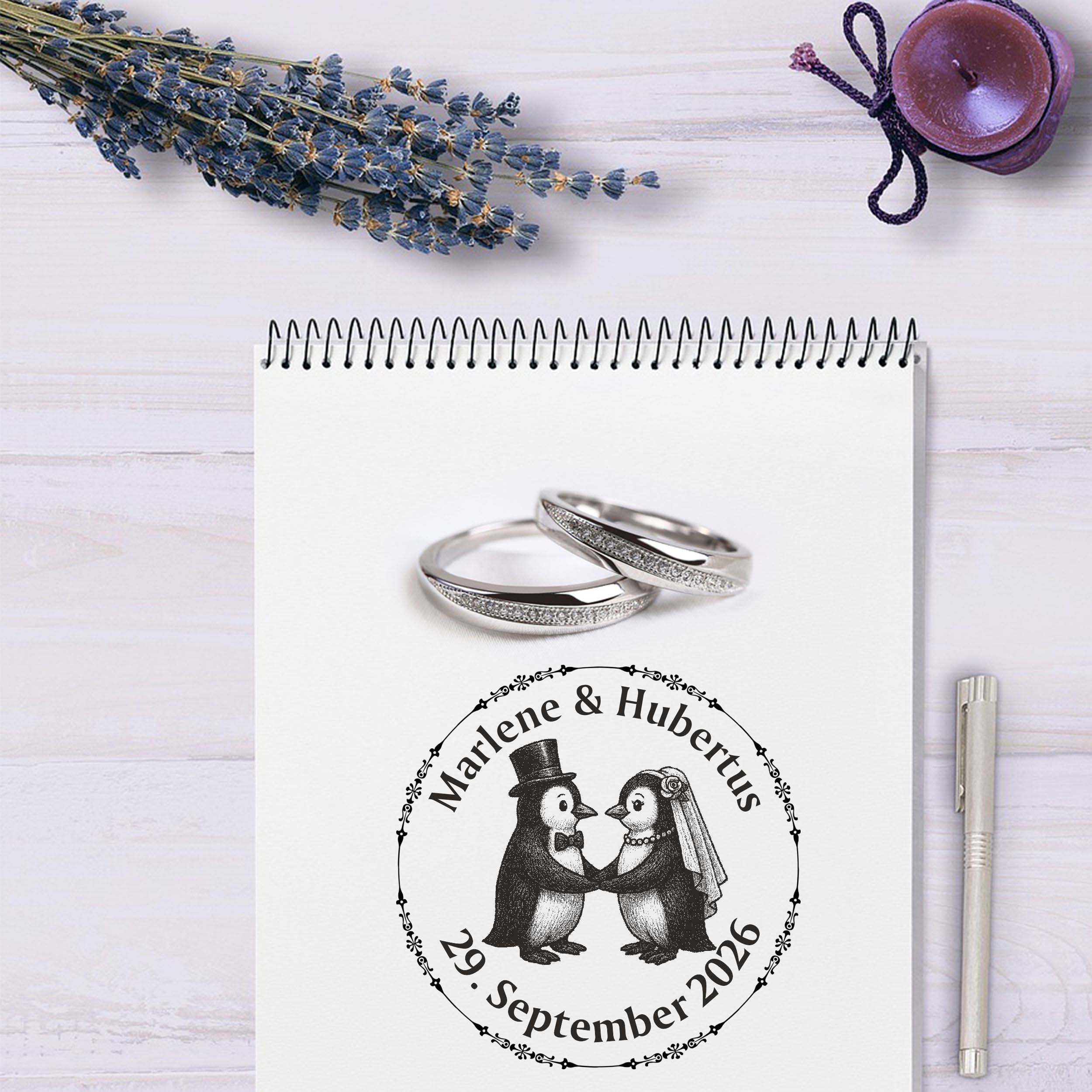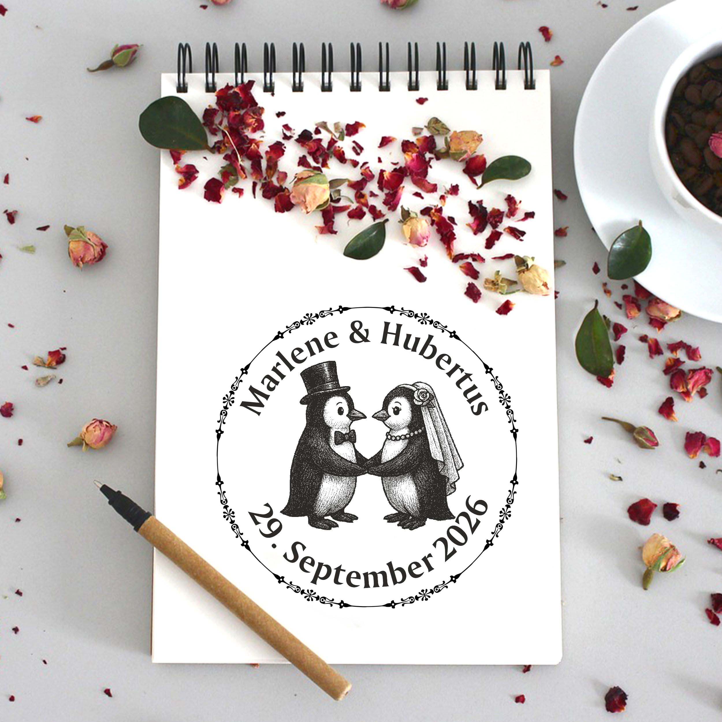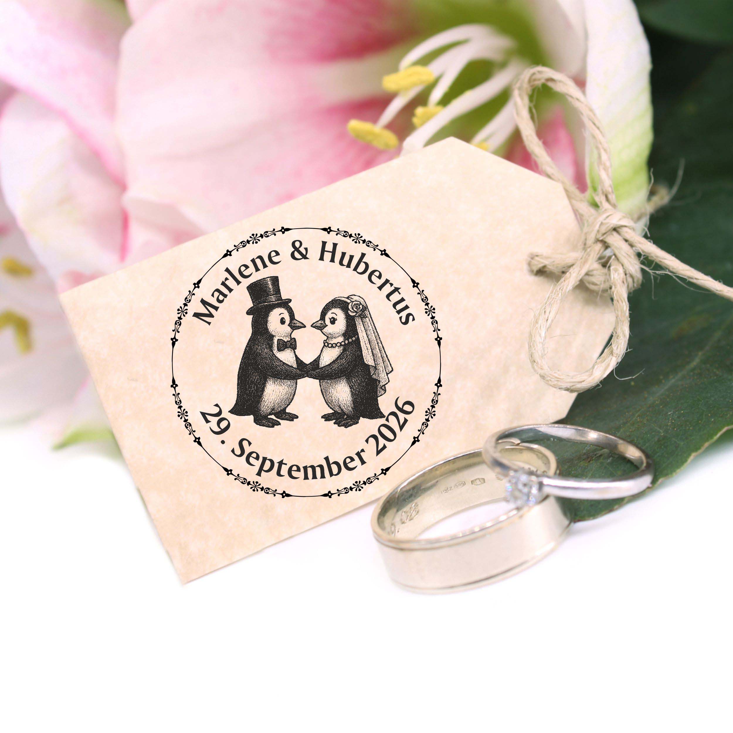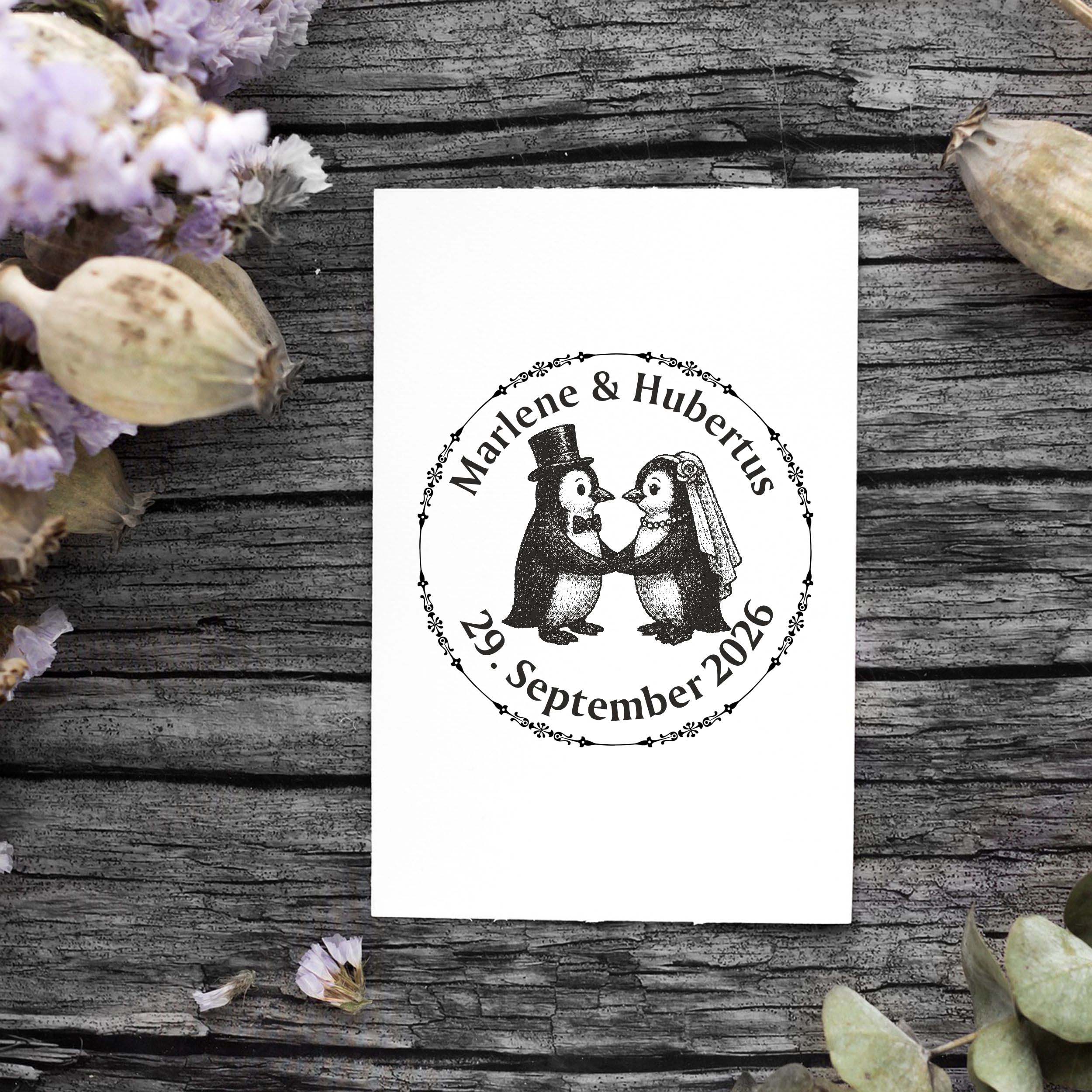 Vermählte. Der personalisierte Hochzeitsstempel mit Pinguin-Motiv ist nicht nur