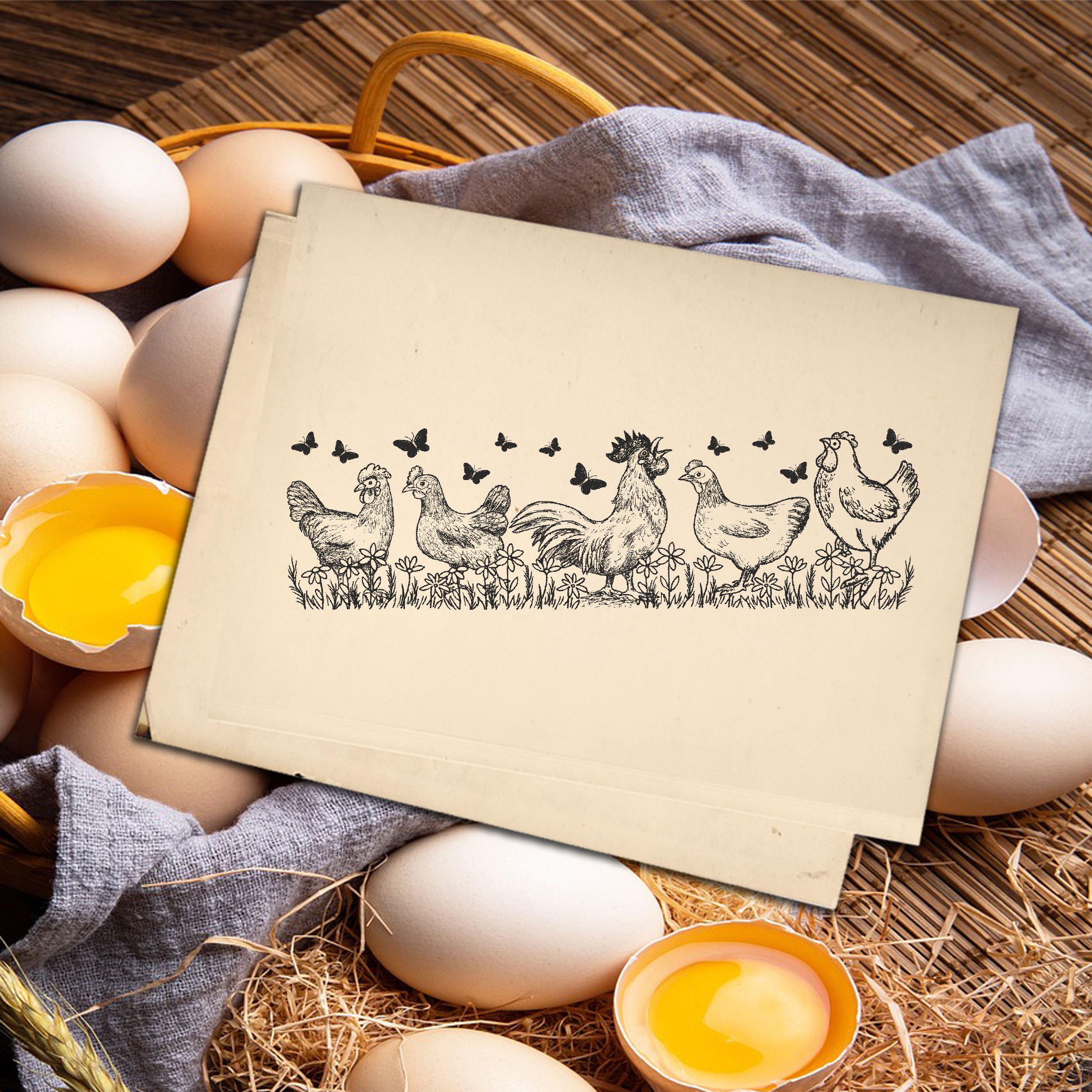 Die Hühner-Bordüre im Vintage-Stil verleiht jeder Verpackung, Bastelarbeit oder Grußkarte einen warmen, rustikalen und naturverbundenen Charakter.