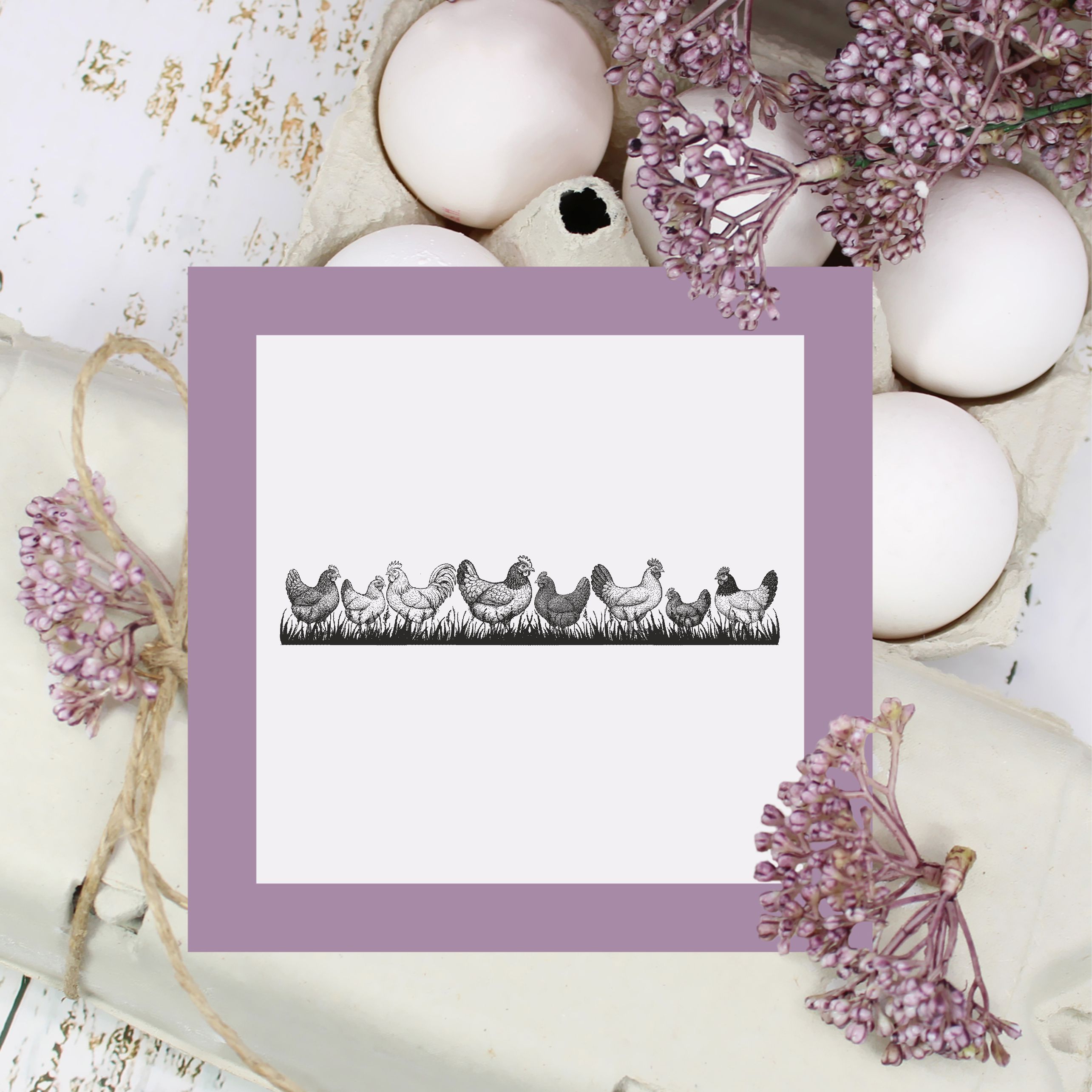 Die Hühner-Bordüre im Vintage-Stil verleiht jeder Verpackung, Bastelarbeit oder Grußkarte einen warmen, rustikalen und naturverbundenen Charakter.