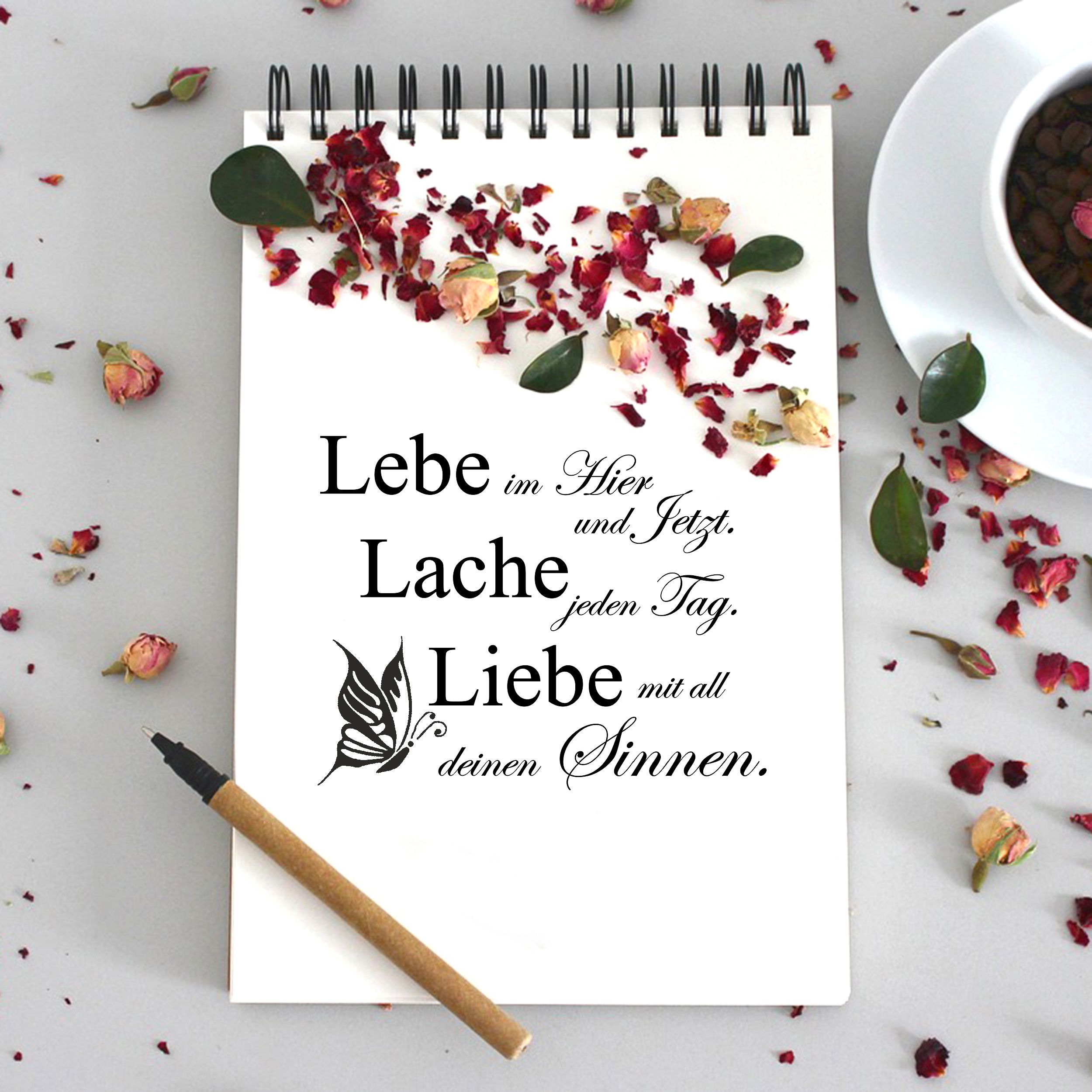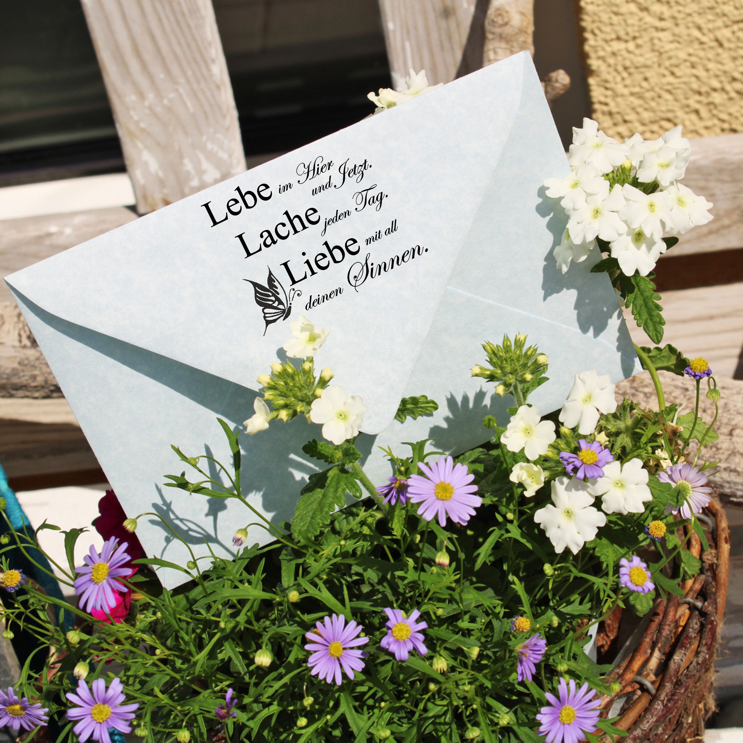 Motivstempel Lebe Lache Liebe Spruch - Stempel Schmetterling Holzstempel 48 x 38 mm