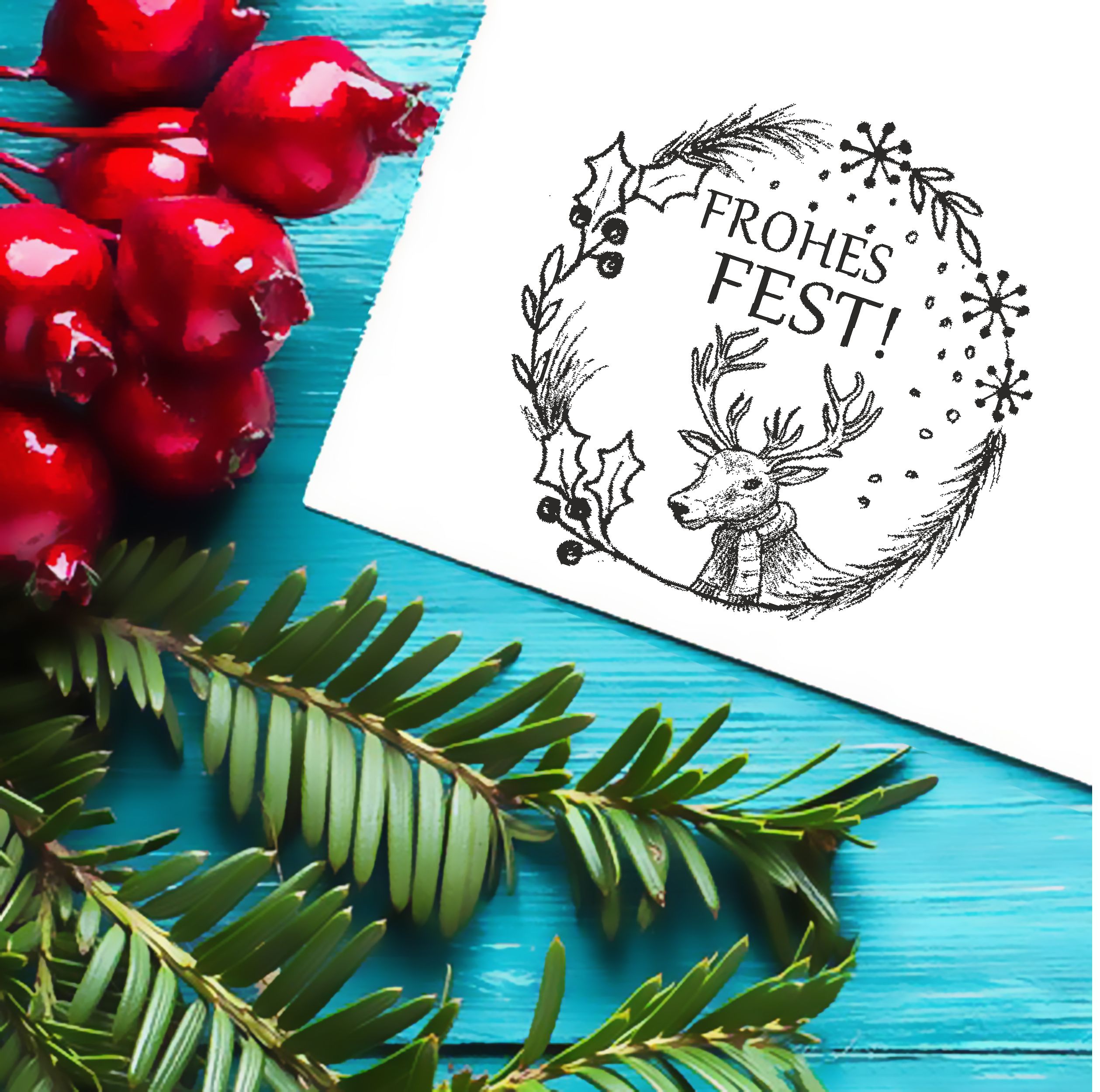 Motivstempel Rentier Frohes Fest - Mistelzweig Stempel rund Holzstempel 48mm x 48mm