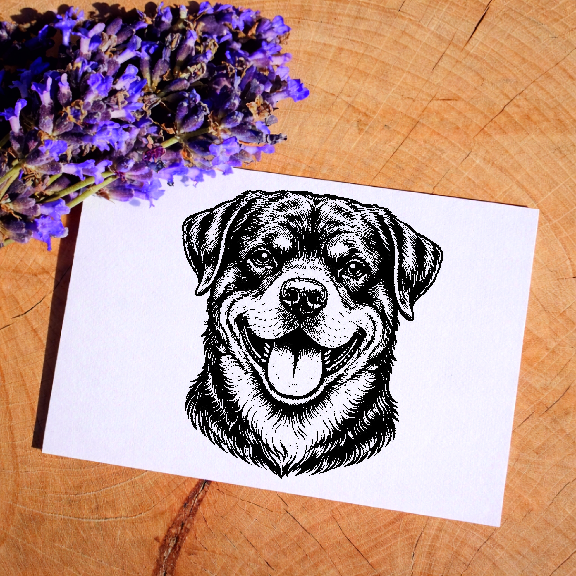Das detailreiche Hundemotiv wird präzise per Lasergravur auf eine langlebige Gummistempelplatte übertragen und sorgt für saubere, klare Abdrucke auf Papier, Karten oder Verpackungen.