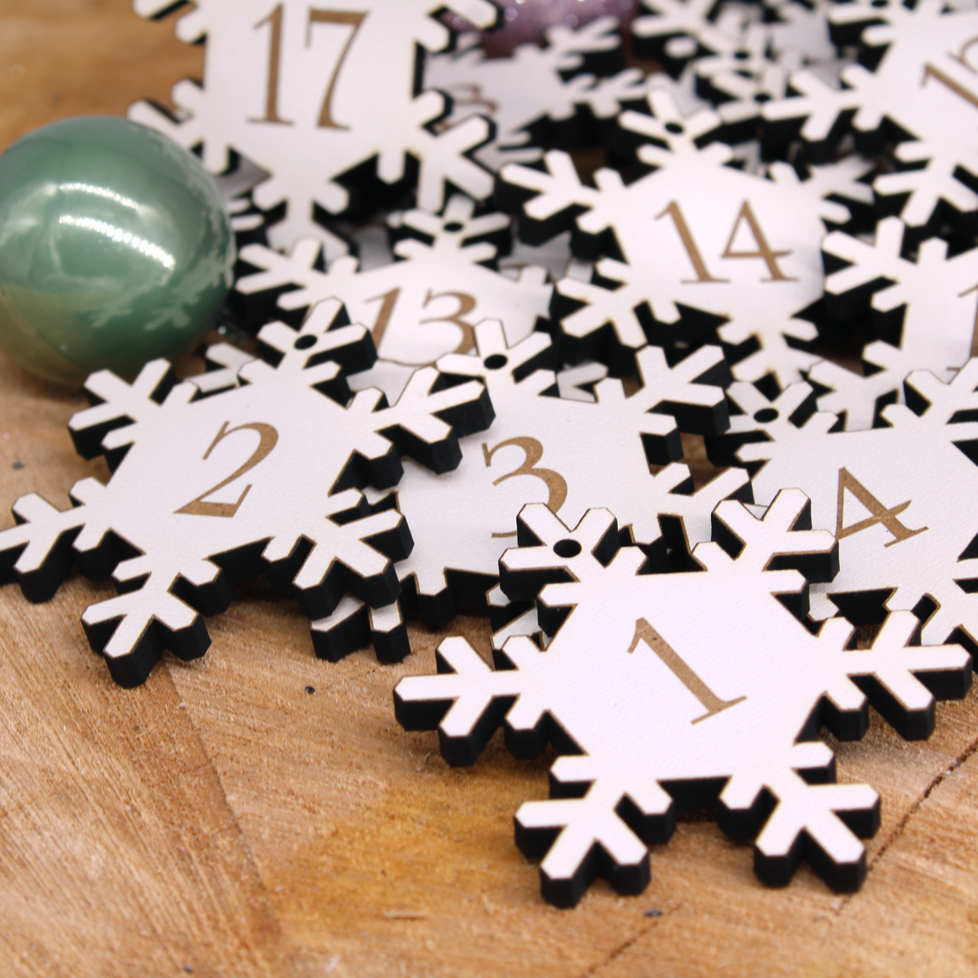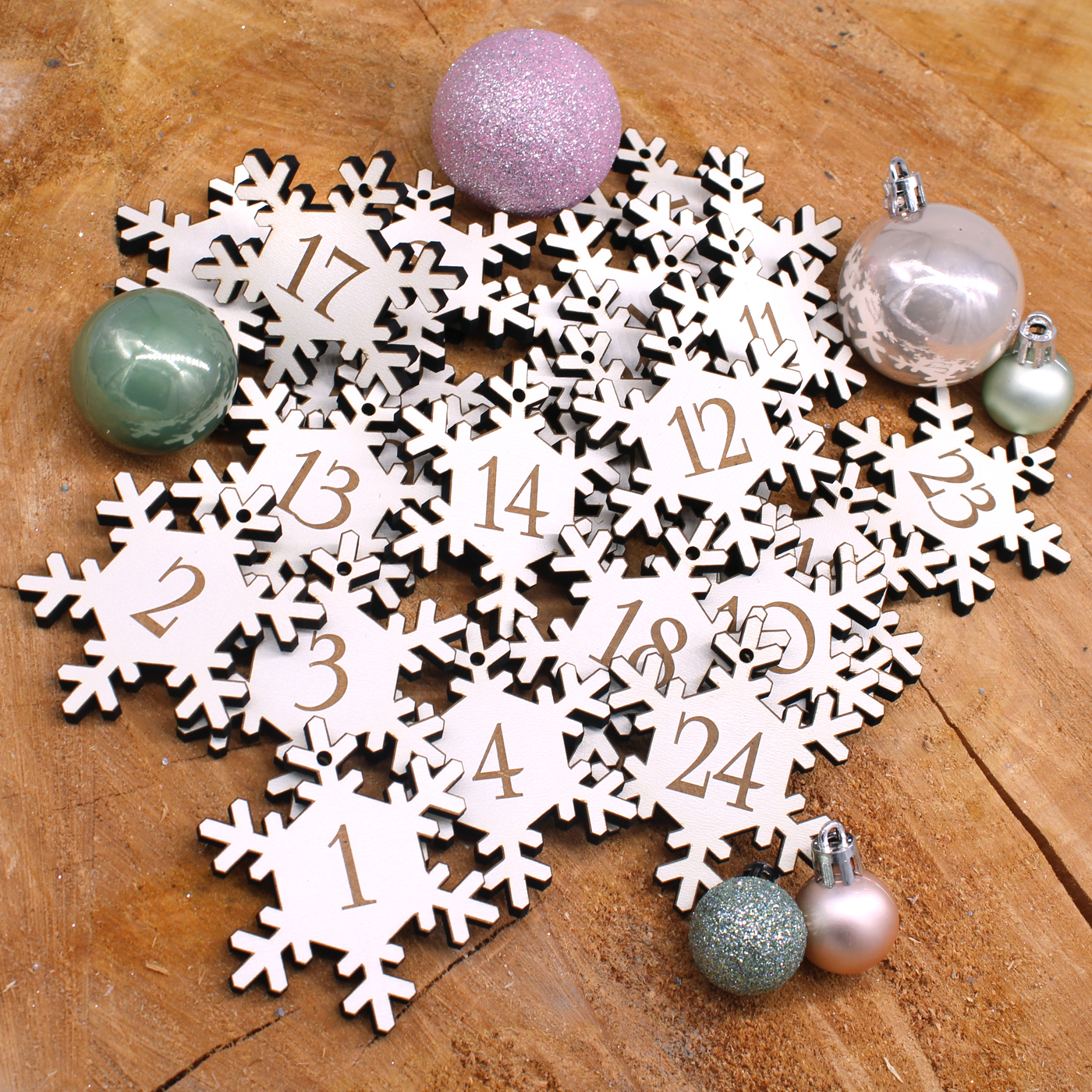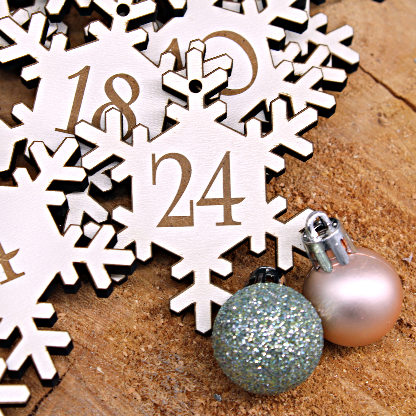 - DEKORATION: Gravierte Schneeflocken mit den Zahlen 1 bis 24. Am oberen Teil der Schneeflocke befindet sich eine kleine Bohrung, an der beliebig eine Kordel oder ein schönes Band angebracht werden kann.