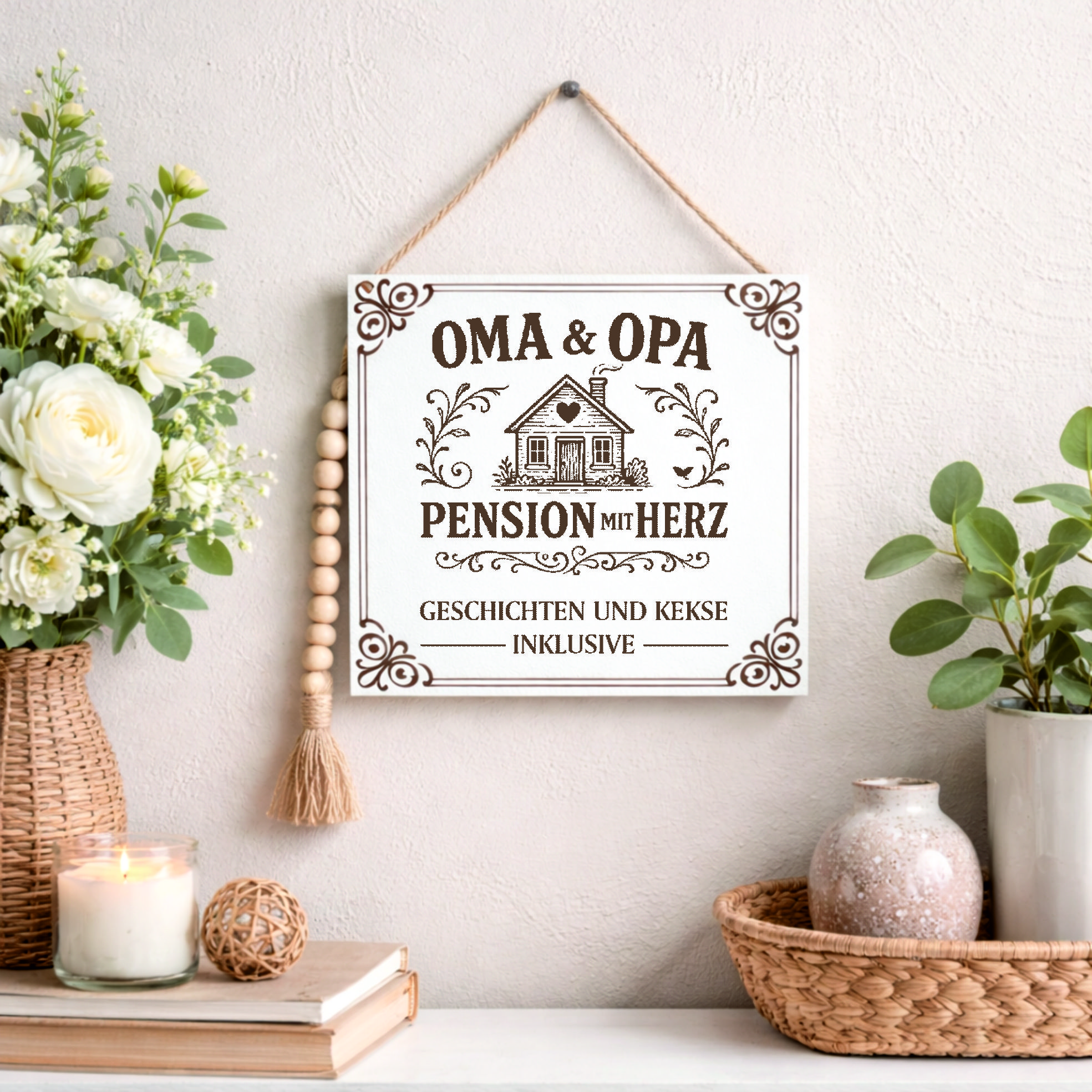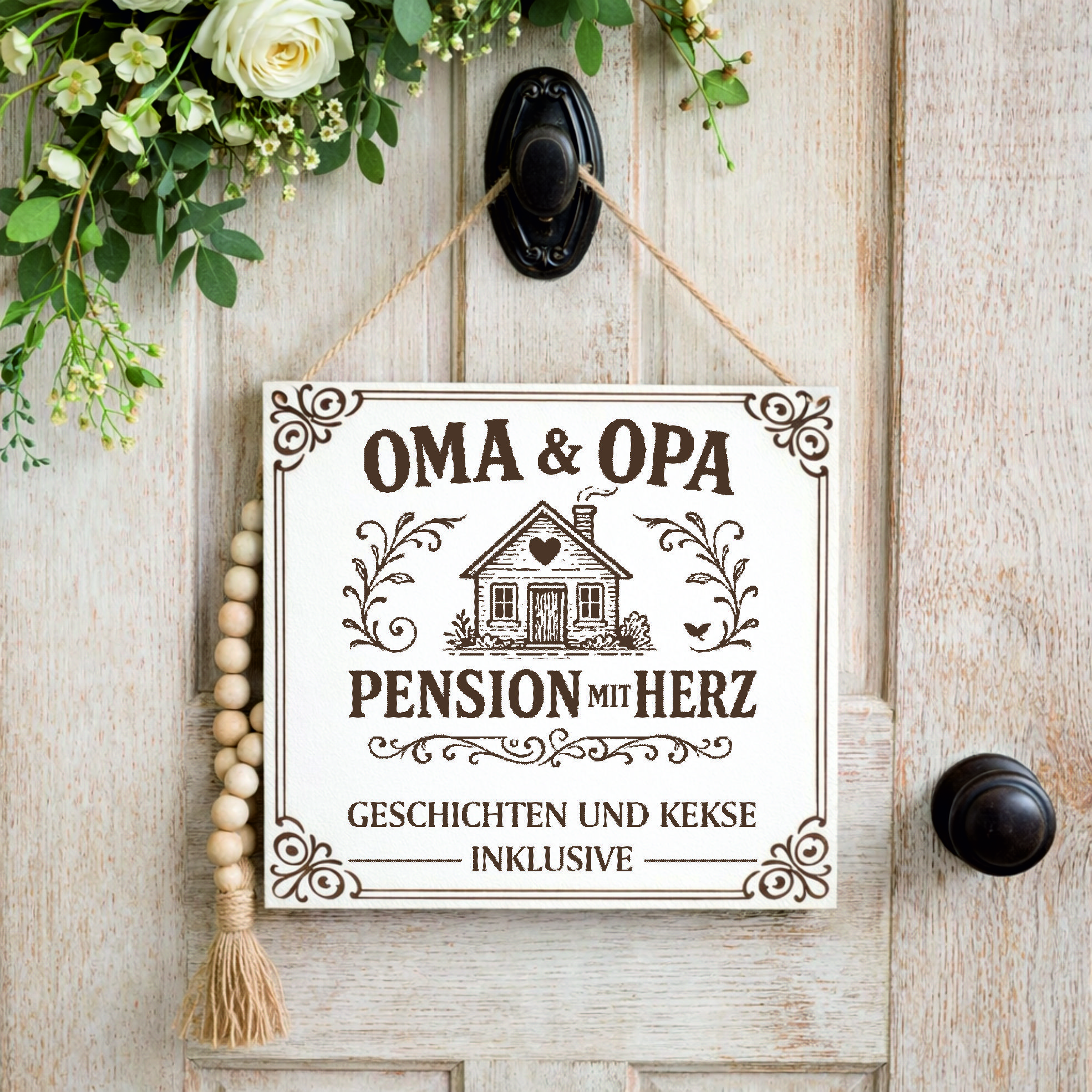 Oma & Opa Schild – Pension mit Herz – graviertes HDF Dekoschild 15x15 cm
