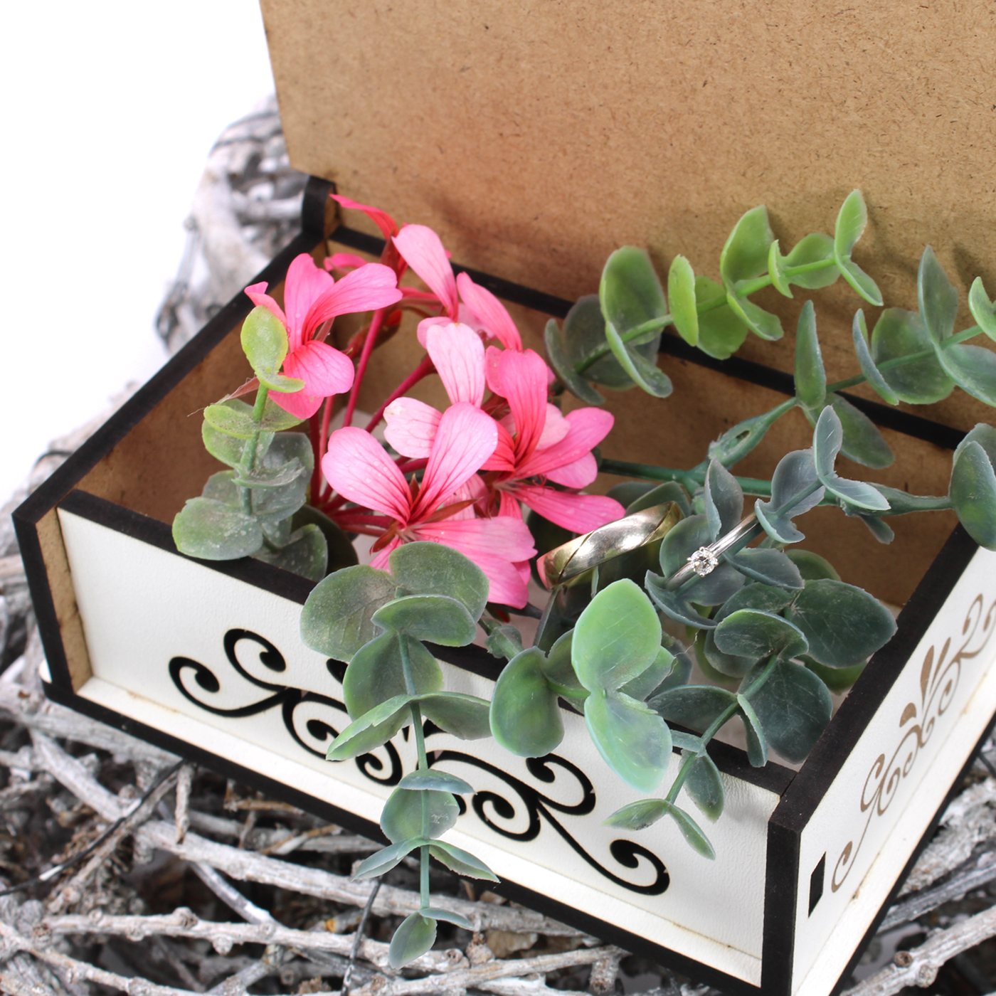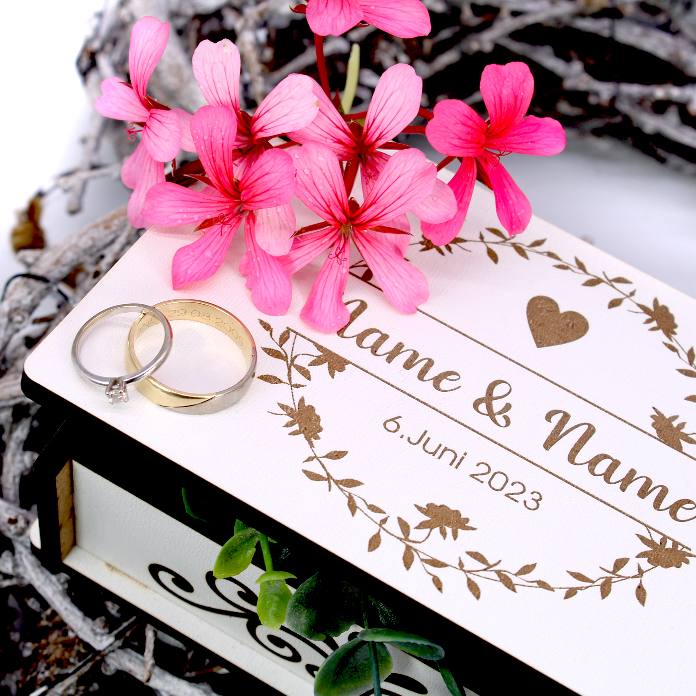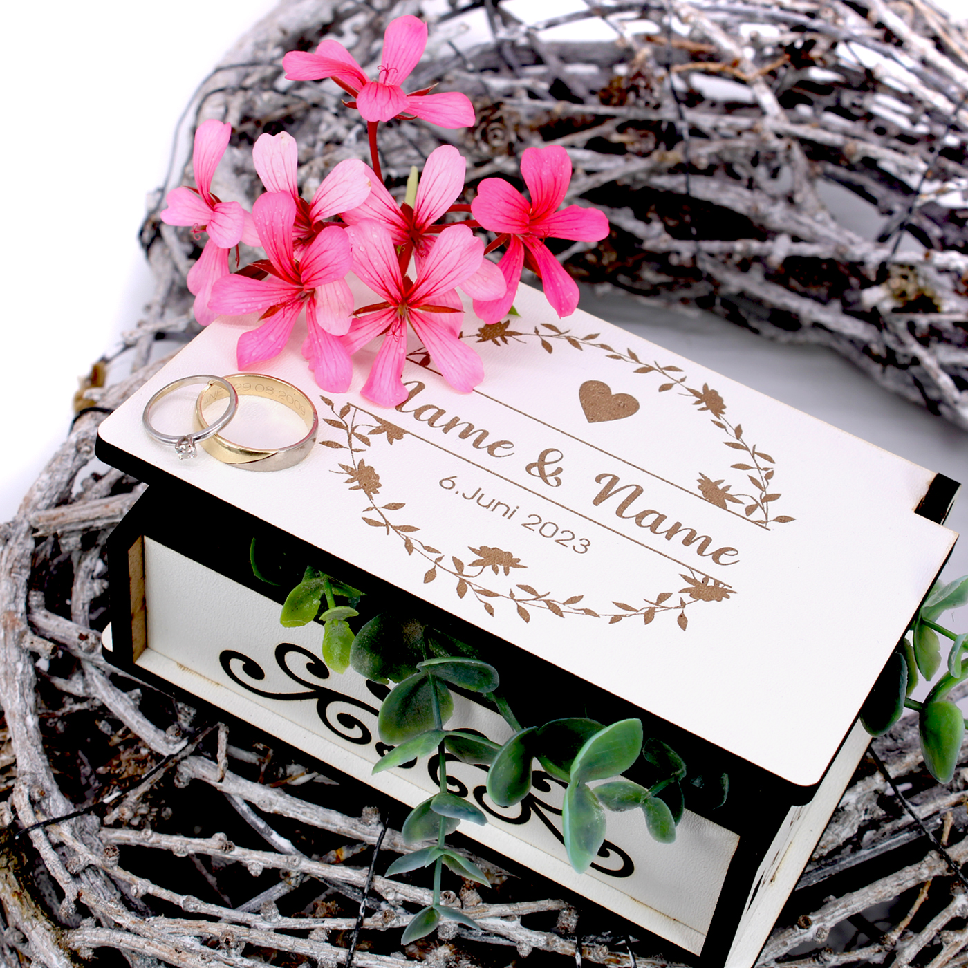 Ob als stilvolle Verpackung für Ihr Hochzeitsgeschenk, als Ringbox während der Zeremonie oder als Erinnerungsstück für die Ewigkeit – diese Kiste ist so einzigartig wie das Brautpaar selbst.