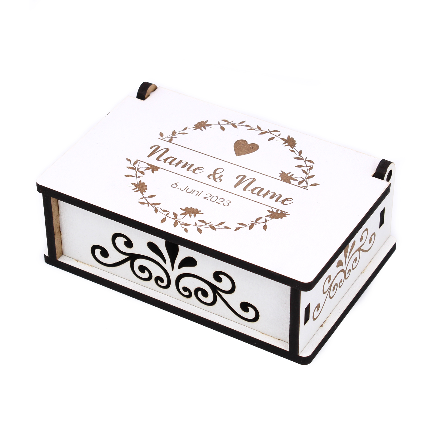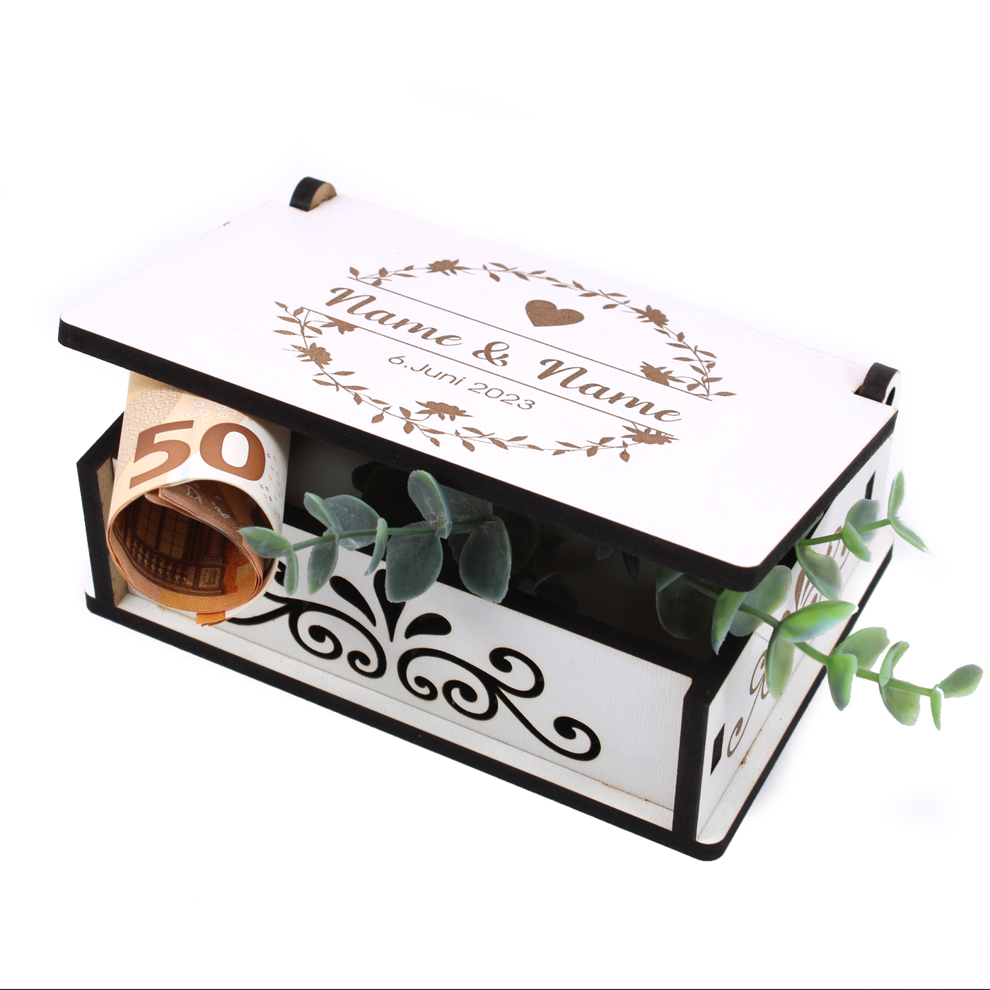 Gefertigt aus hochwertigem HDF-Holz (Maße: 15 x 10 x 5 cm), bietet die Kiste genug Platz für Geldscheine, kleine Geschenke, Schmuck oder persönliche Botschaften. Das weiße Design mit eleganten Ornamenten und romantischer Gravur macht sie zum echten Blickfang auf dem Geschenketisch oder als Deko-Element.