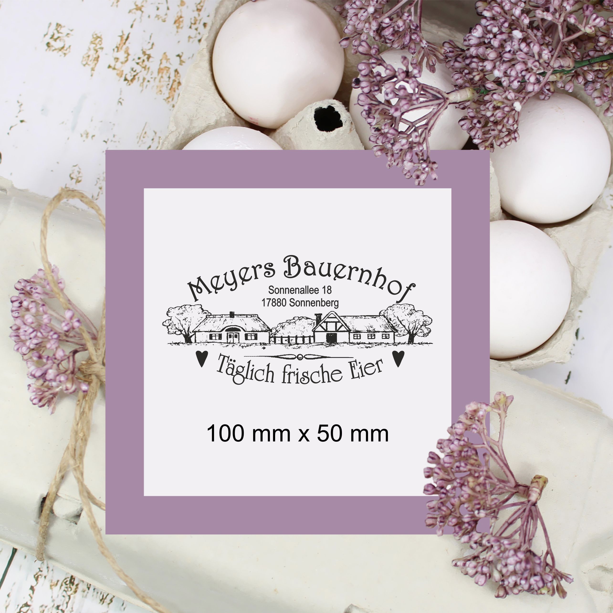 Großzügige Abdruckgröße für gute Lesbarkeit: Mit einer Abdruckgröße von 100 x 50 mm bietet der Stempel ausreichend Platz für Hofnamen, Adresse und Zusatztext und eignet sich perfekt für Eierkartons, Verpackungen oder Etiketten.