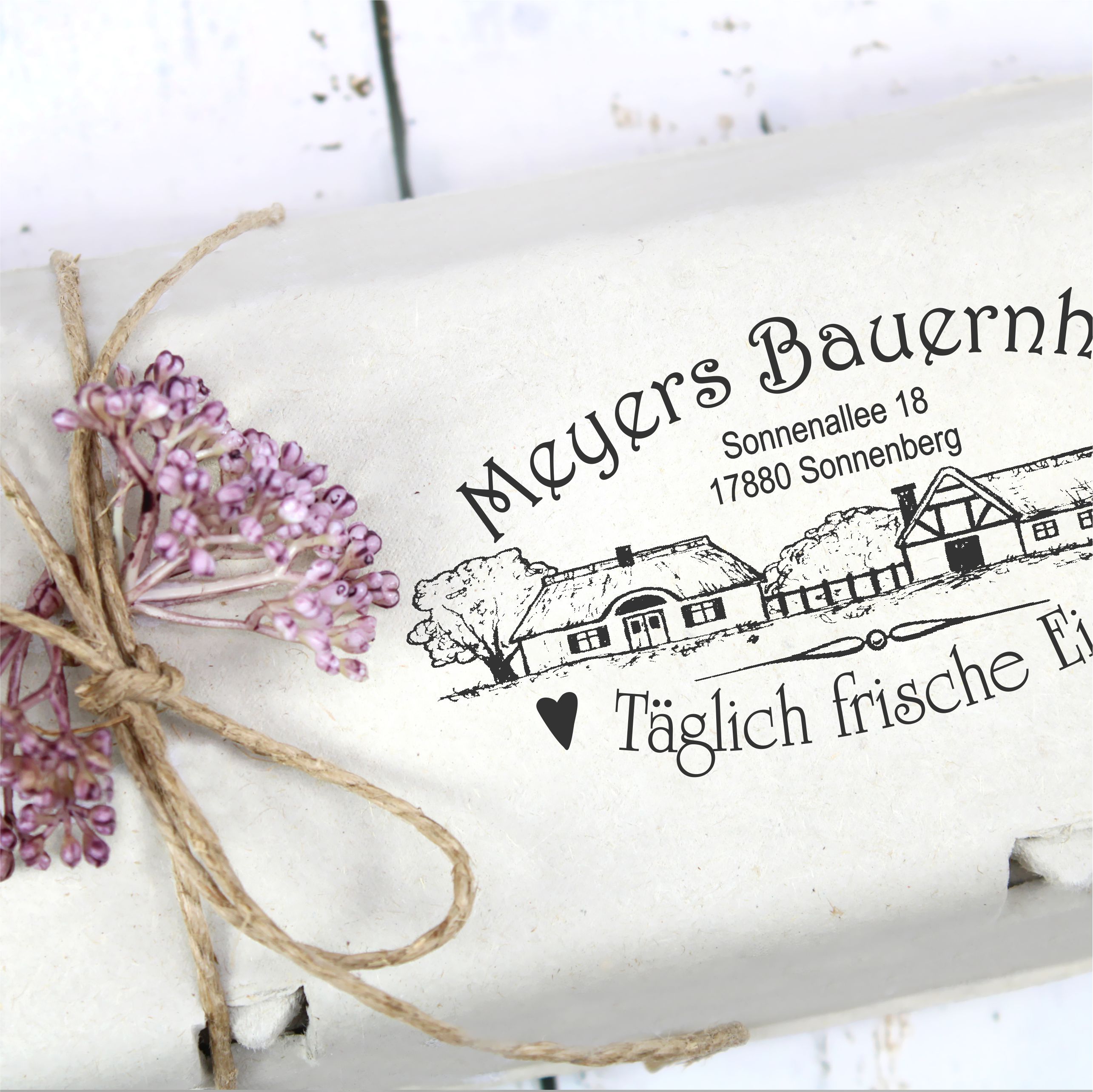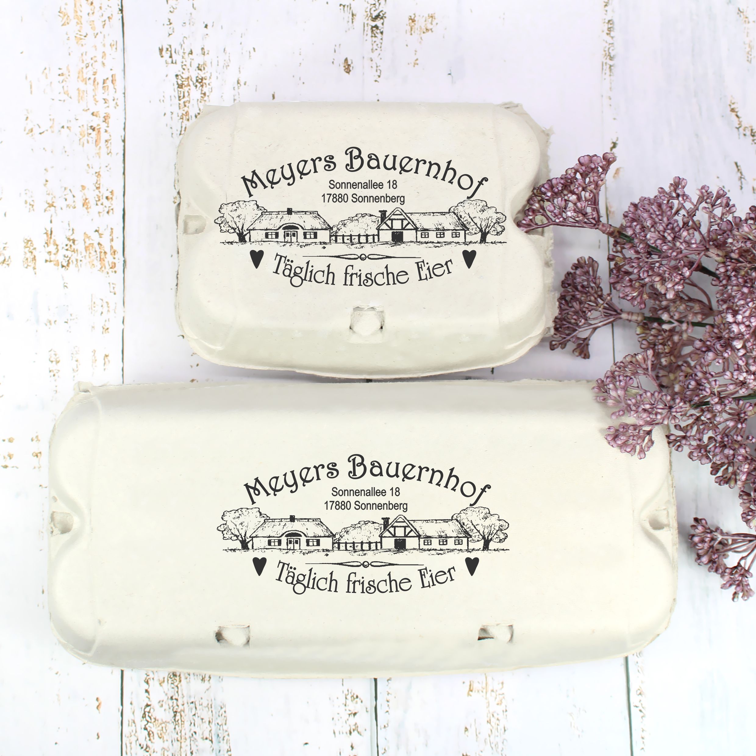 Individueller Stempel für Eierverpackungen: Mit diesem personalisierten Stempel kennzeichnen Sie Ihre Eierkartons professionell und stilvoll. Der Stempel wird individuell mit Ihrem Hofnamen, Ihrer Adresse oder Wunschtext gestaltet und eignet sich ideal für Direktvermarkter, Bauernhöfe und private Hühnerhalter.