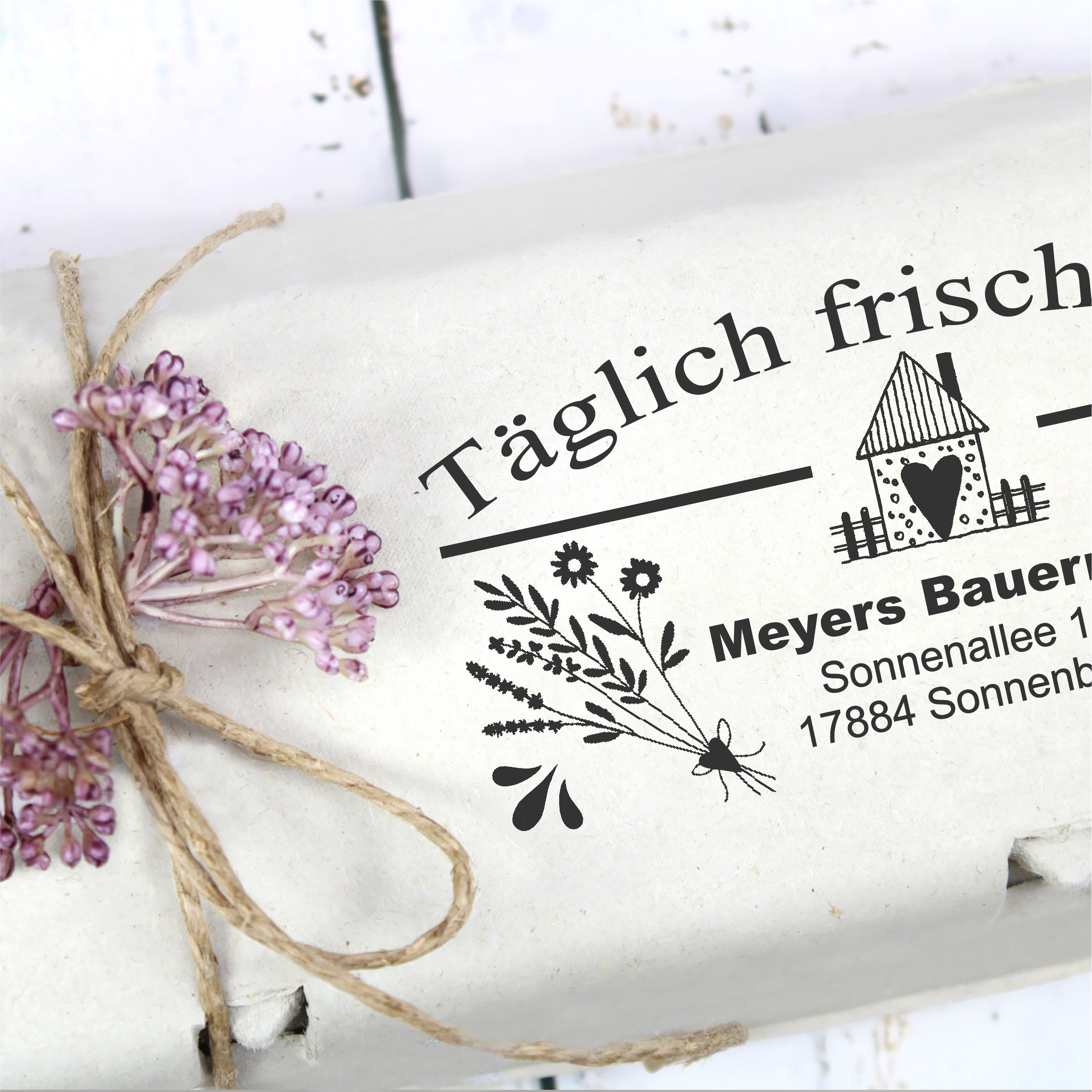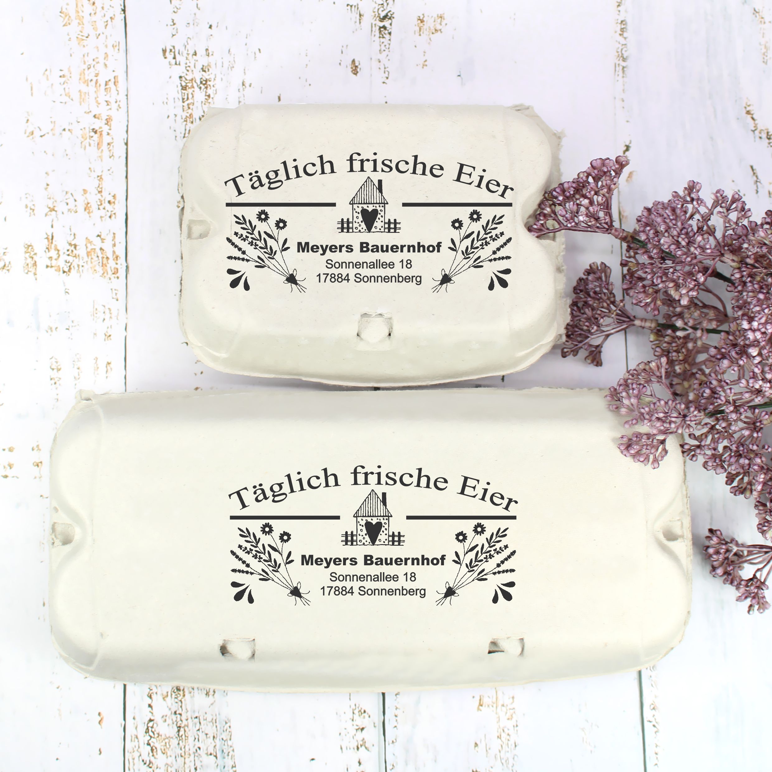 Mit dem personalisierten Eierkarton-Stempel „Täglich frische Eier“ mit Adresse kennzeichnen Sie Ihre Eierverpackungen klar, professionell und im beliebten Landhaus- und Bauernhof-Stil. Durch die Angabe von Hofname und Adresse schaffen Sie Transparenz, Vertrauen und Wiedererkennungswert für Ihre Kundschaft.