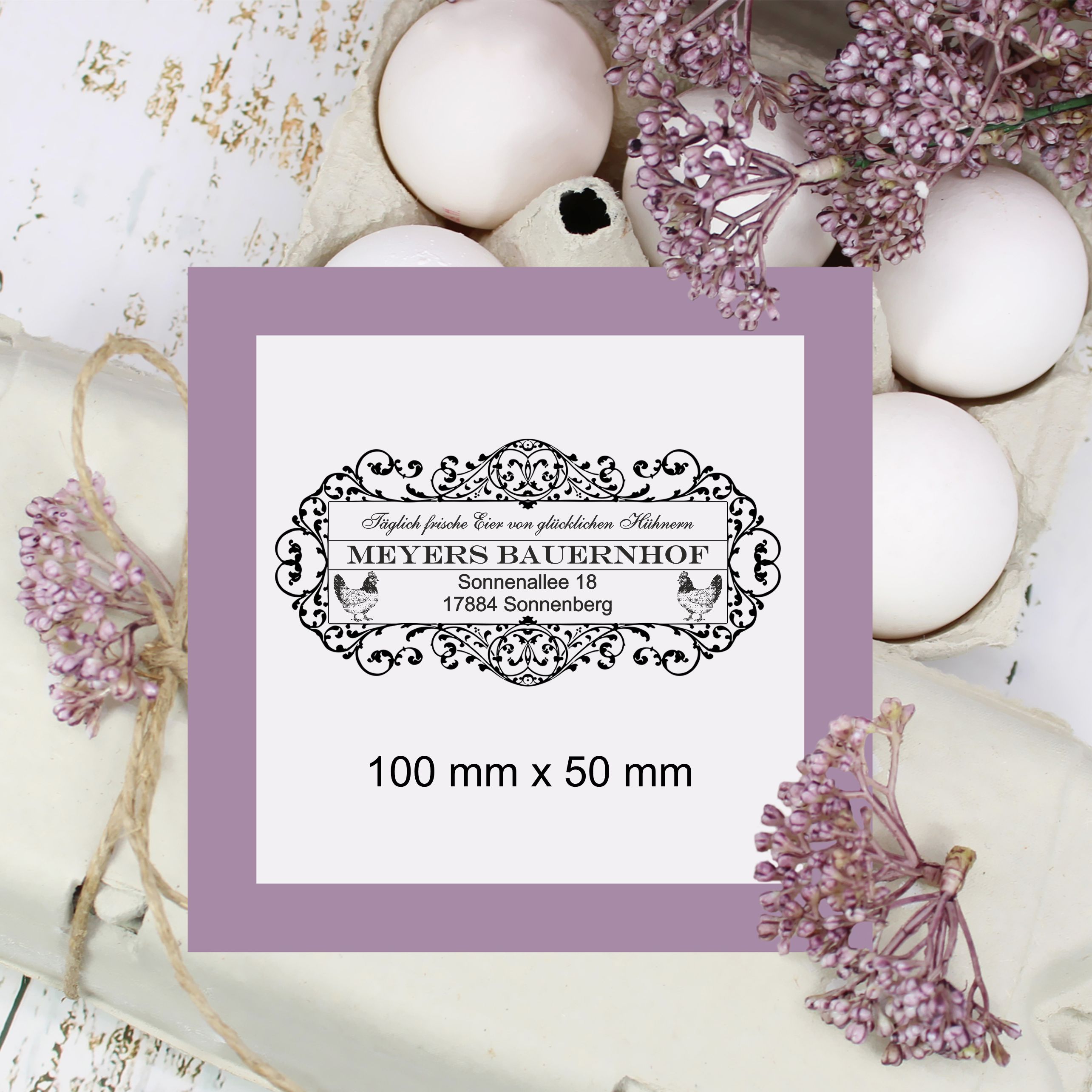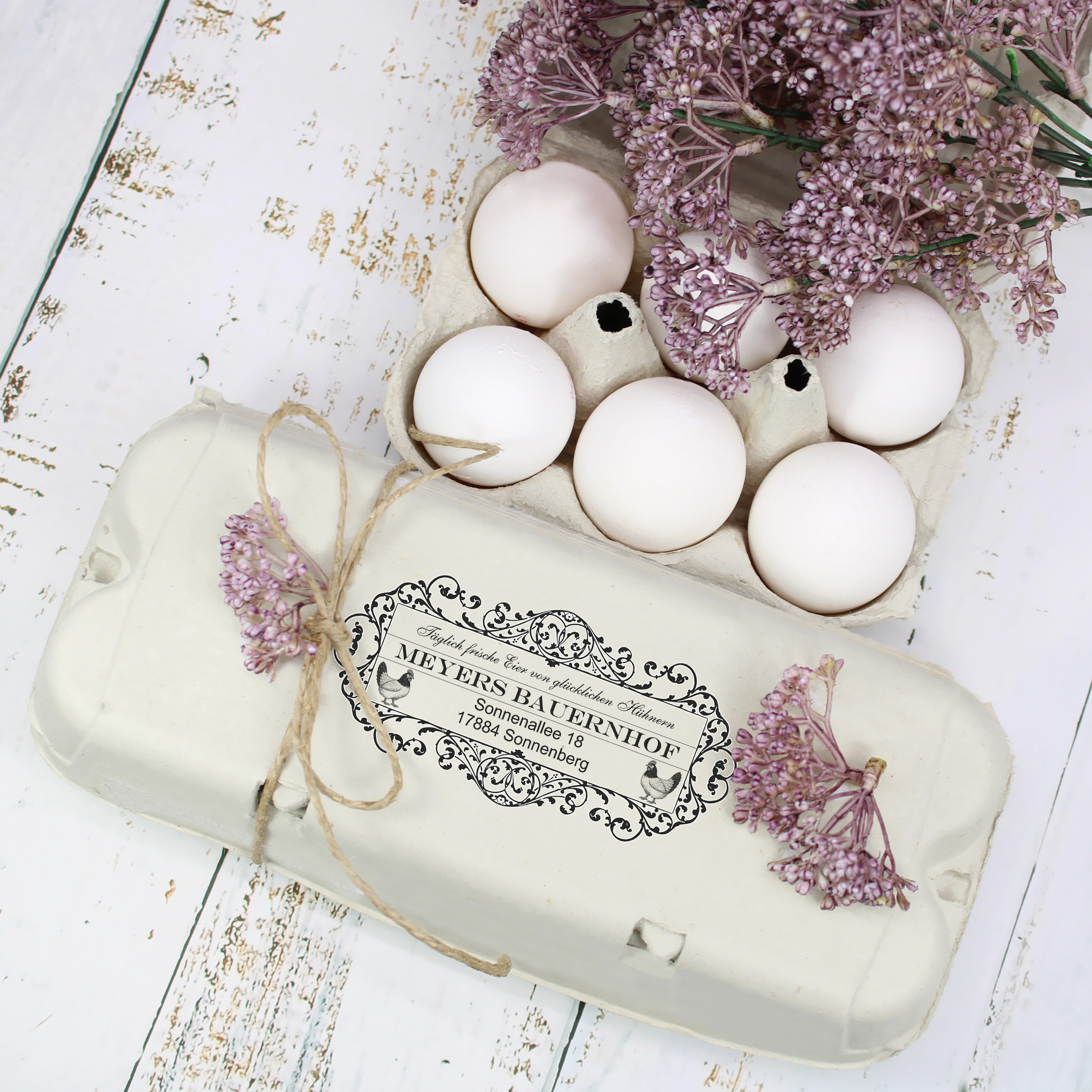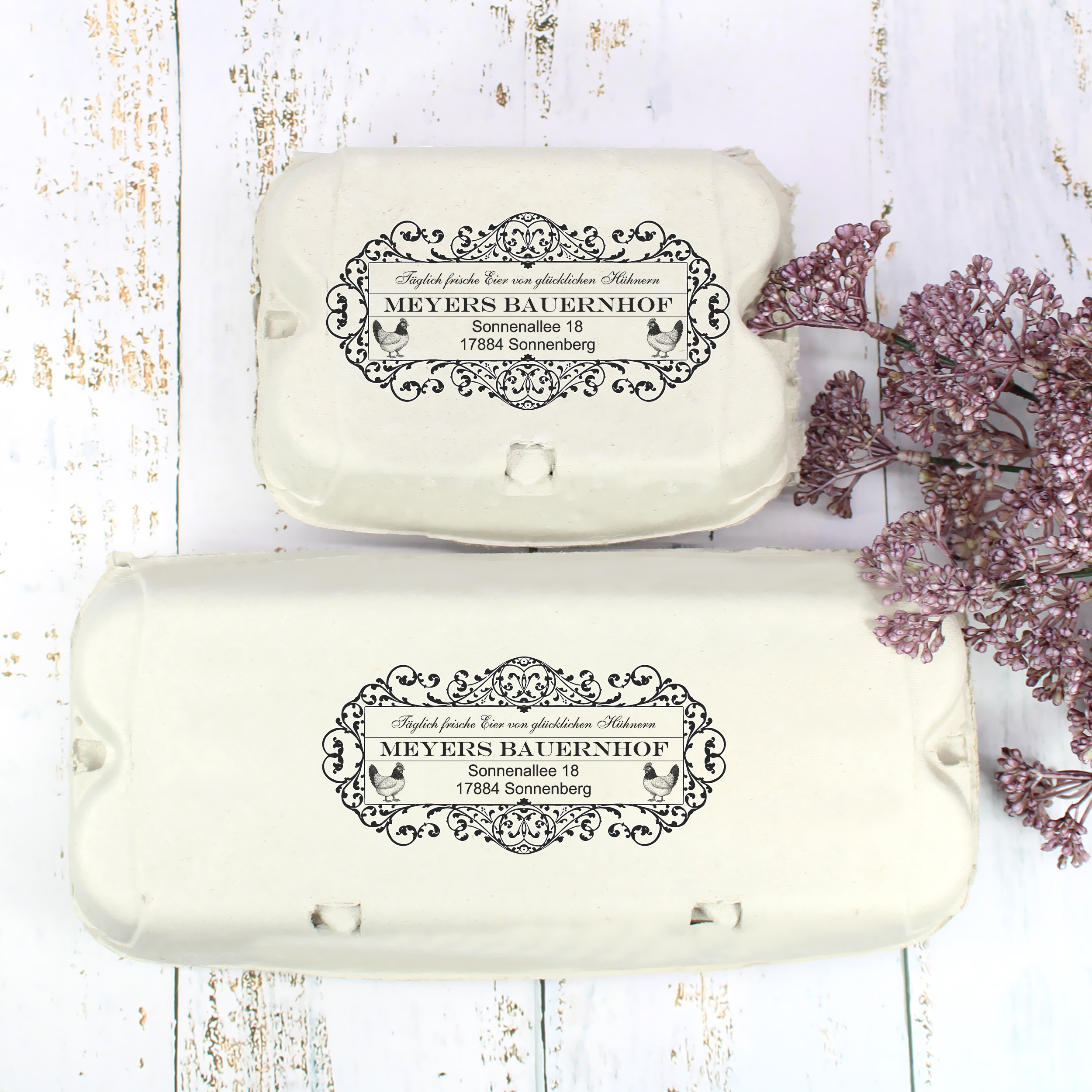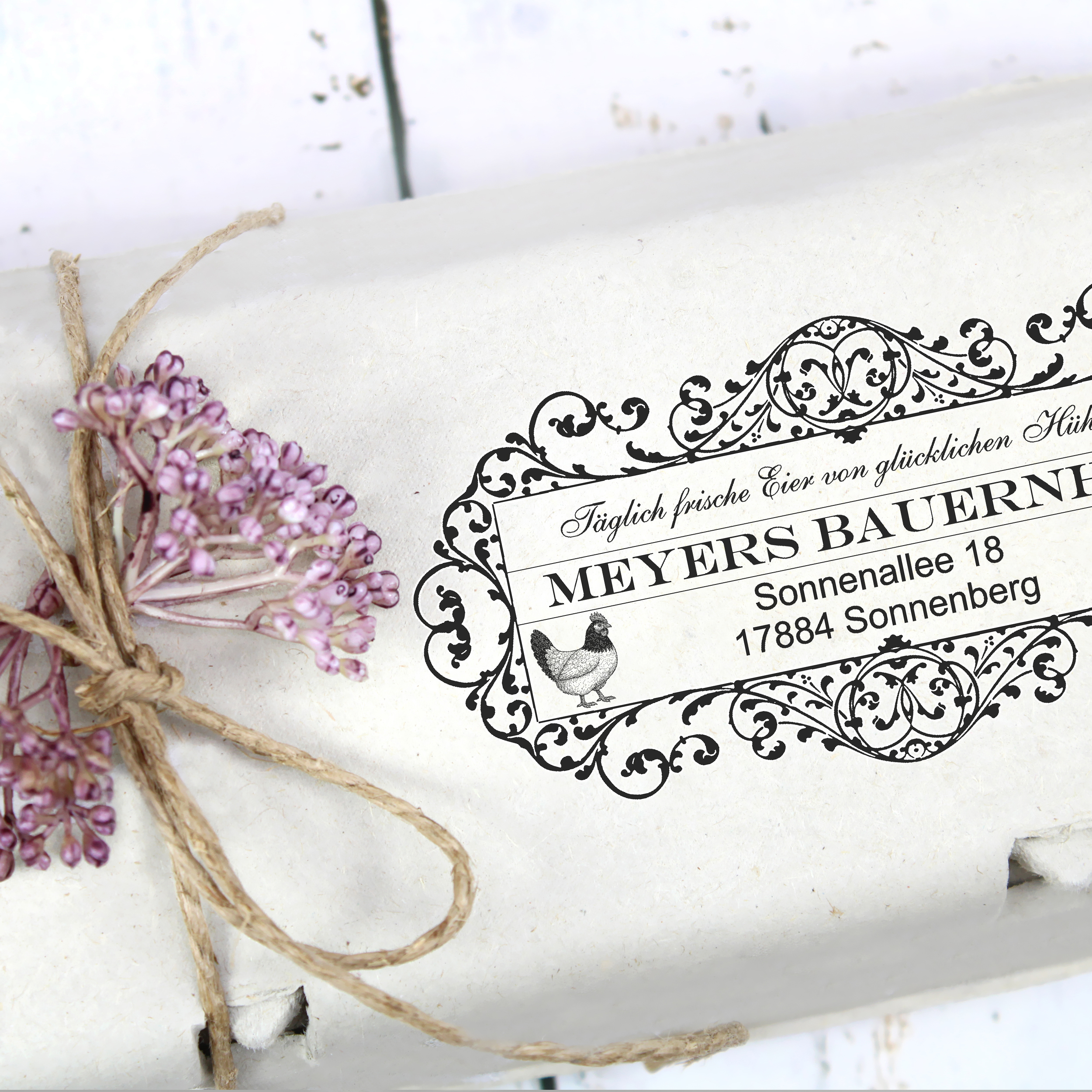 Der Stempel wird individuell mit Ihrem Hofnamen, Ihrer Adresse oder einem Wunschtext gestaltet und eignet sich perfekt für Bauernhöfe, Hofläden, Direktvermarkter oder private Hühnerhalter.