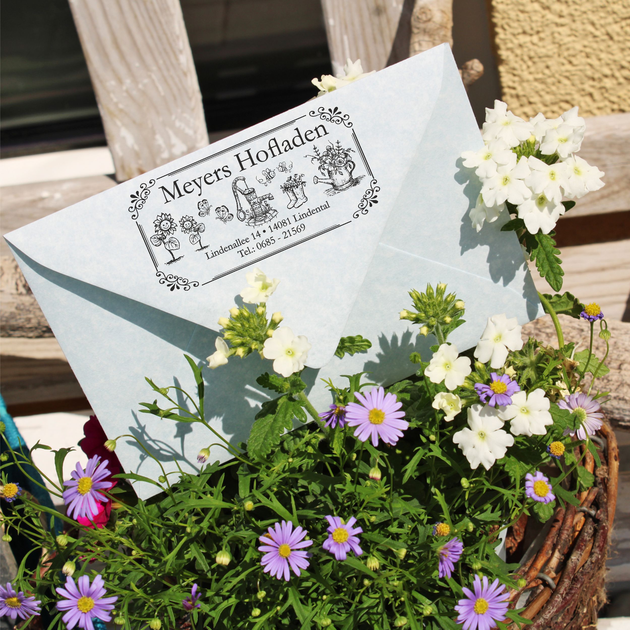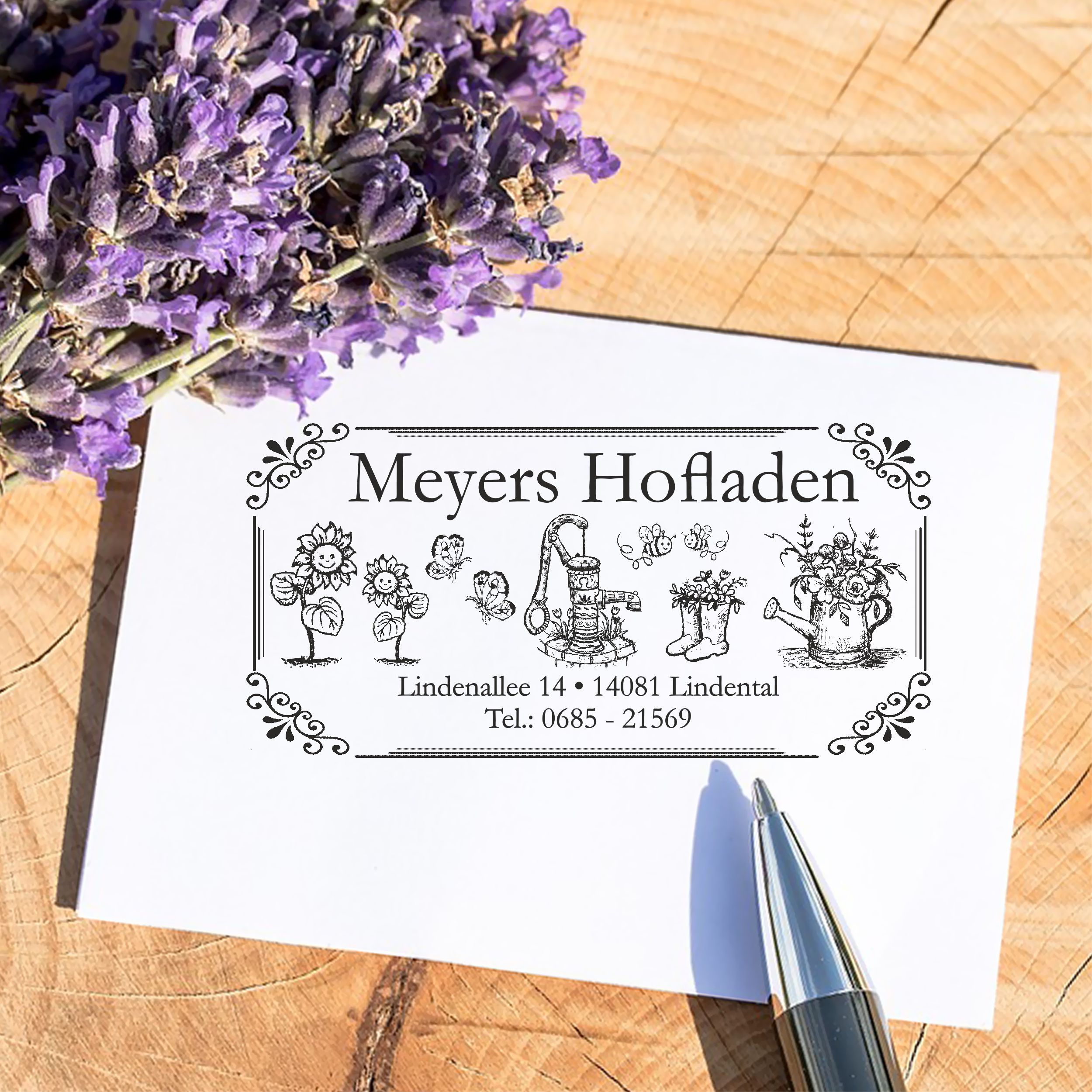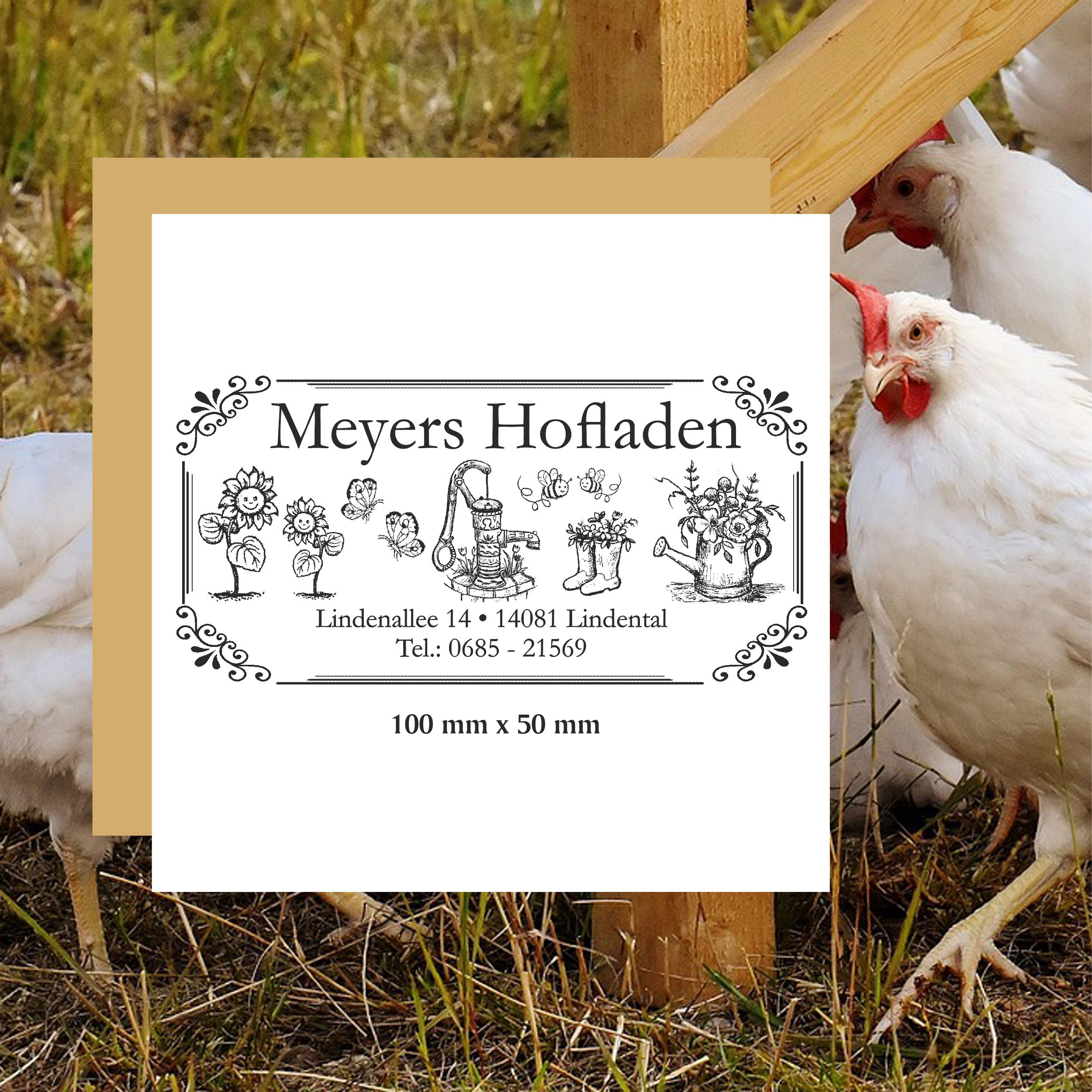 Personalisierter Hofladen Stempel mit Name & Adresse - ländliches Vintage Motiv - Motivstempel Holzstempel 100x50 mm