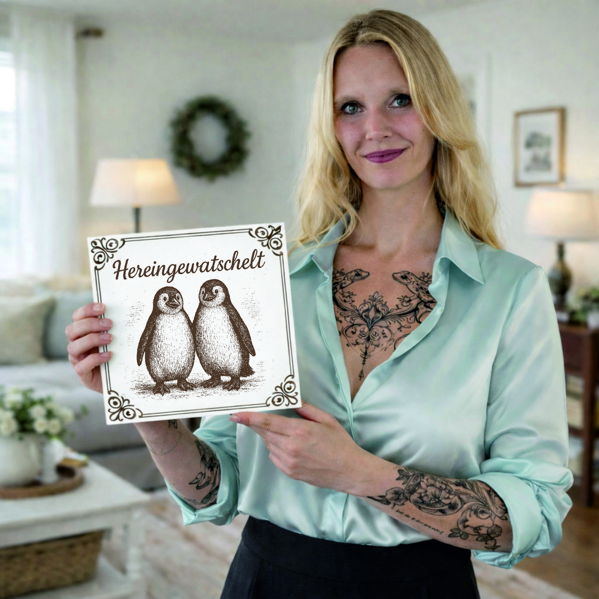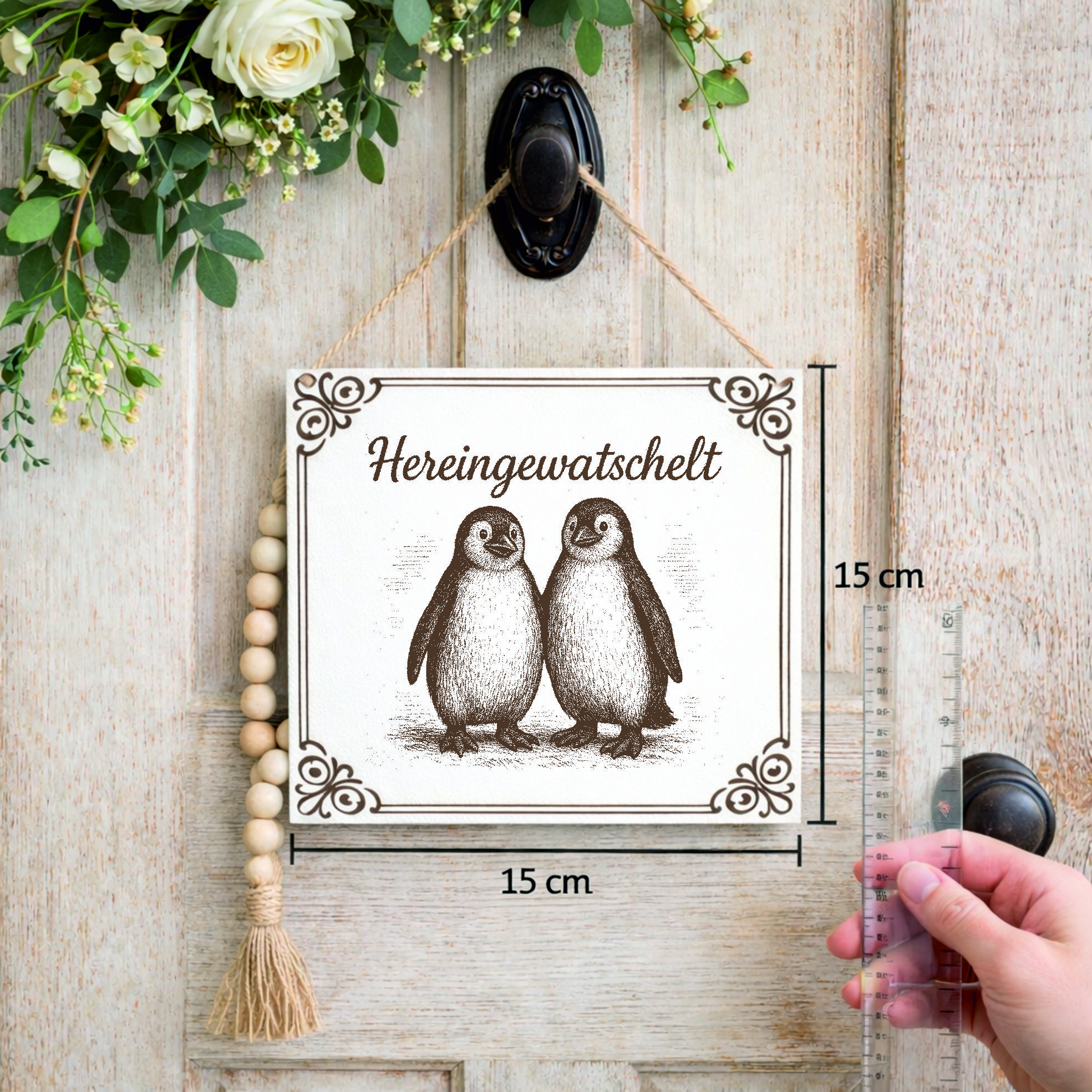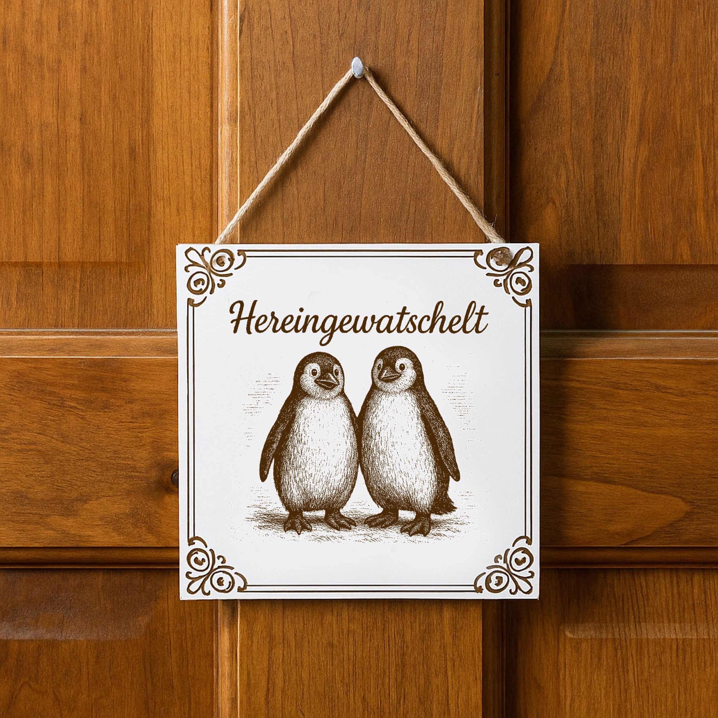 Das niedliche Motiv mit zwei Pinguinen sorgt für eine warme, freundliche Ausstrahlung und bringt Leben in jeden Raum. Der Schriftzug „Hereingewatschelt“ verleiht dem Schild eine besondere Note und macht es zu einem echten Hingucker.