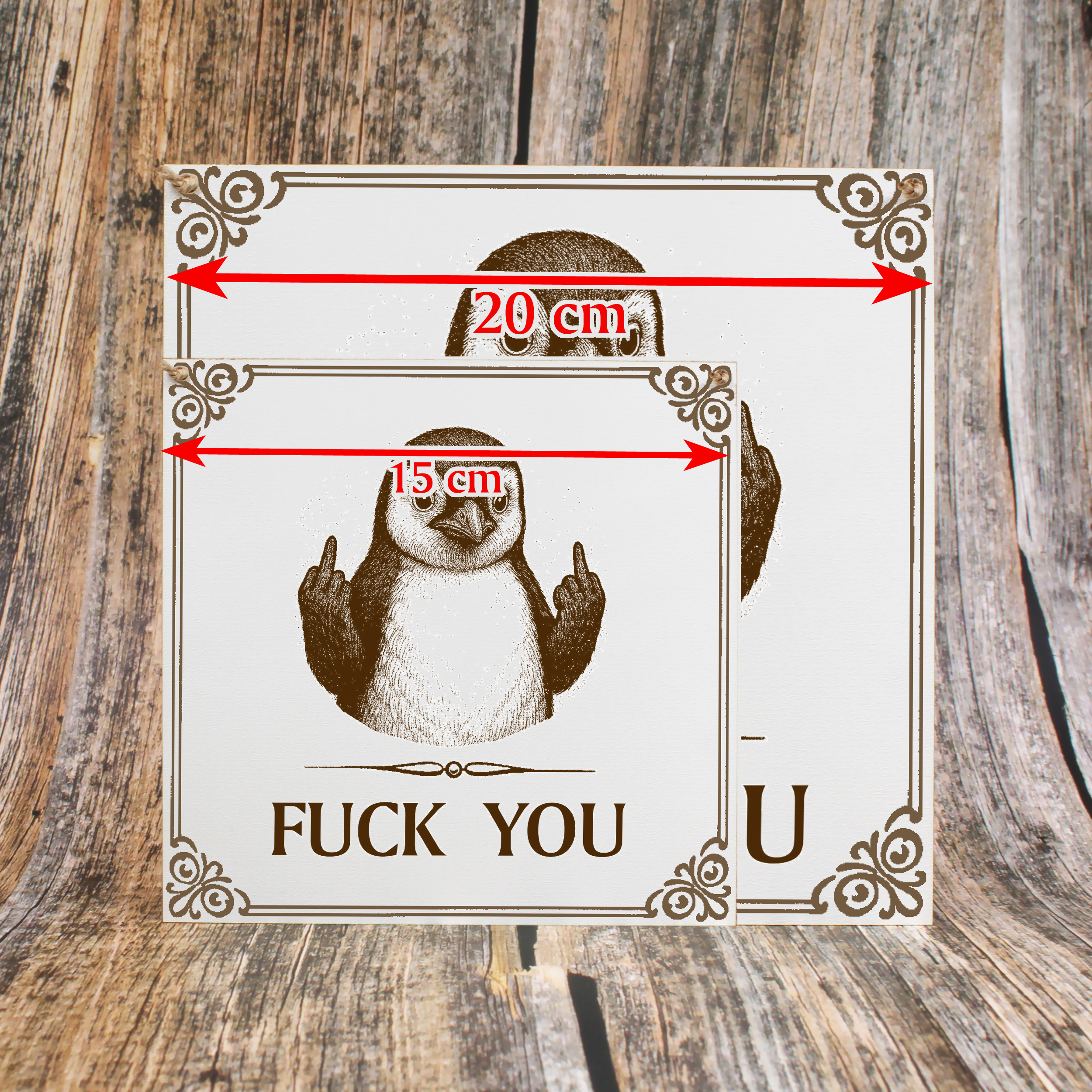 Pinguin Wandschild „Fuck You“ – Weißes HDF-Dekoschild 15×15 cm (auch 20×20 cm)
