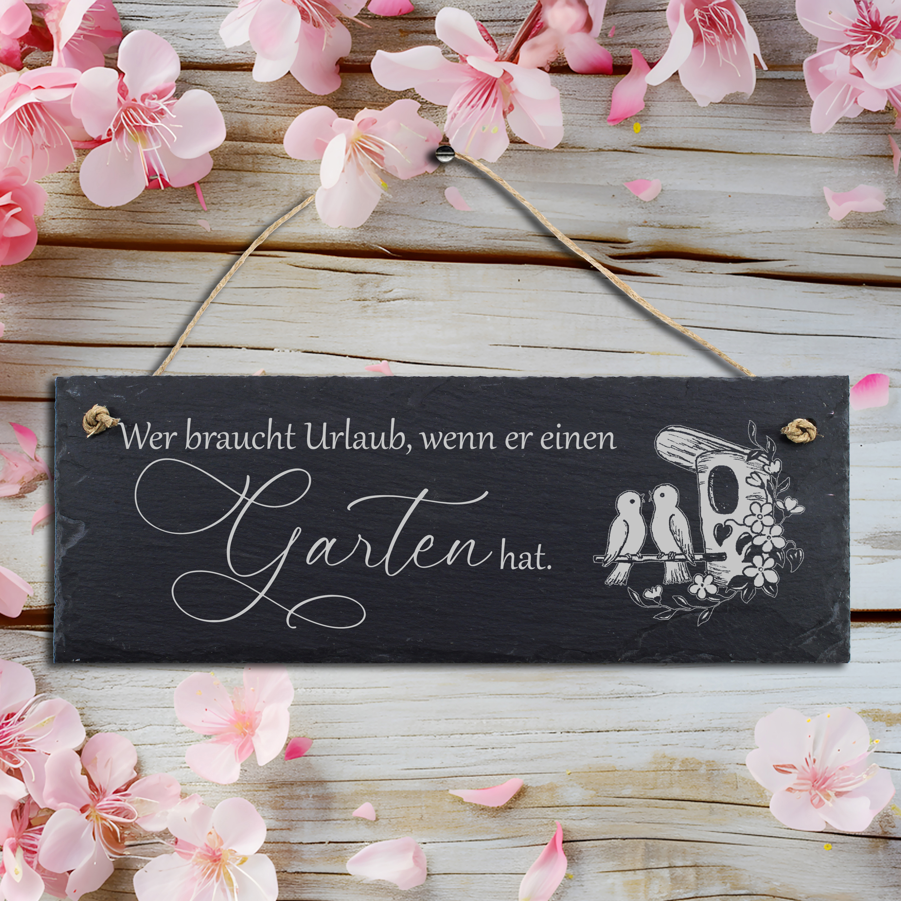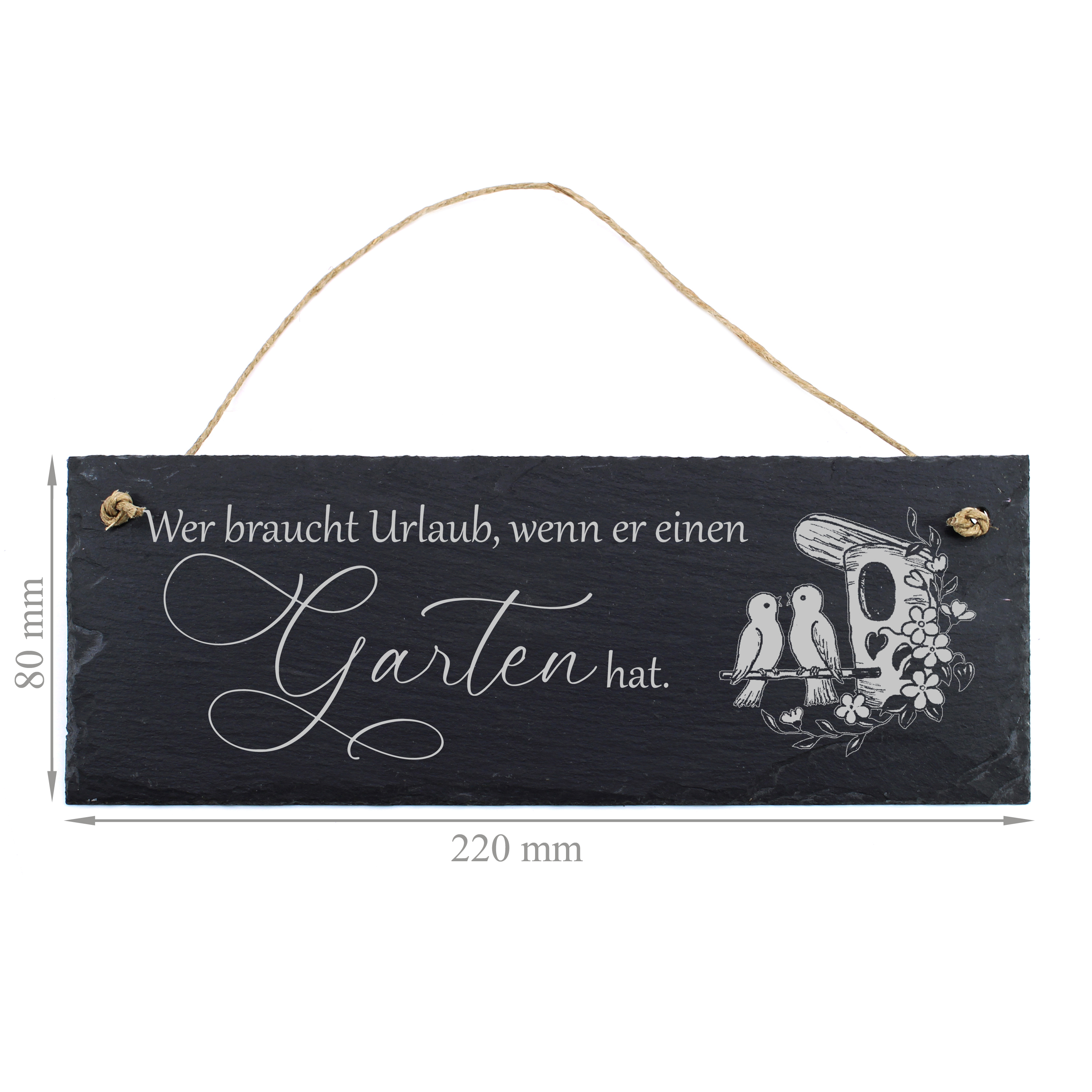 Die hochwertige Gravur hebt sich stilvoll von der dunklen Schieferoberfläche ab und sorgt für eine klare, elegante Optik. Ergänzt wird das Design durch ein liebevolles Motiv mit Vögeln und Vogelhäuschen – perfekt für eine gemütliche Gartenatmosphäre.