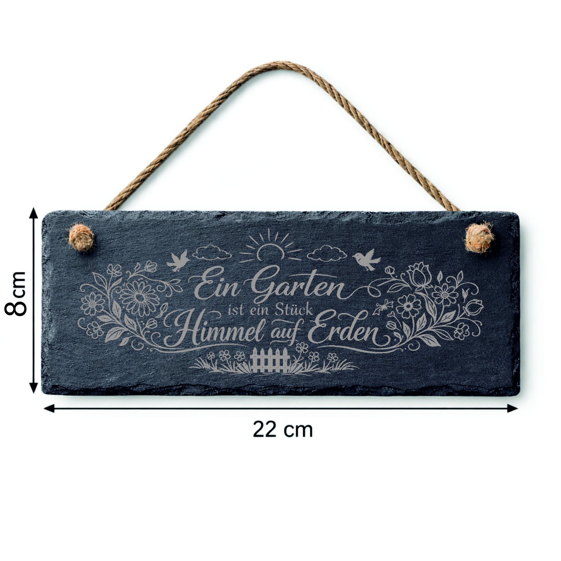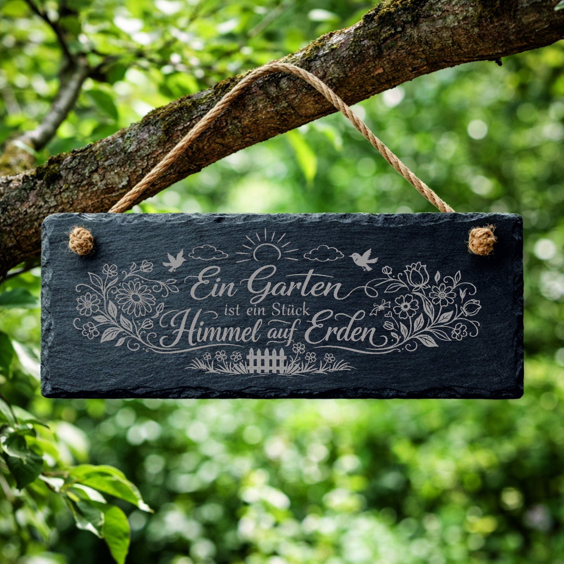 Die liebevolle Gravur mit floralen Elementen, Vögeln, Sonne und Gartenzaun sorgt für eine romantische und natürliche Optik. Dadurch wird das Schild zu einem stilvollen Blickfang im Garten.