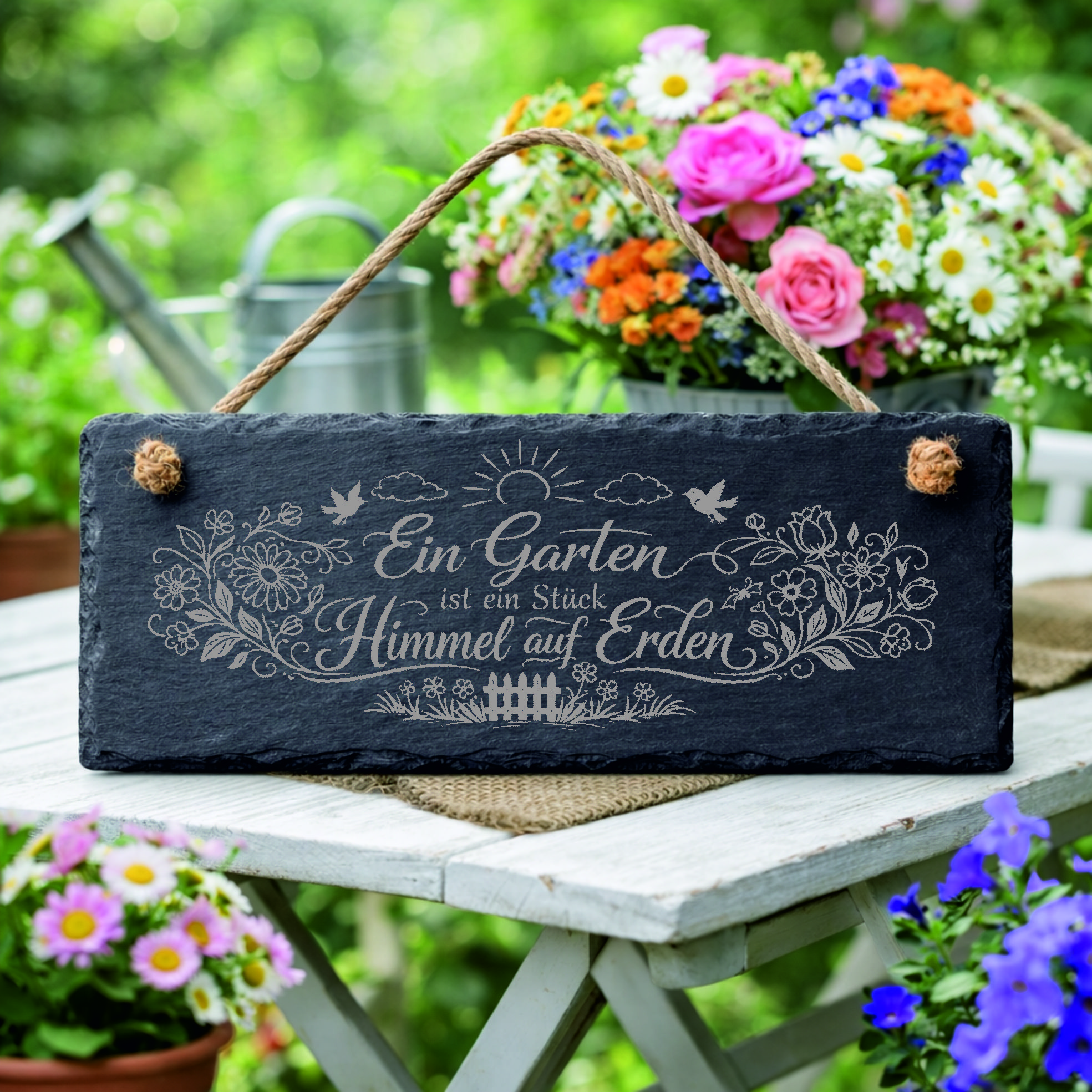Liebevoller Gartenspruch für echte Gartenliebhaber: Das dekorative Schieferschild mit dem Spruch „Ein Garten ist ein Stück Himmel auf Erden“ bringt eine besonders warme und harmonische Atmosphäre in Ihren Garten.