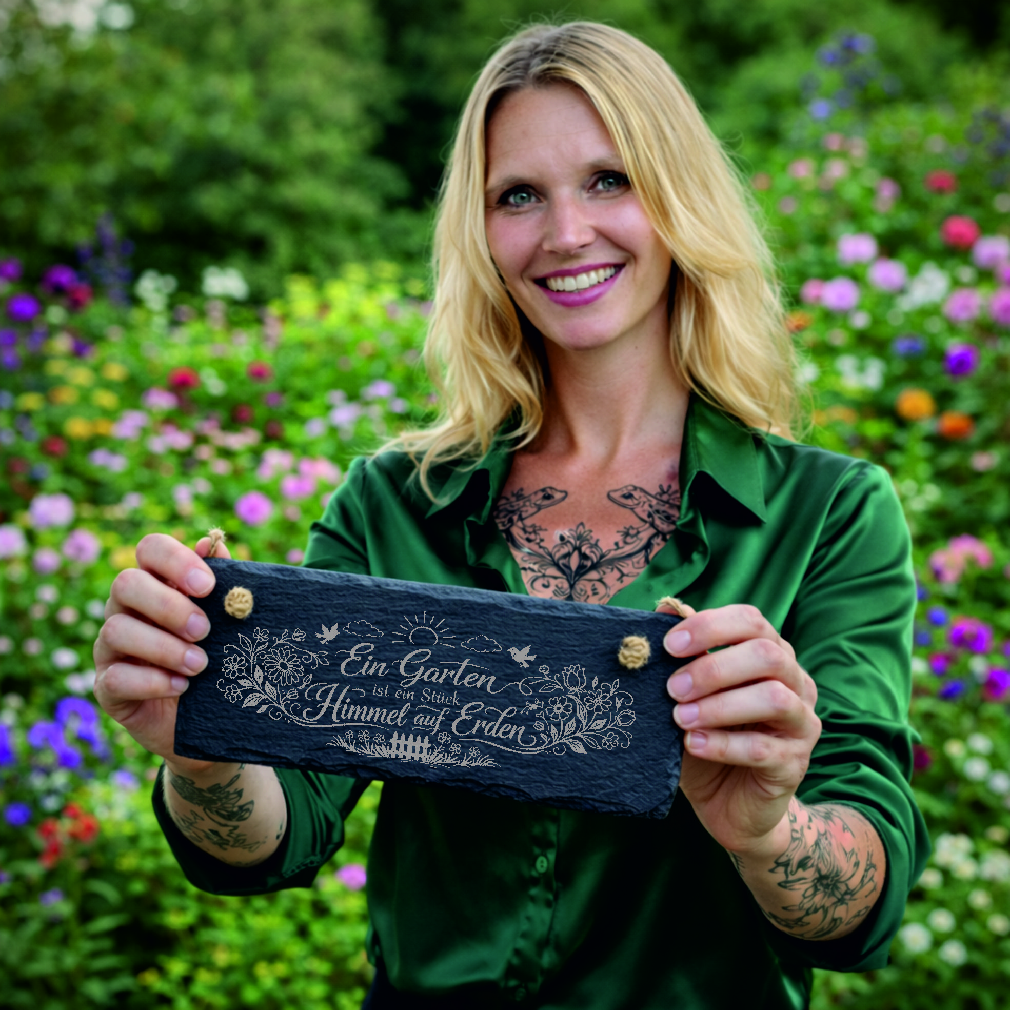 Detailreiche Gravur mit floralen Ornamenten: Die fein gravierte Gestaltung mit Blumen, Vögeln, Sonne und Gartenzaun macht das Schild zu einem stilvollen Blickfang für jede grüne Oase.