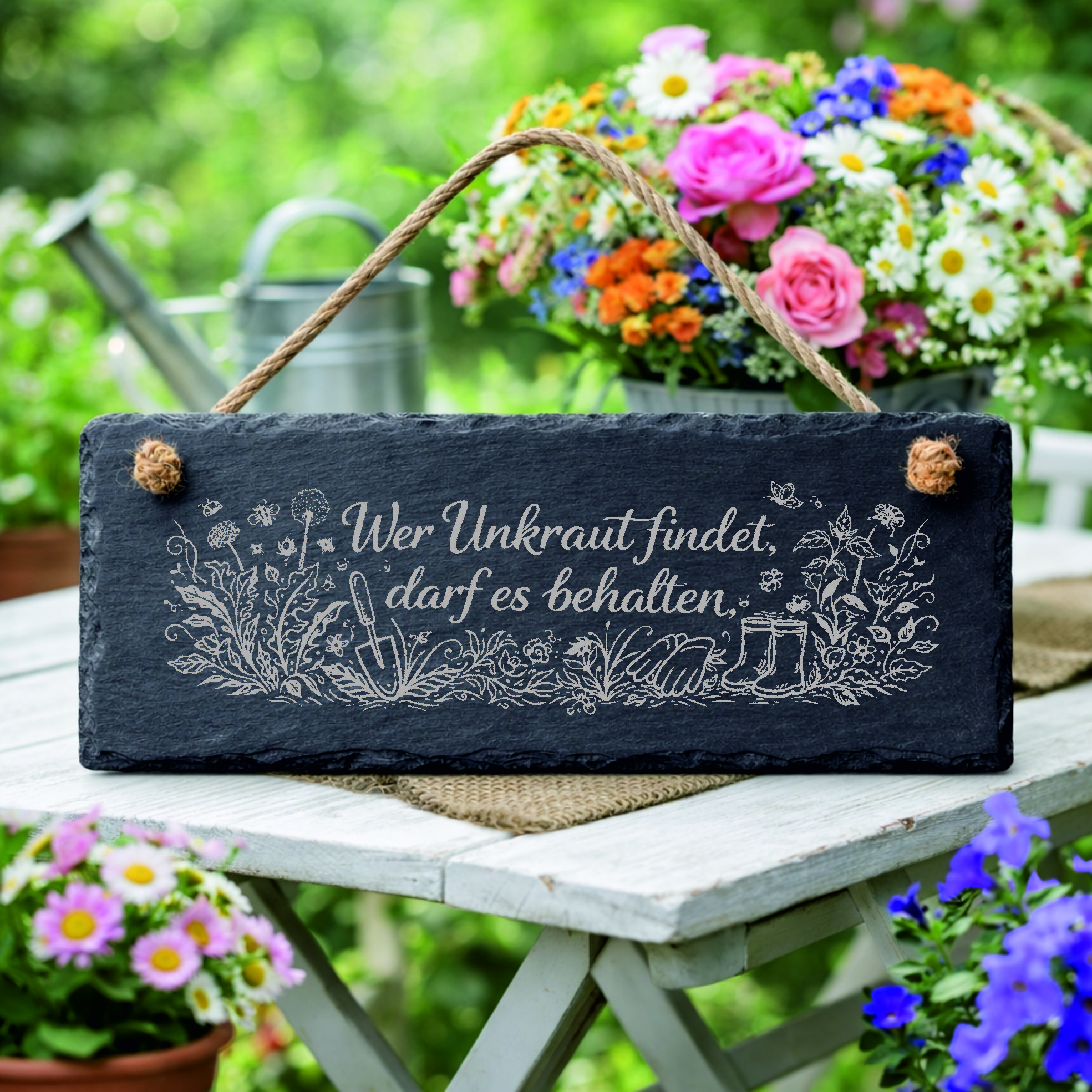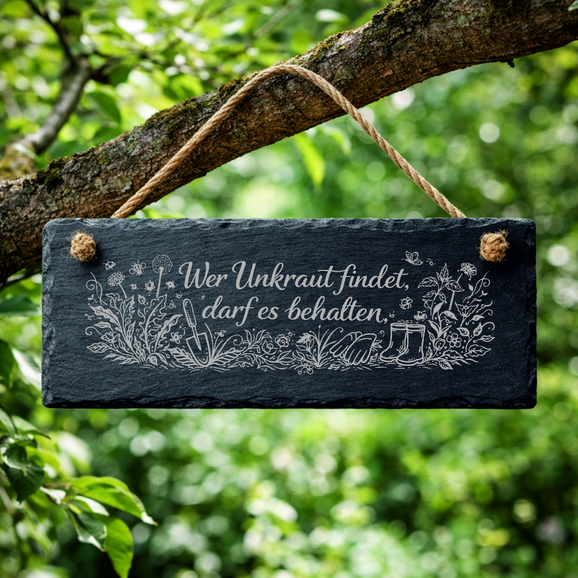 Humorvolles Gartenschild für Gartenliebhaber: Das dekorative Schieferschild mit dem Spruch „Wer Unkraut findet, darf es behalten“ sorgt garantiert für ein Schmunzeln und bringt Humor in jede grüne Oase.