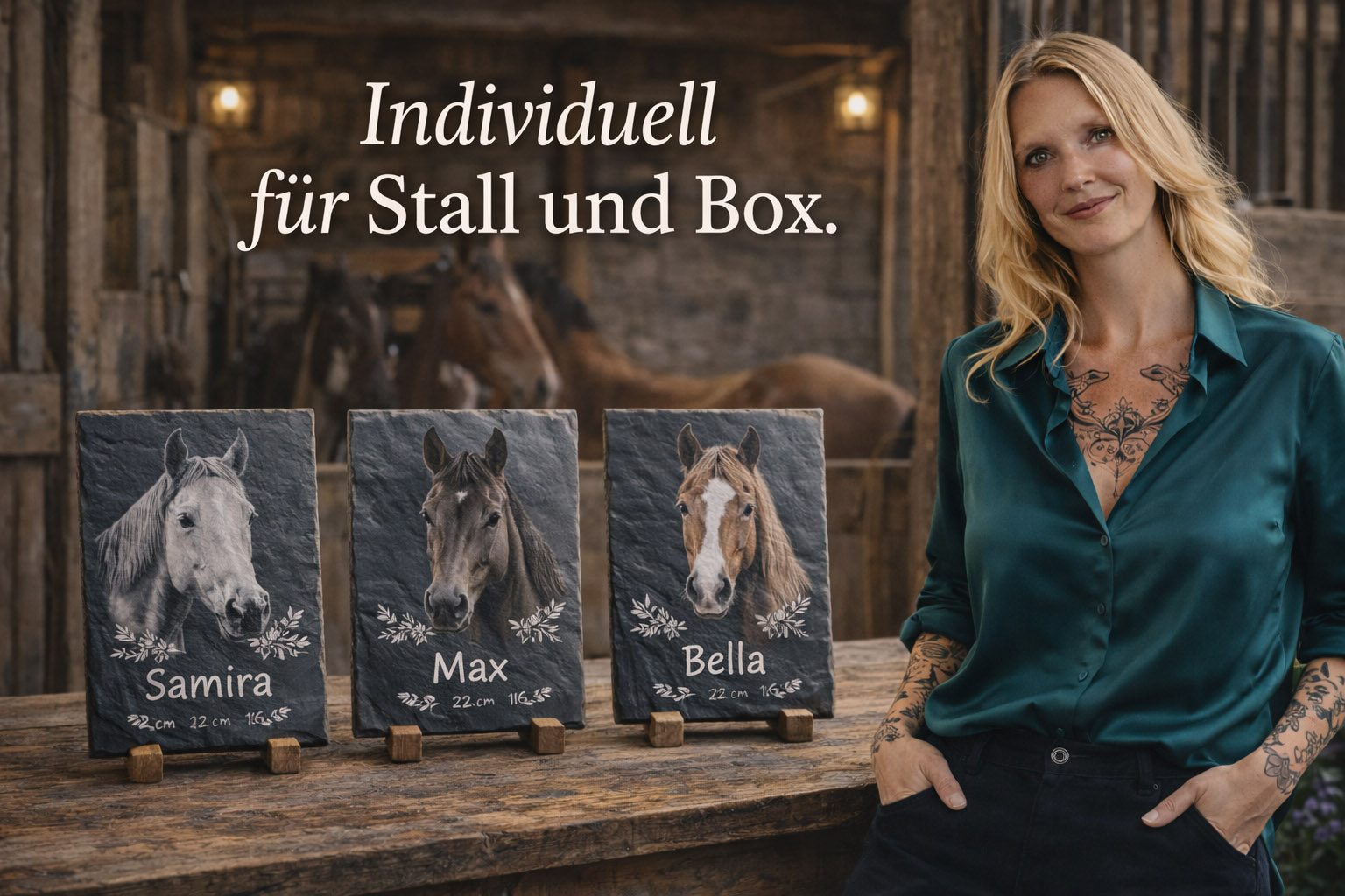 Die detailreichen Gravurmotiven werden sorgfältig in den Schiefer eingearbeitet und sorgen für eine elegante und gut sichtbare Darstellung. Dadurch eignen sich die Tafeln hervorragend als Namensschild für Ihr Pferd, als dekorative Stalltafel oder als informative Kennzeichnung im Stallbereich.
