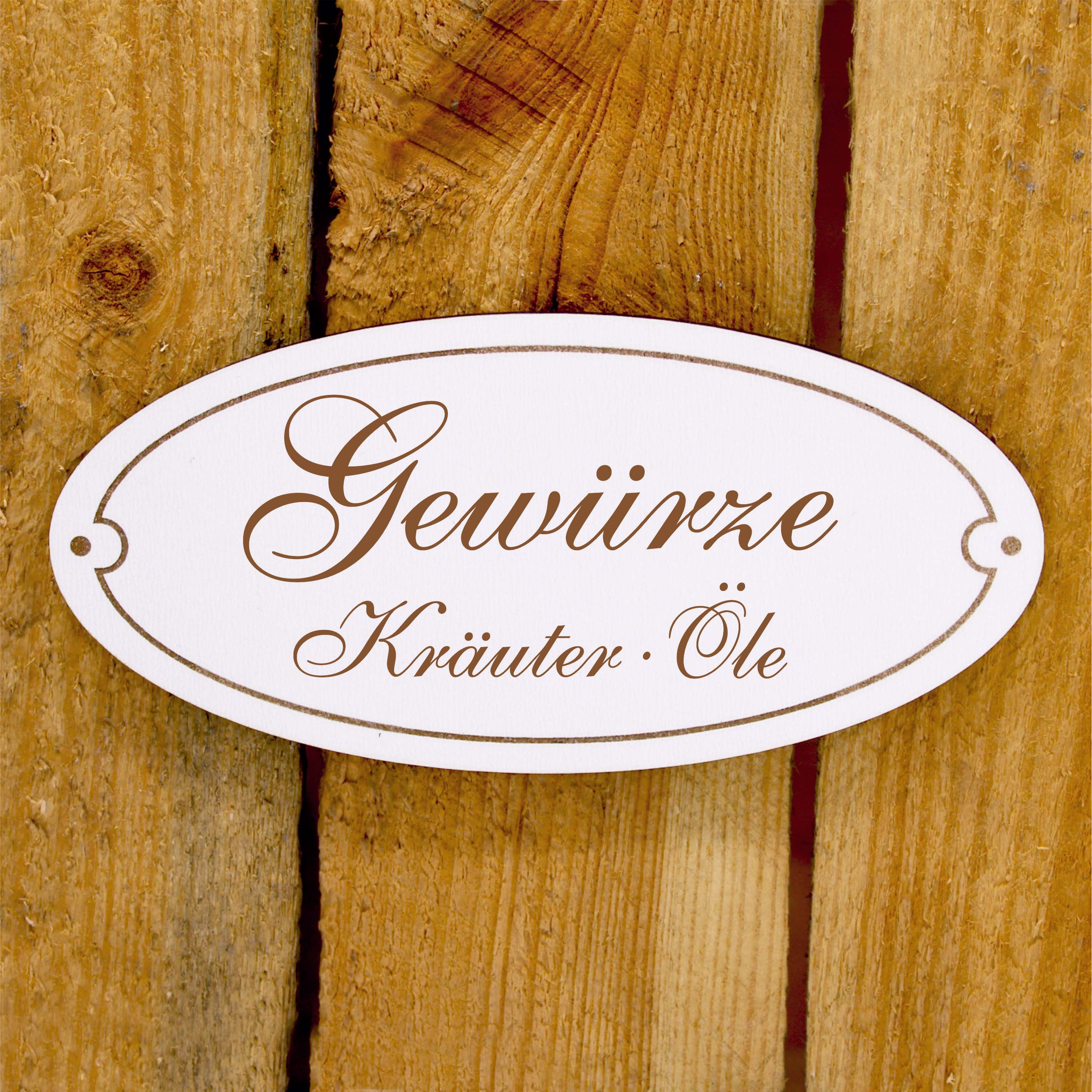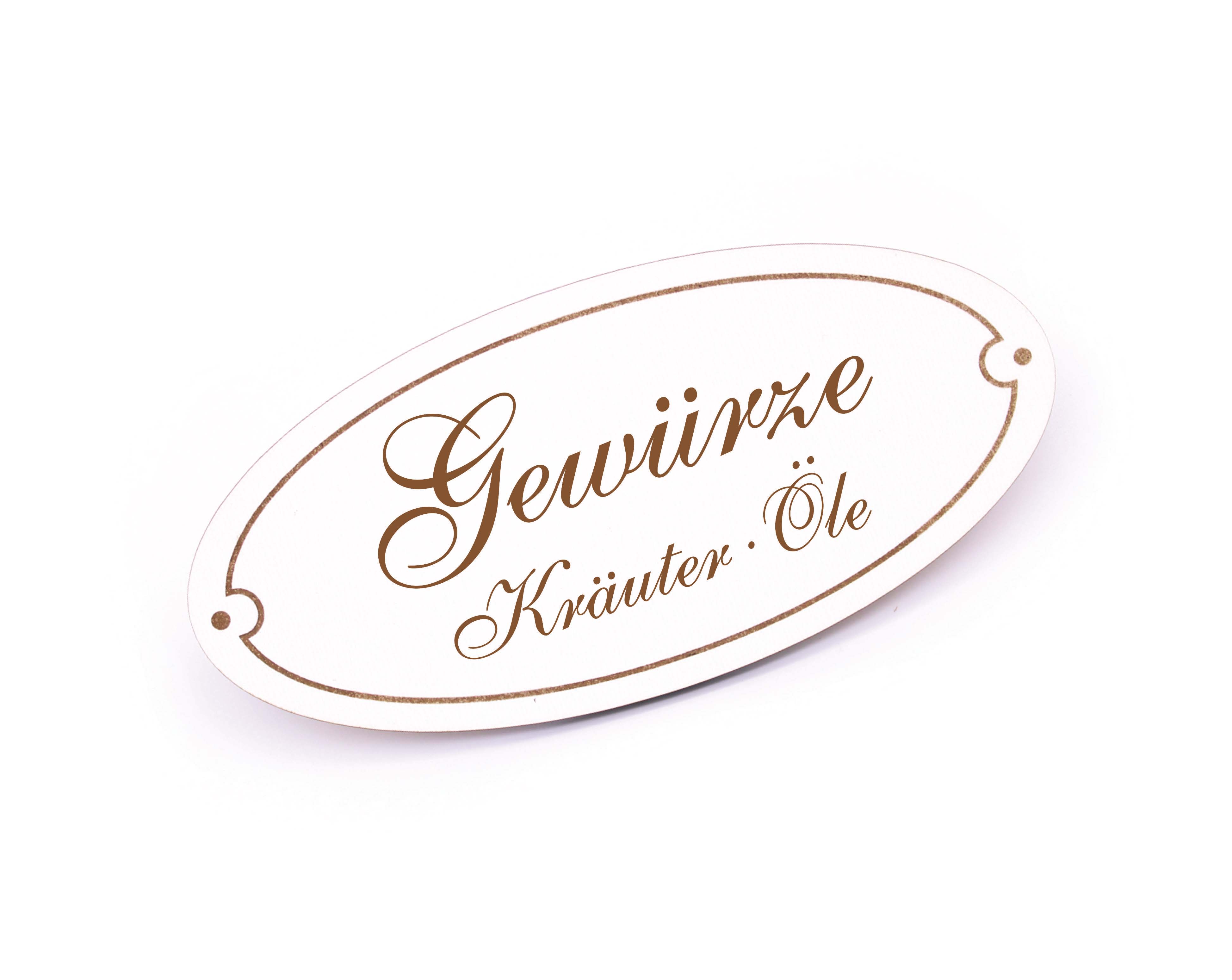 Schild Gewürze Kräuter Öle - Küchenschild oval Küchendeko Holzschild Gravur selbstklebend 15 x 7 cm