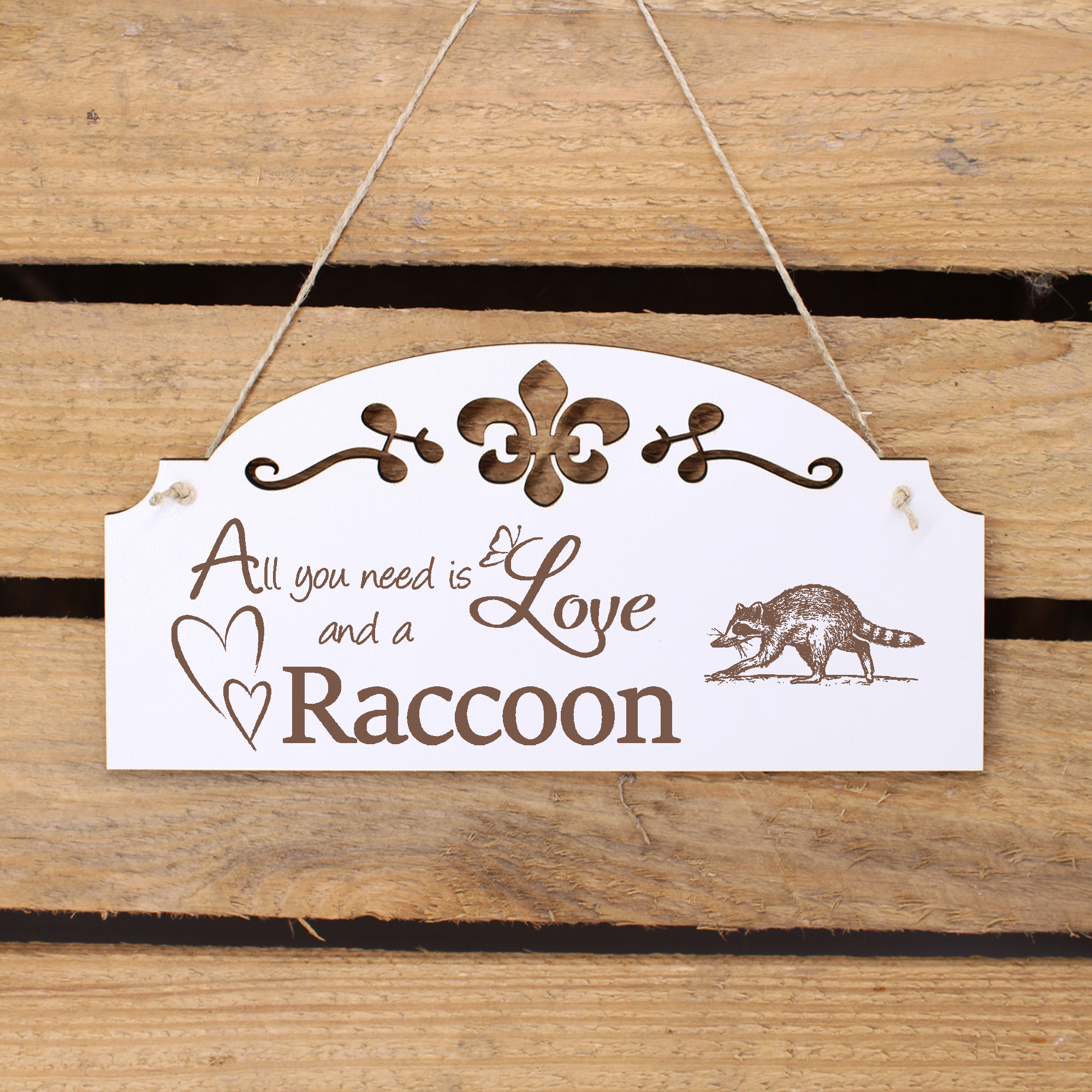 - WANDDEKO: schöne Dekoration im Retro oder Vintage Stil mit dem Spruch - All you need is Love and a Raccoon - die Türdeko ist nicht nur lustig, sondern auch modern