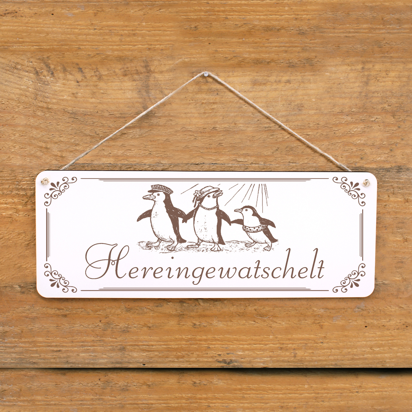 Schild mit Gravur Hereingewatschelt Sommer Pinguin Familie - Dekoschild Vintage Türschild 20 x 7,5