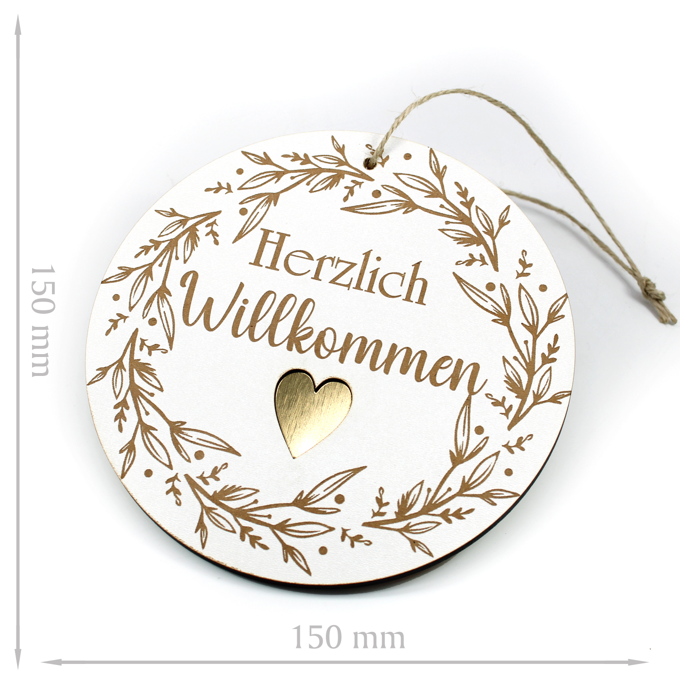Produktinformationen "Schild rund Herzlich Willkommen mit Motiv Vintage Kranz und goldfarbenem Herz Ornament Ø 15 cm"