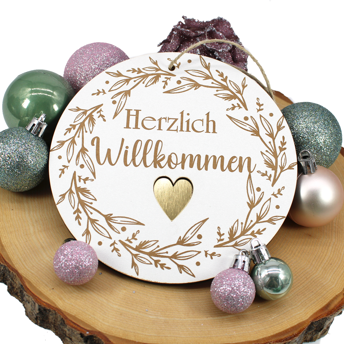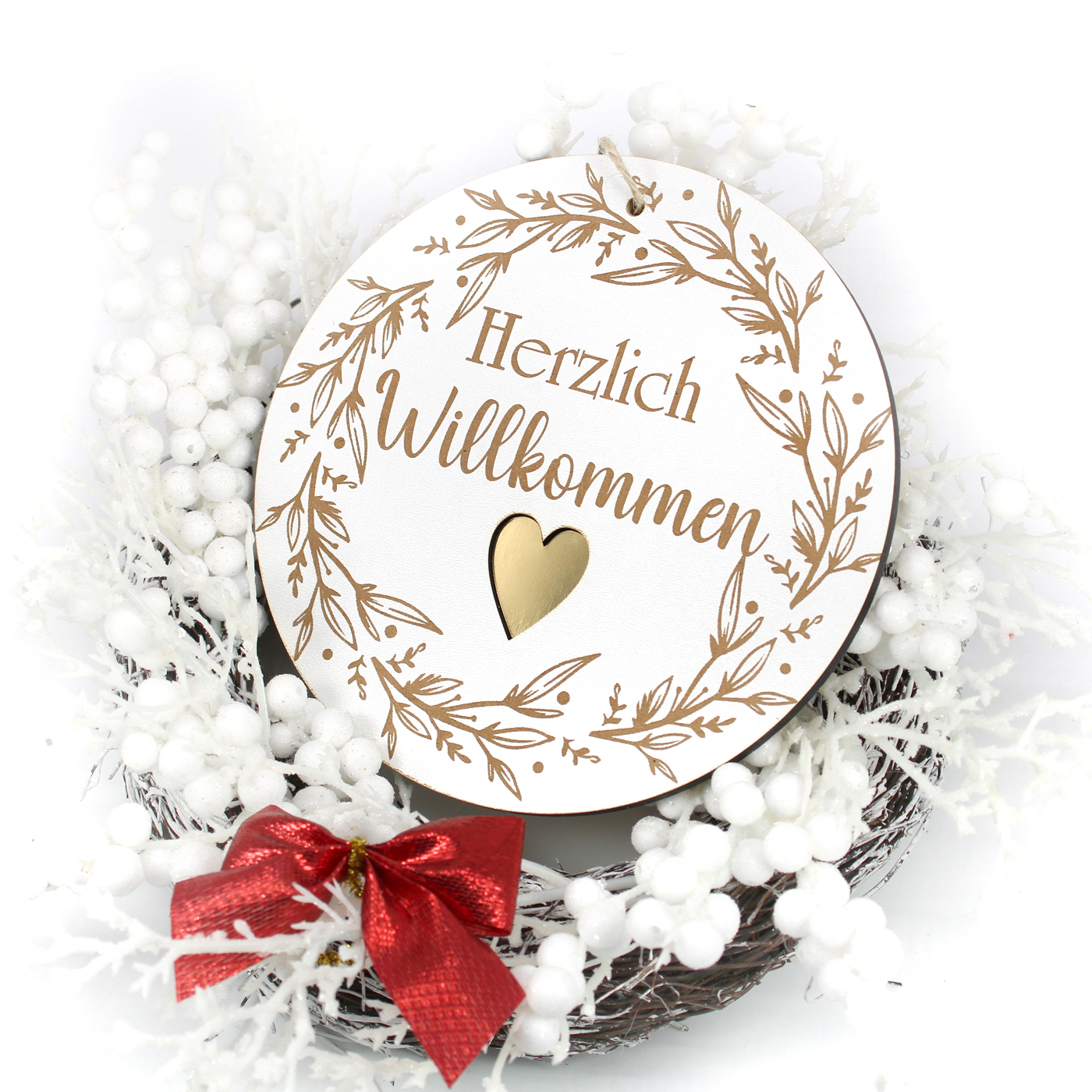 Weihnachtsschild aus weiß beschichtetem HDF mit Gravur “Herzlich Willkommen”