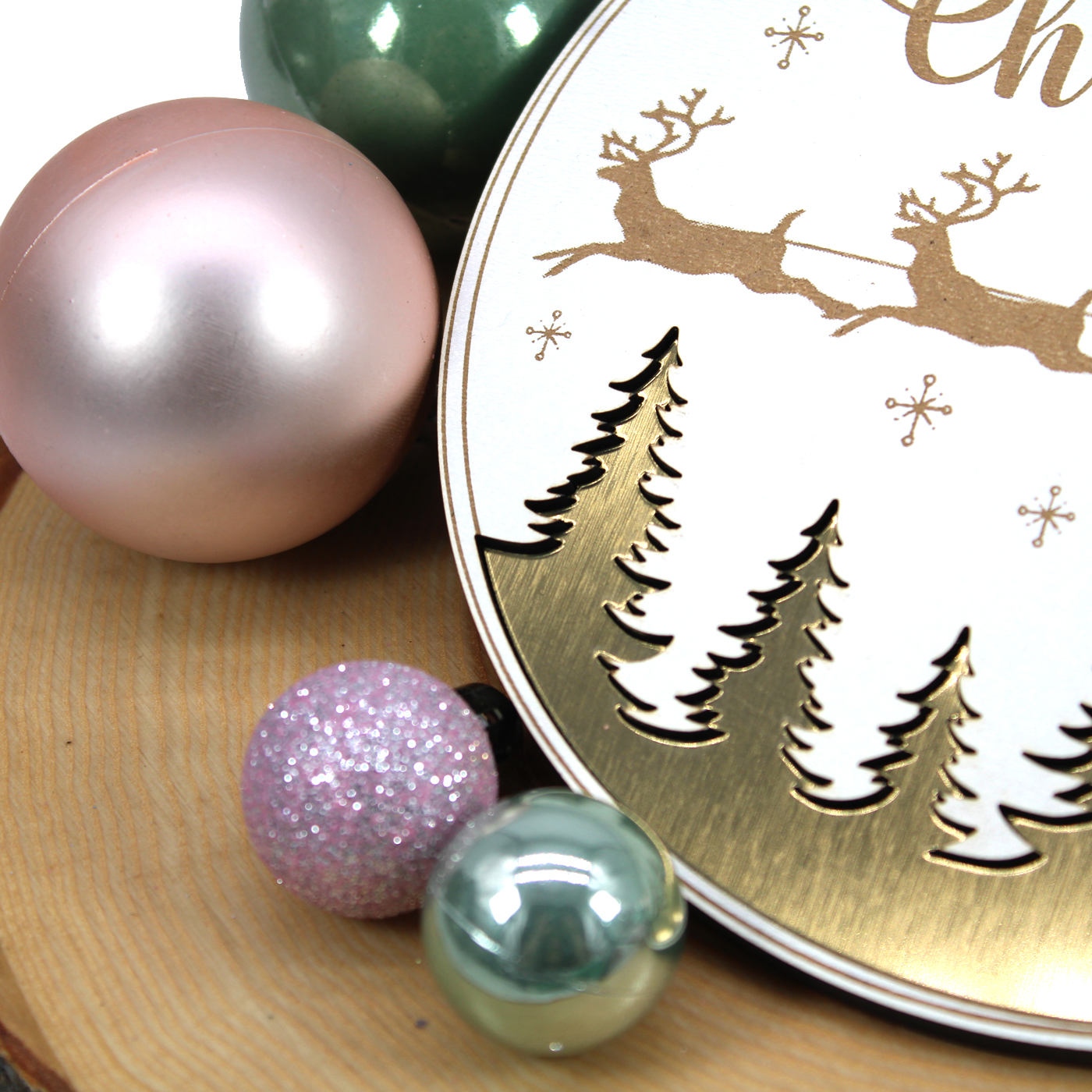 robustem, weiß beschichtetem HDF mit Gravur “Merry Christmas” und Motiv Hirsche