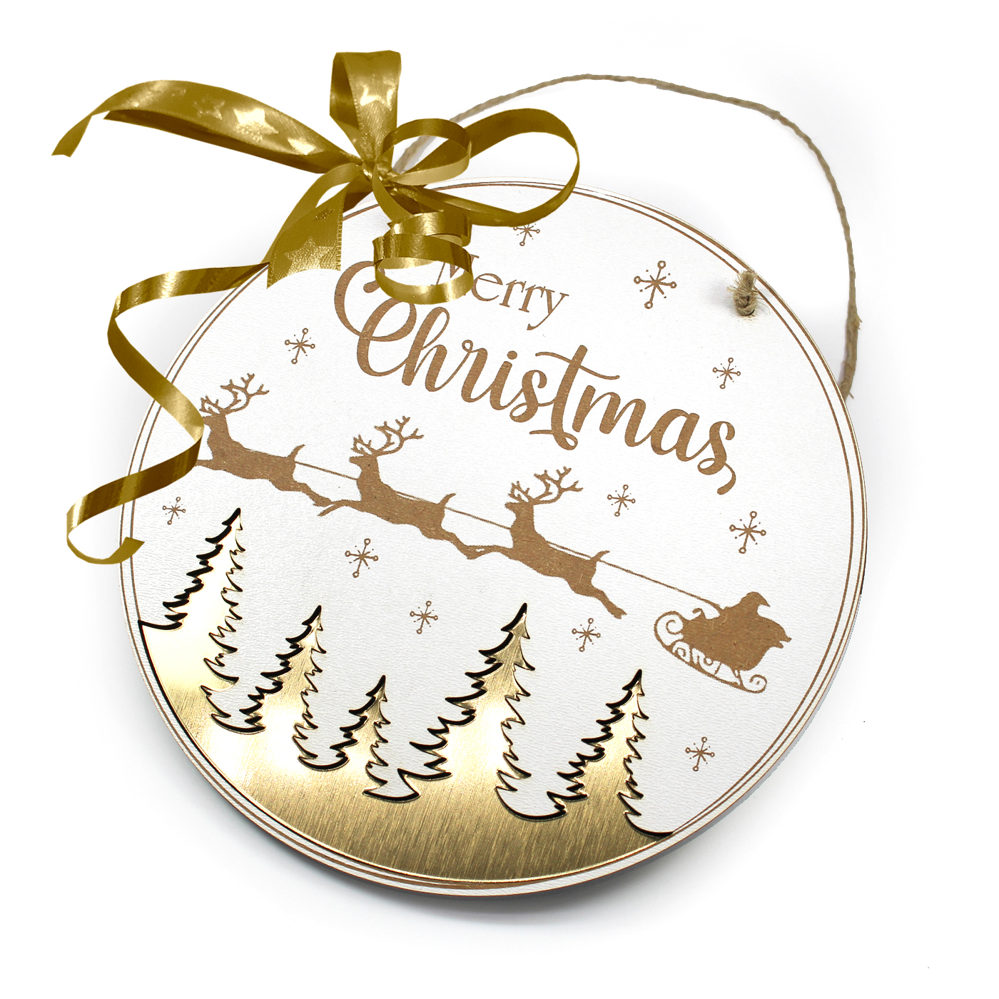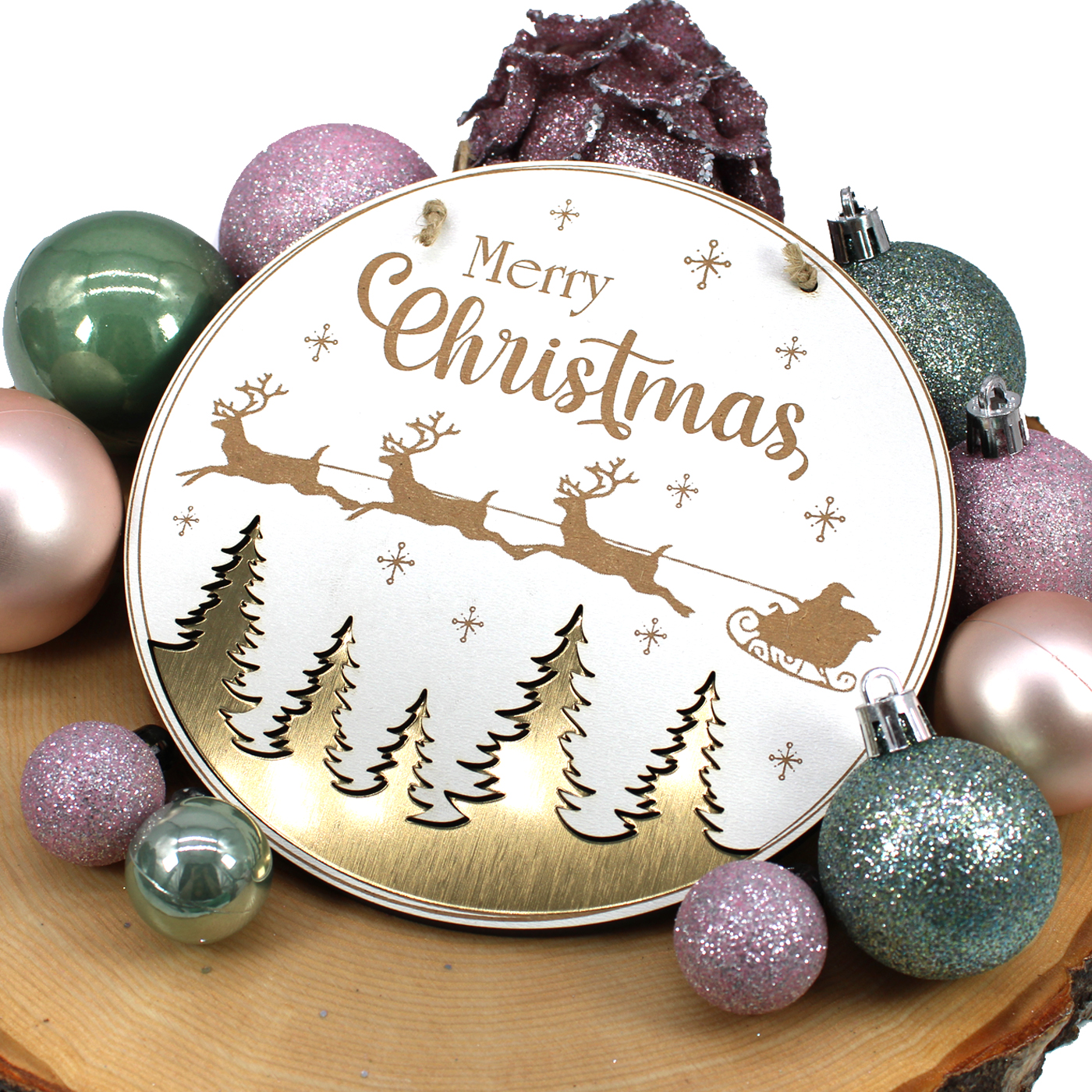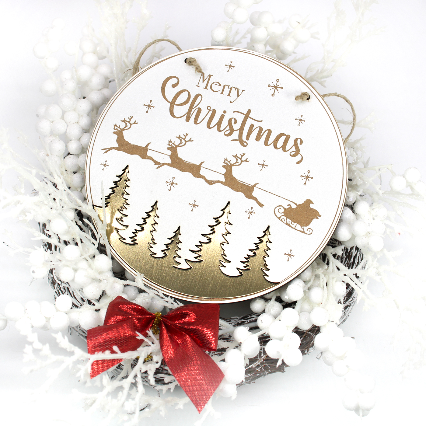 Weihnachtsschild aus weiß beschichtetem HDF mit Gravur “Merry Christmas” ist