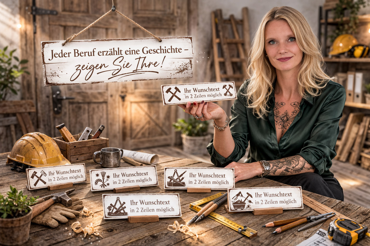 Jedes Schild kann individuell mit Ihrem Wunschtext gestaltet werden. In der Regel sind zwei Zeilen möglich, sodass sowohl eine Berufsbezeichnung als auch ein Name oder eine kurze Ergänzung Platz finden. Ergänzt wird das Design durch passende Berufssymbole, die das jeweilige Handwerk optisch unterstreichen und dem Schild einen besonderen Charakter verleihen.