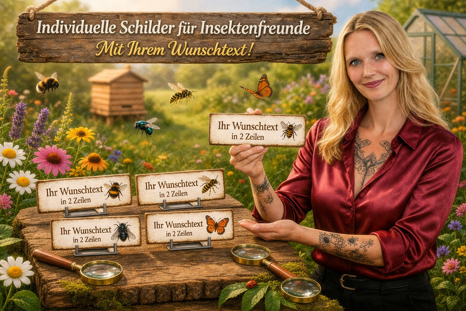 Die weiße Oberfläche des HDF-Materials sorgt für eine helle und freundliche Optik, während die braune Gravur einen warmen Kontrast bildet. Dadurch kommen sowohl die Insektenmotive als auch der Text besonders gut zur Geltung. Zu den Motiven gehören verschiedene Insekten wie Schmetterlinge, Bienen, Käfer, Libellen oder andere kleine Krabbel- und Flugtiere aus der Natur. Die Motive werden mit feinen Linien präzise in das Material graviert und verleihen dem Schild eine detailreiche und langlebige Darstellung.