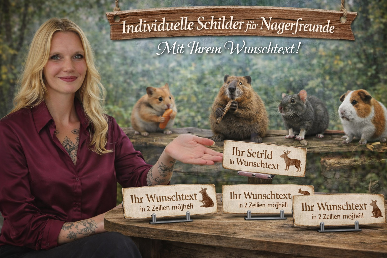 Durch das kompakte Format von 15 × 5 cm eignet sich das Schild ideal als kleines Türschild, als Beschriftung für Tierbereiche oder als dekoratives Element im Regal. Auch als Geschenk für Nagetierhalter und Tierfreunde ist es eine schöne und persönliche Idee.